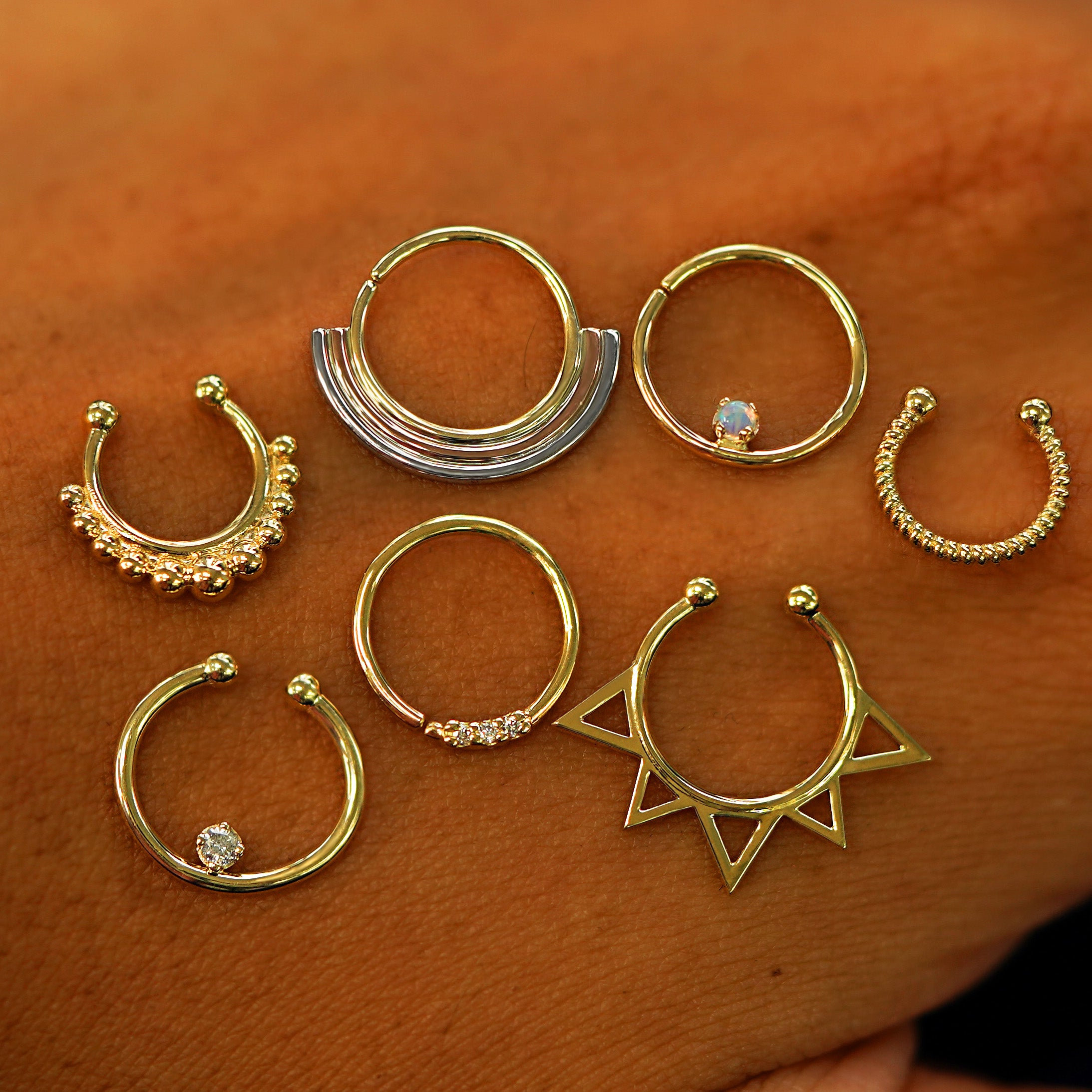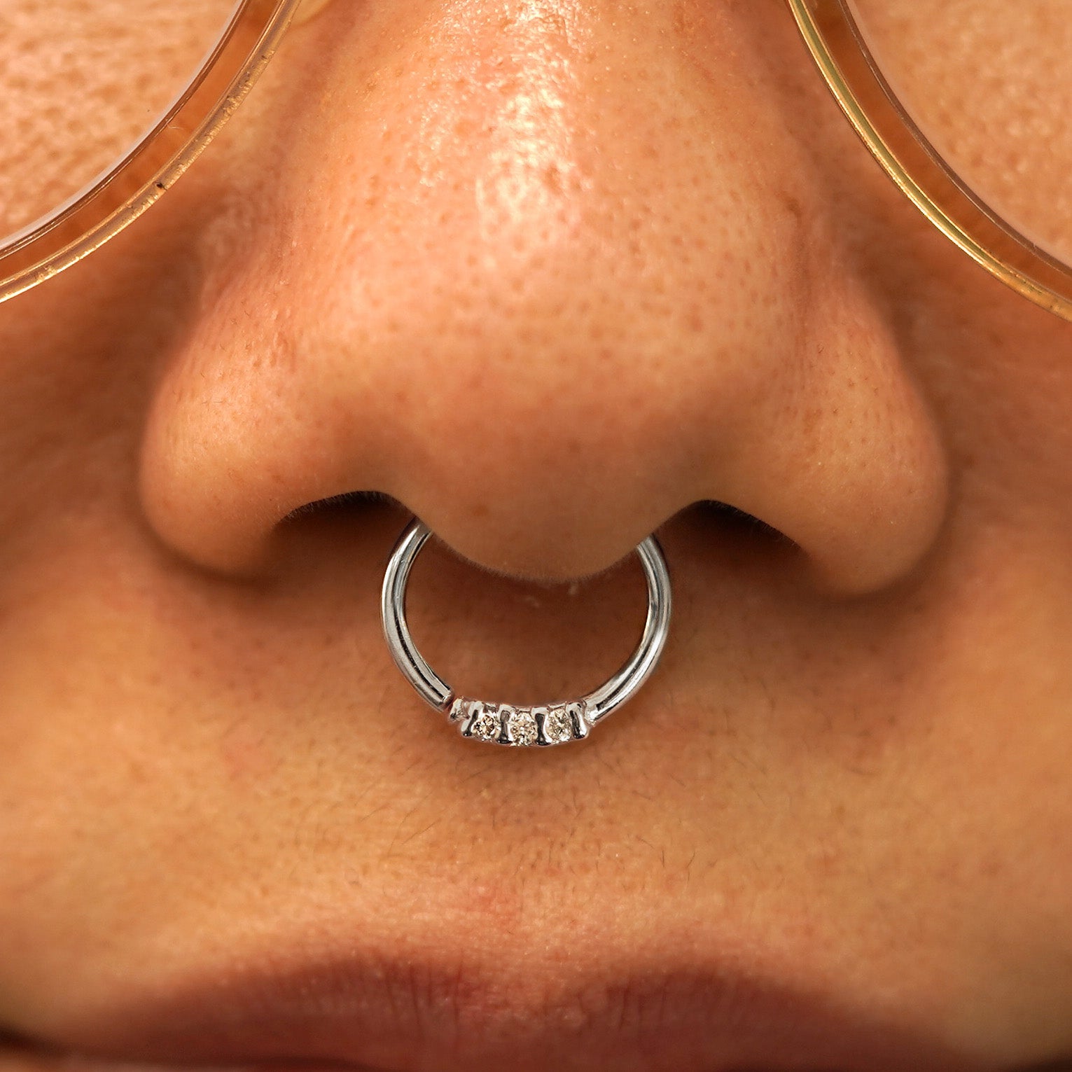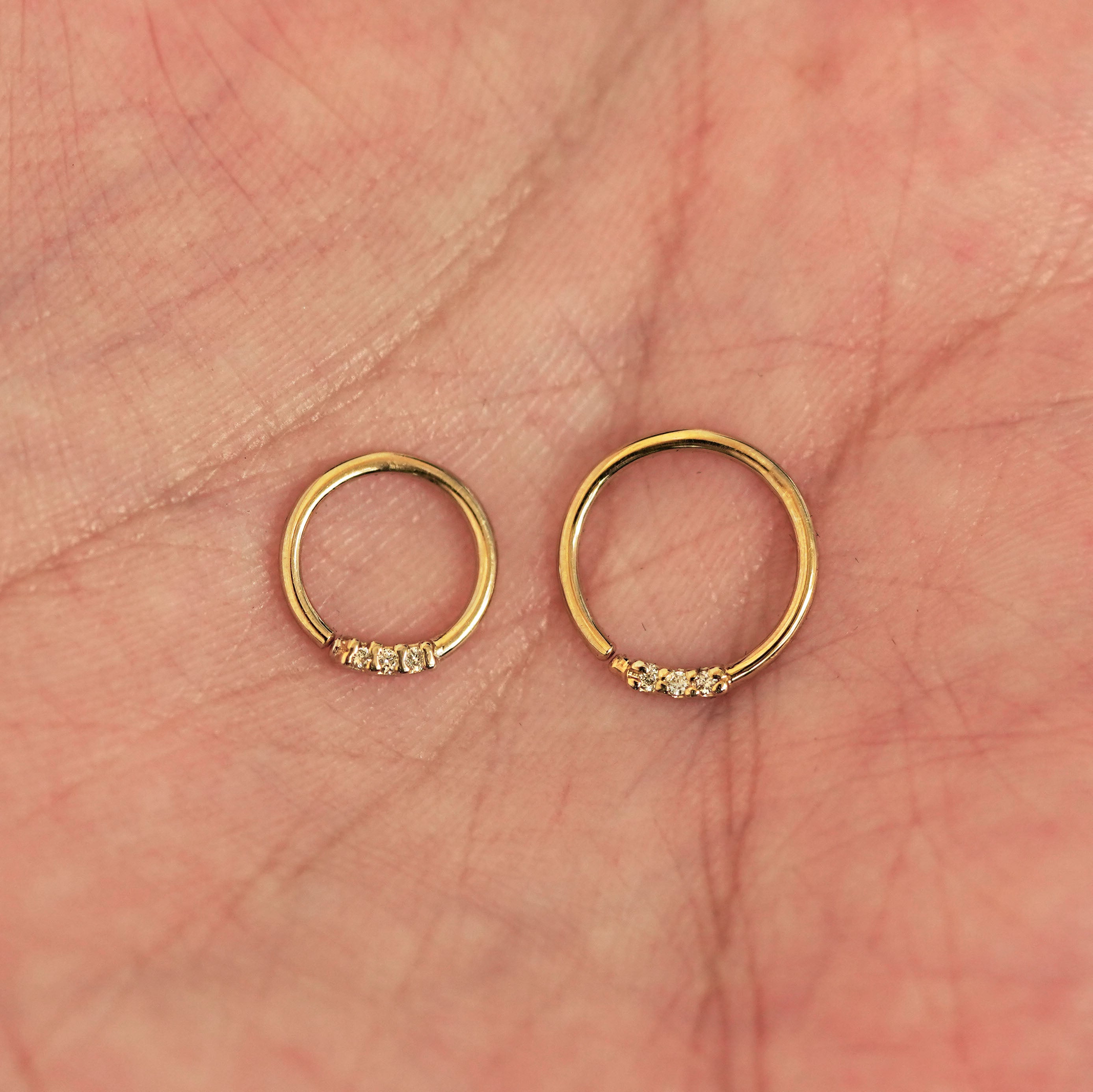 Three gems are better than one! This triple-diamond septum ring is the perfect little hint of glam. 3 sparkling reclaimed diamonds are pavé set into a recycled 14k solid gold septum ring. Wear this seamless septum ring as an earring or in a daith, cartilage, or other piercing.