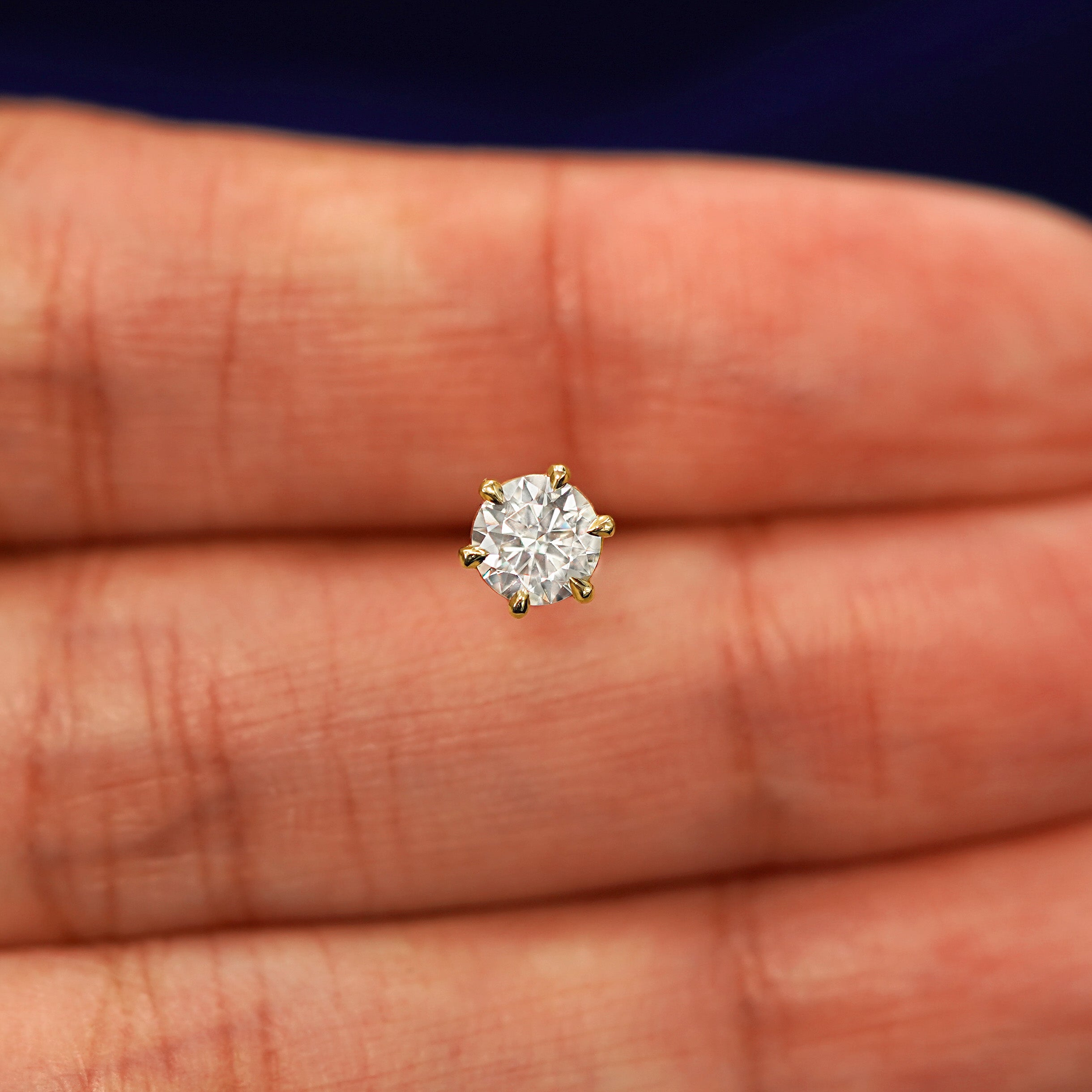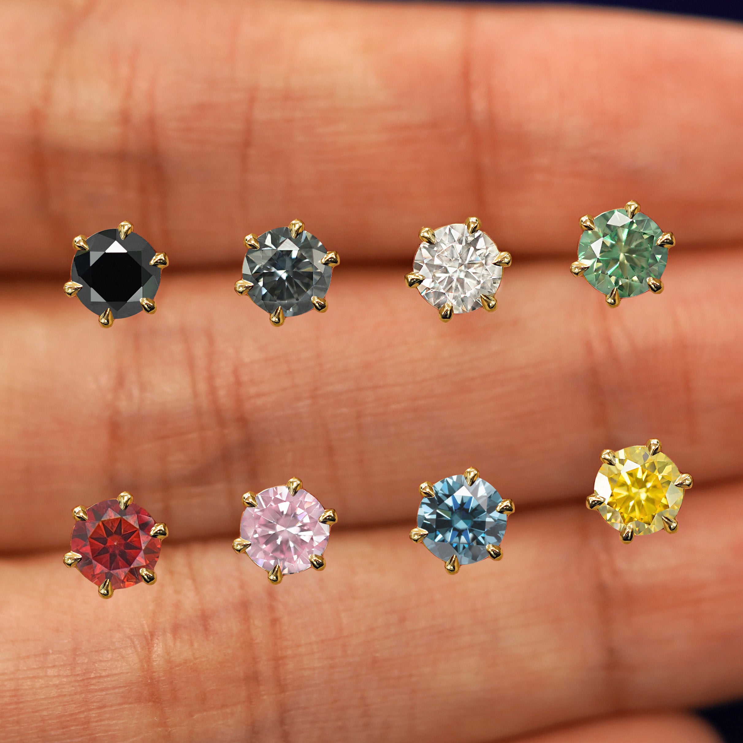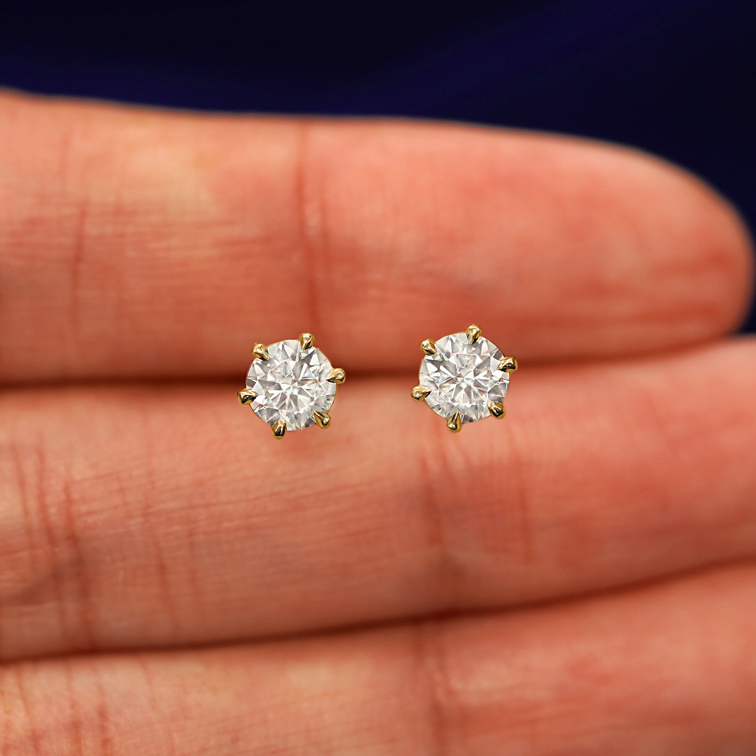 Strong, sparkling, and simply stunning, this moissanite stud earring is the perfect addition to any wardrobe. Second only to Diamond in hardness, moissanite is a durable and substantial stone made to be worn all day, every day. The large round 5mm gemstone sits in a 6-prong setting on a solid 14k gold earring for strength and style.