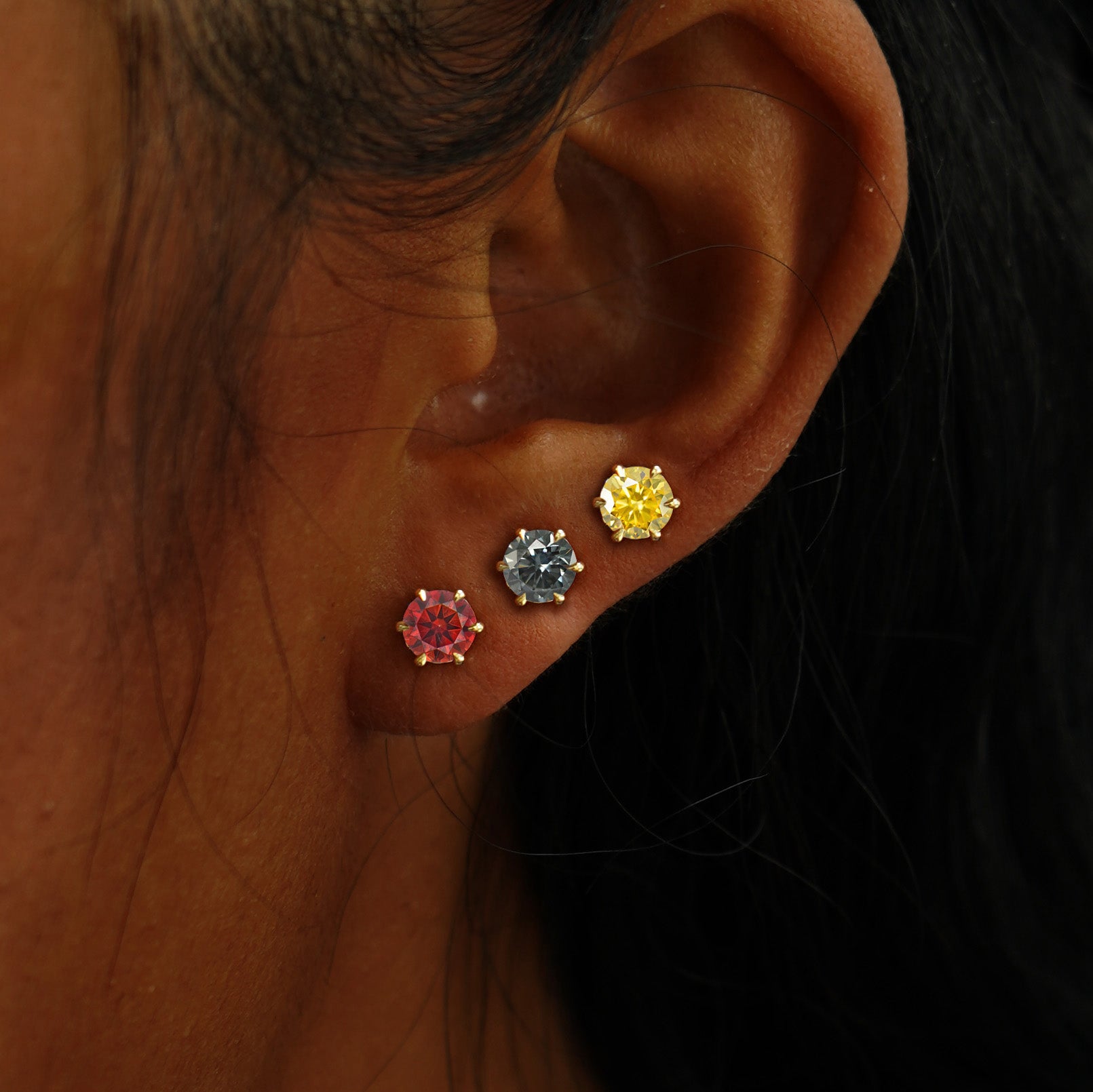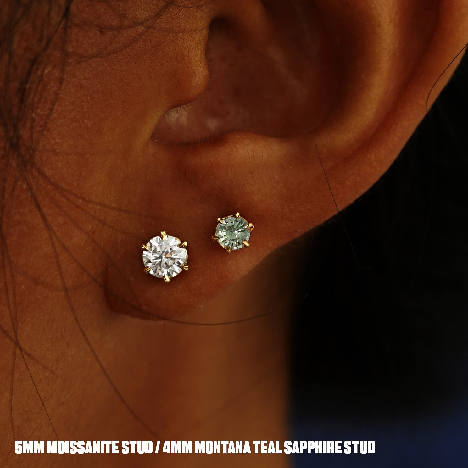 Get this earring in multiple colors or pair it with our 4mm Teal Montana Sapphire Earring or our 3mm Moissanite Earring for a cool ear stack or asymmetrical look.