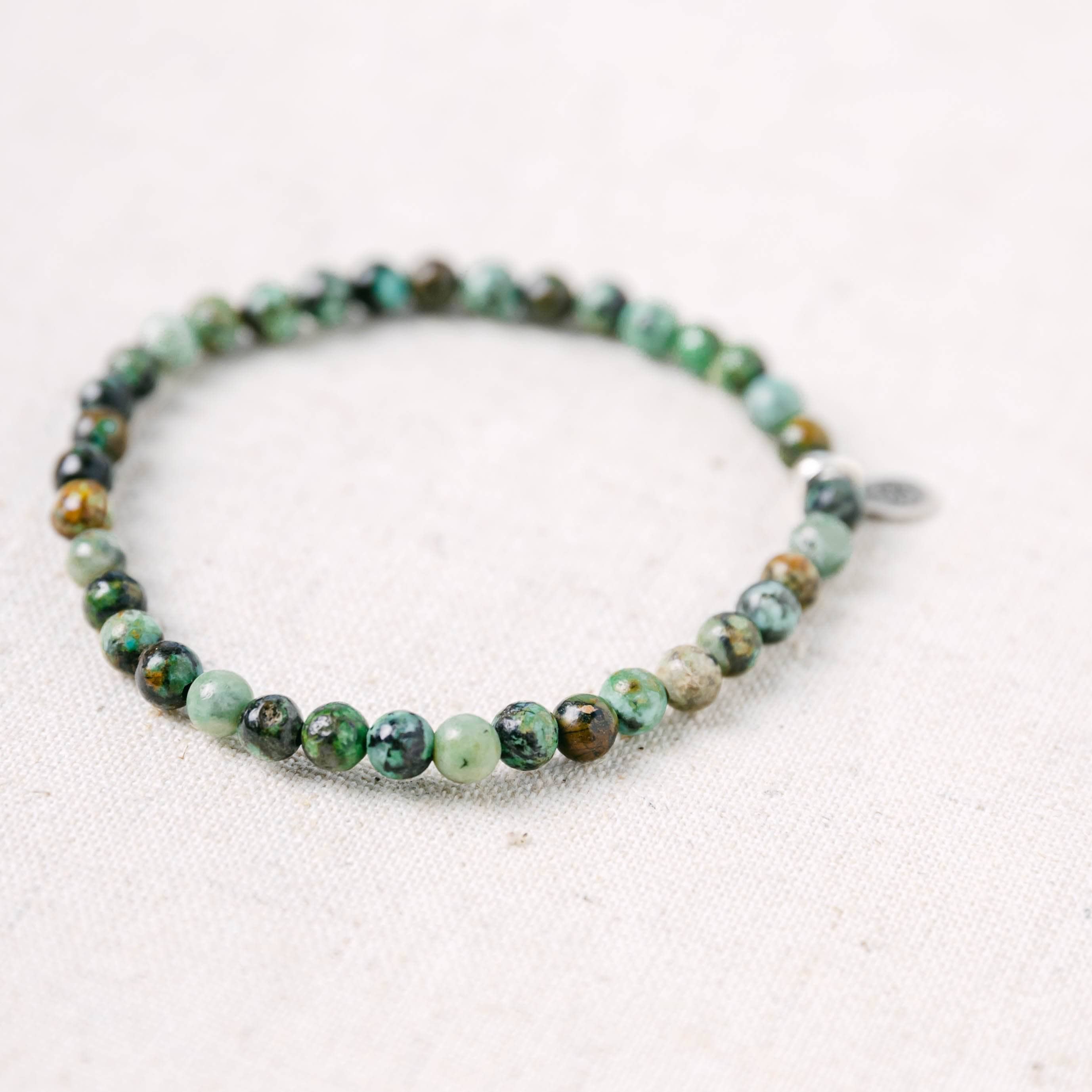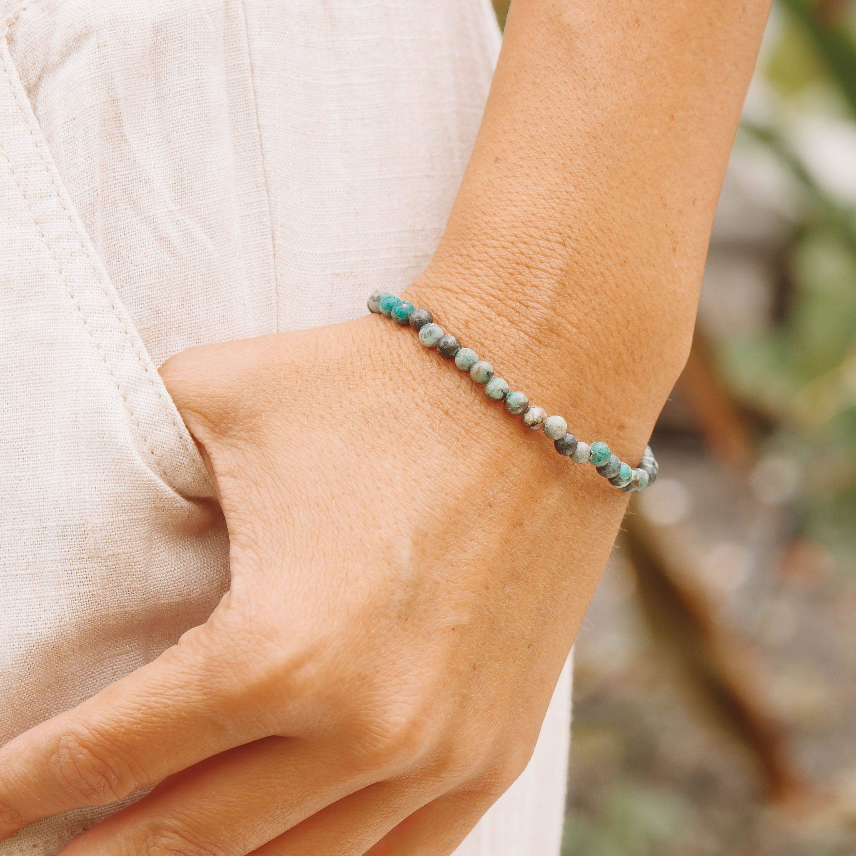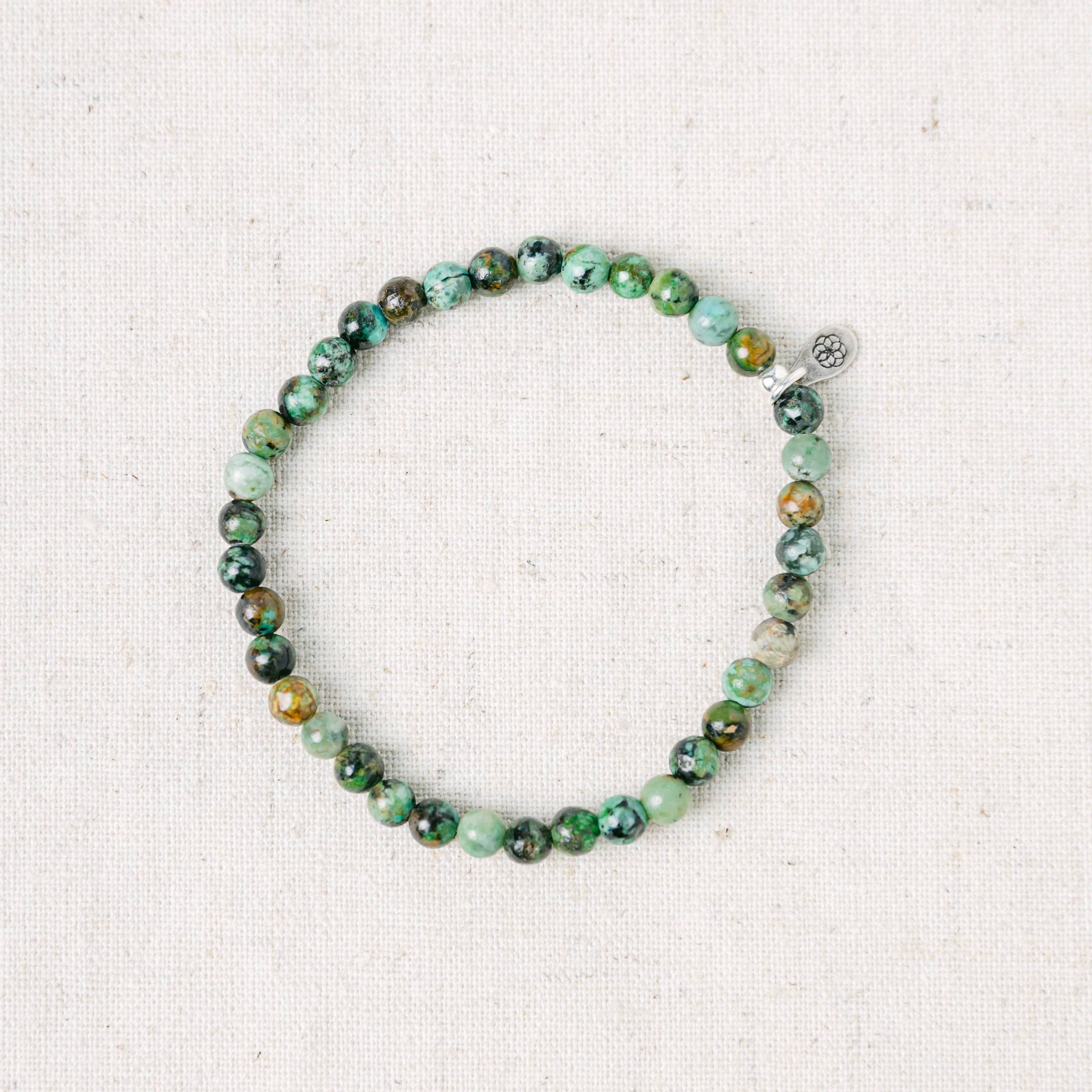 The Stone of Evolution, this African Turquoise Jasper Energy Bracelet invites positive change and power into your mind, body and soul. If you feel like dark clouds loom on the horizon, slip on these rippled stones of pretty green and turn your face to clearer skies.