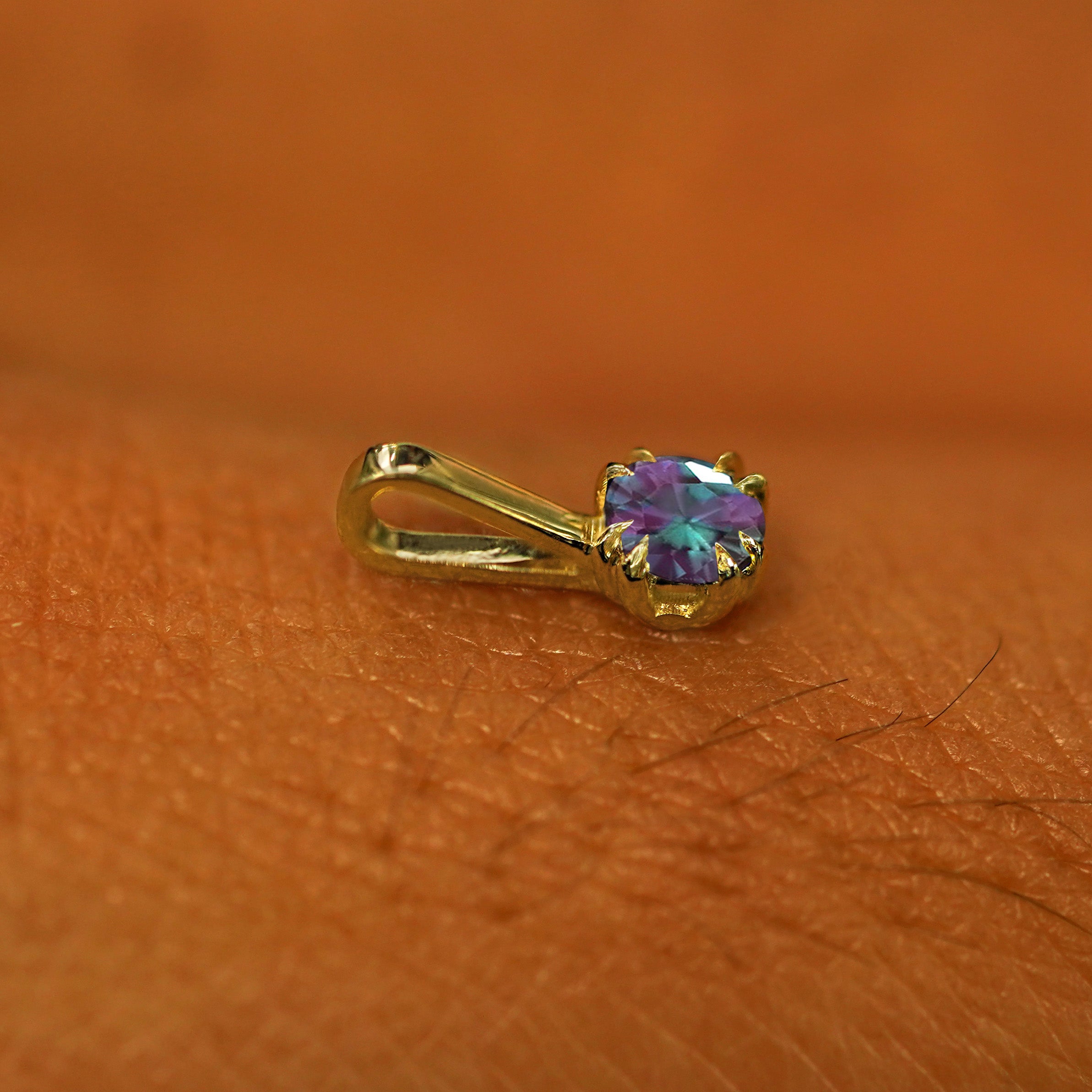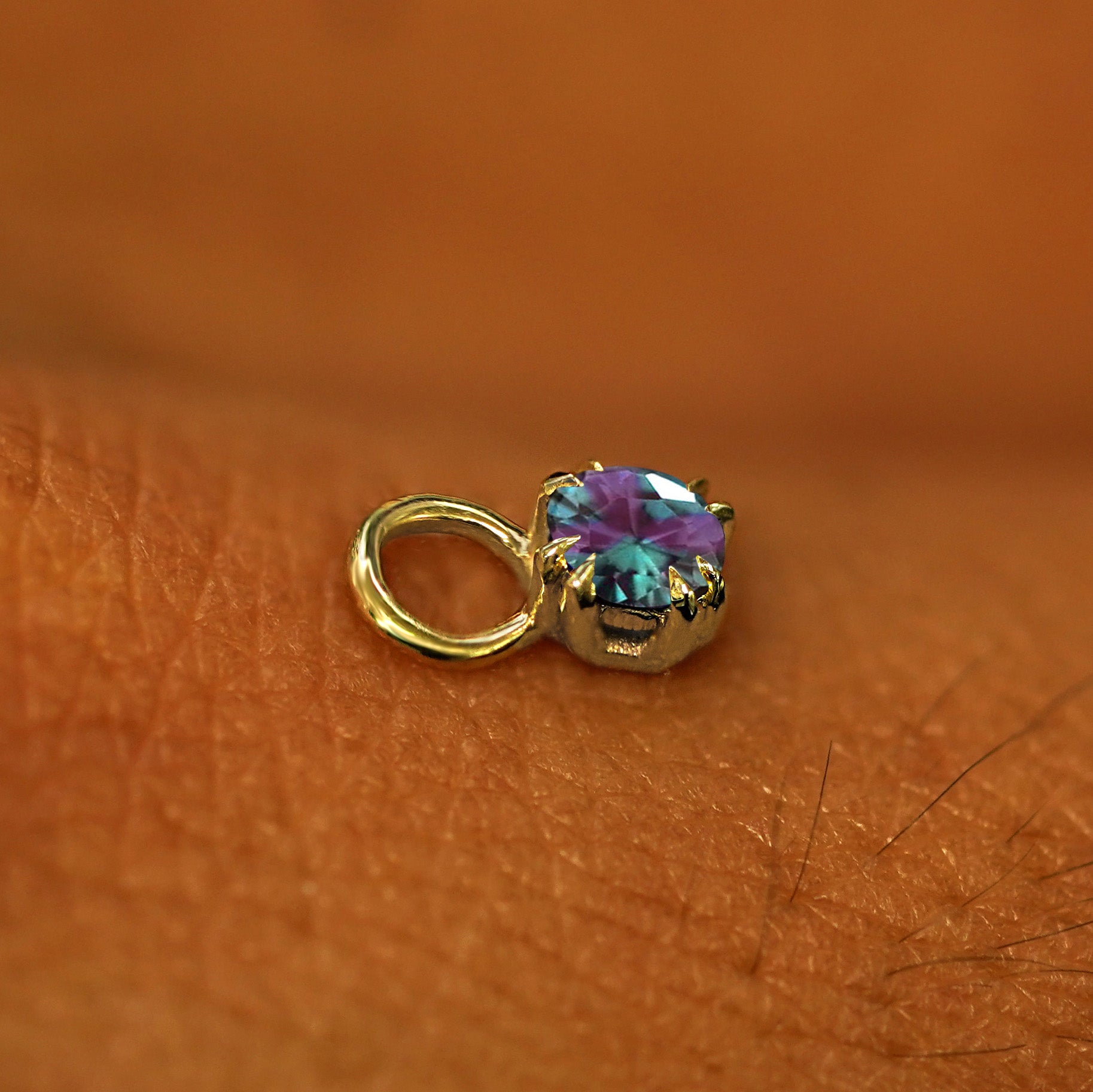 This cute little 14k gold charm has a big secret…it changes colors! Our alexandrite charm changes colors from purple to blue-green in different lighting. Wear this gemstone charm on your favorite bracelet, necklace or hoop and you’ll have a versatile piece that fits your ever-changing style.