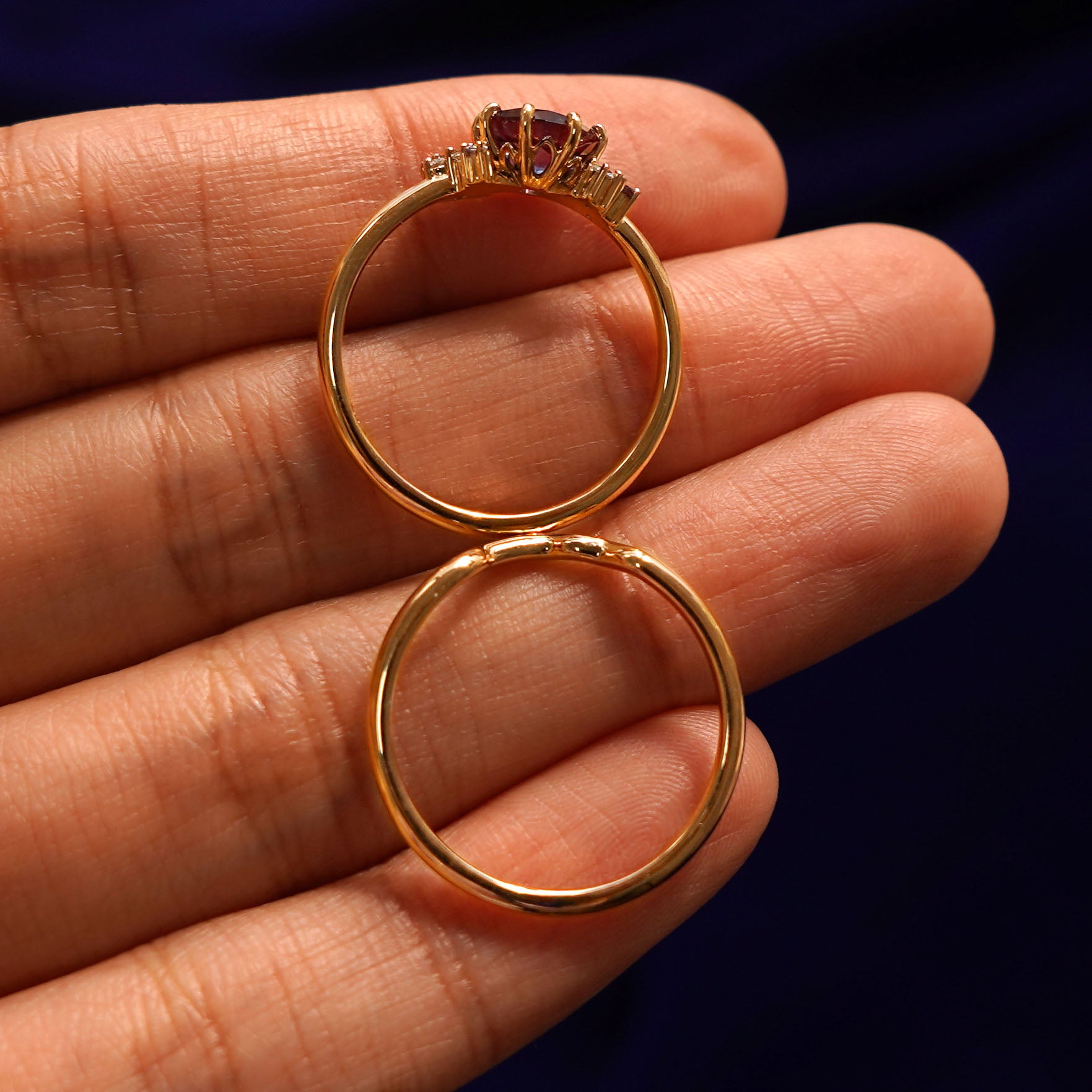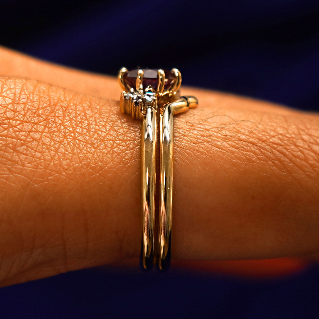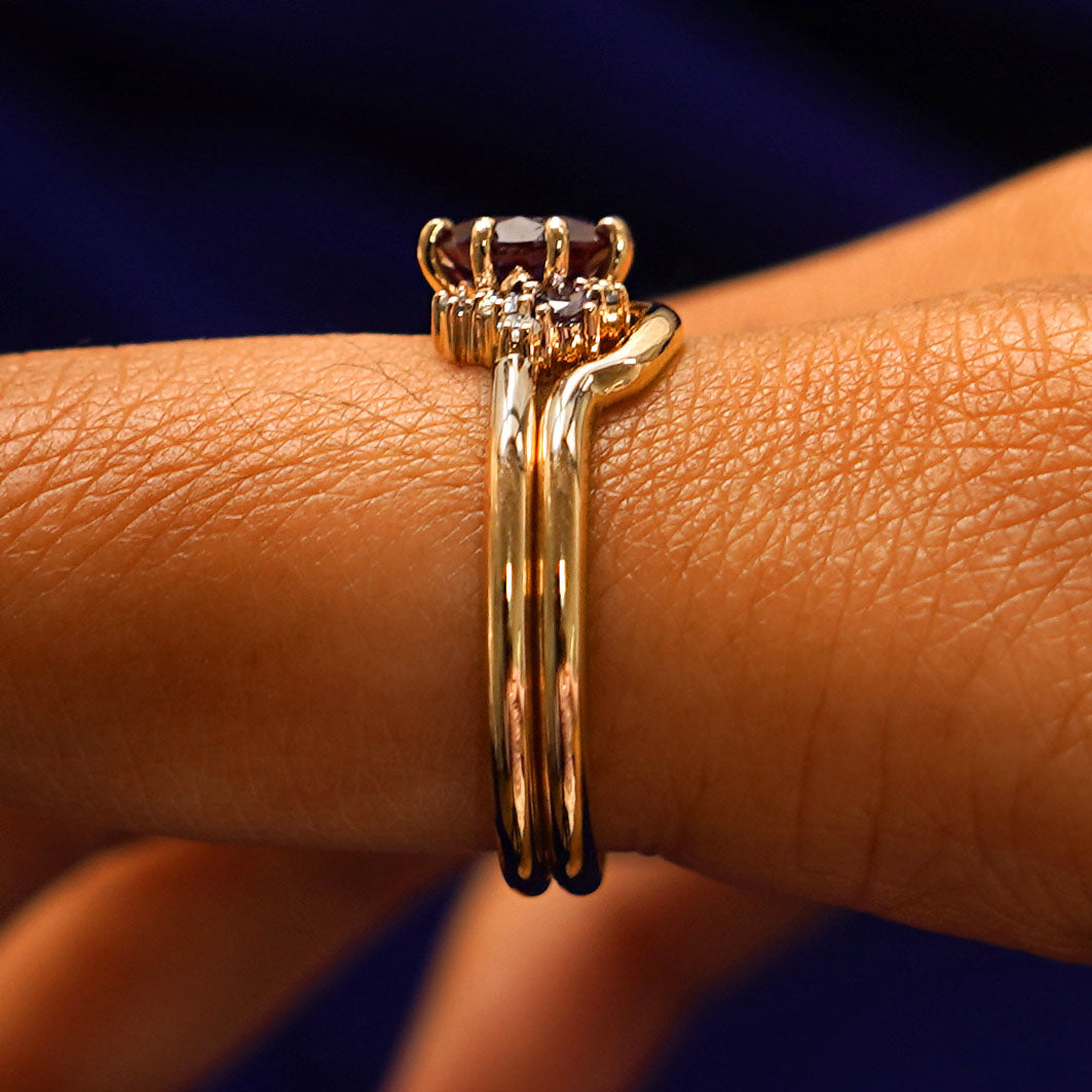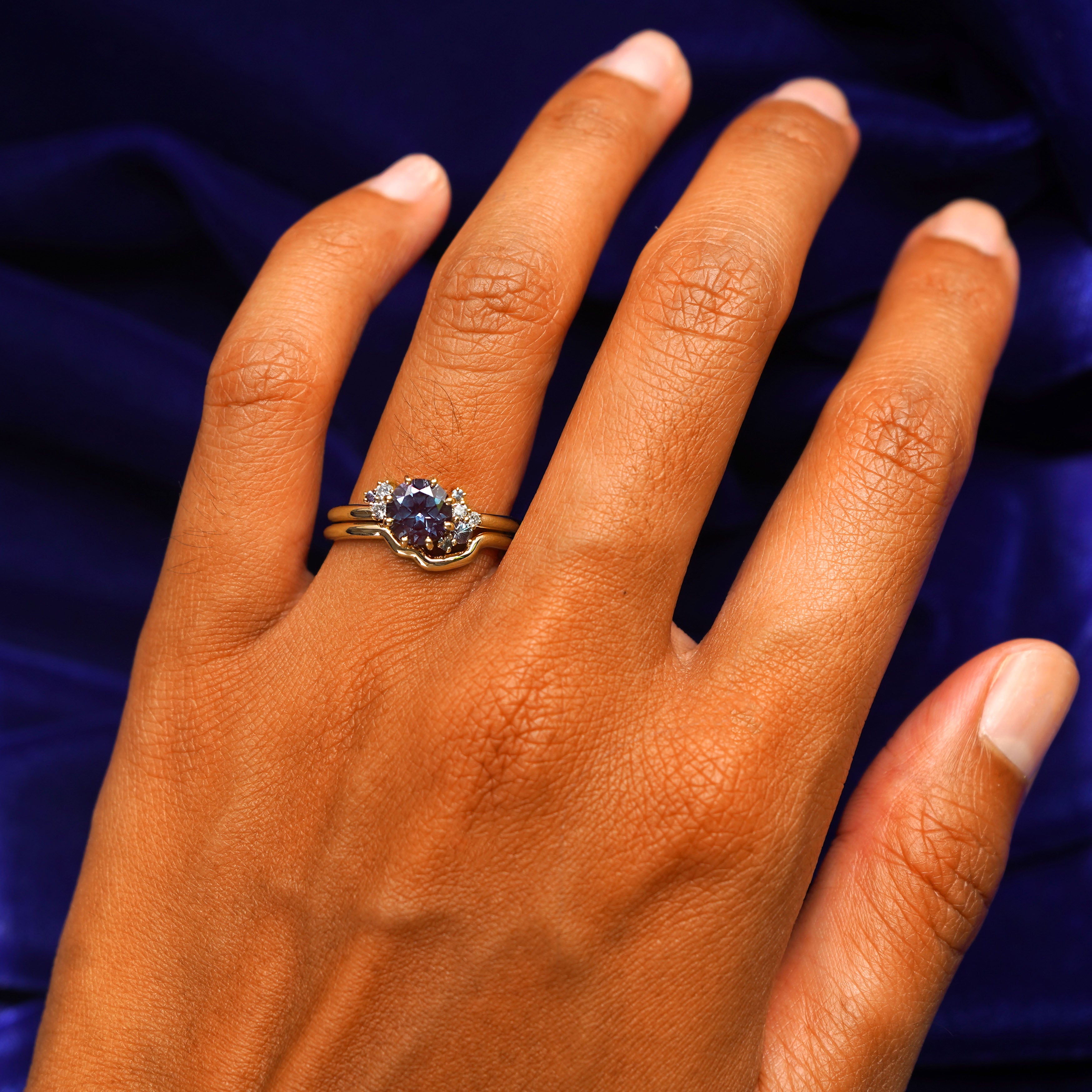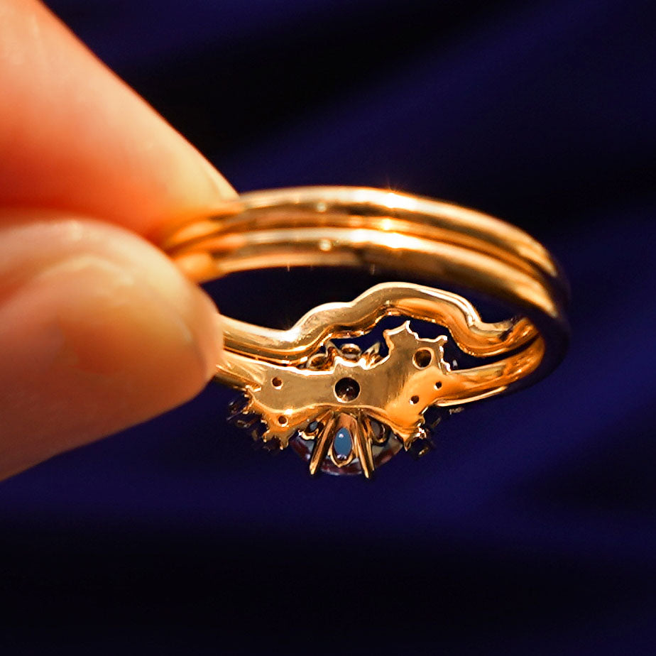 “I love this ring because it’s a classic engagement ring but also the deep color and asymmetric cluster make it very fun and unique. I love the hidden flower detail underneath the main stone and I really love the matching wedding band because it reminds me of nature and a mountain range.” - AL (founder of Automic Gold)