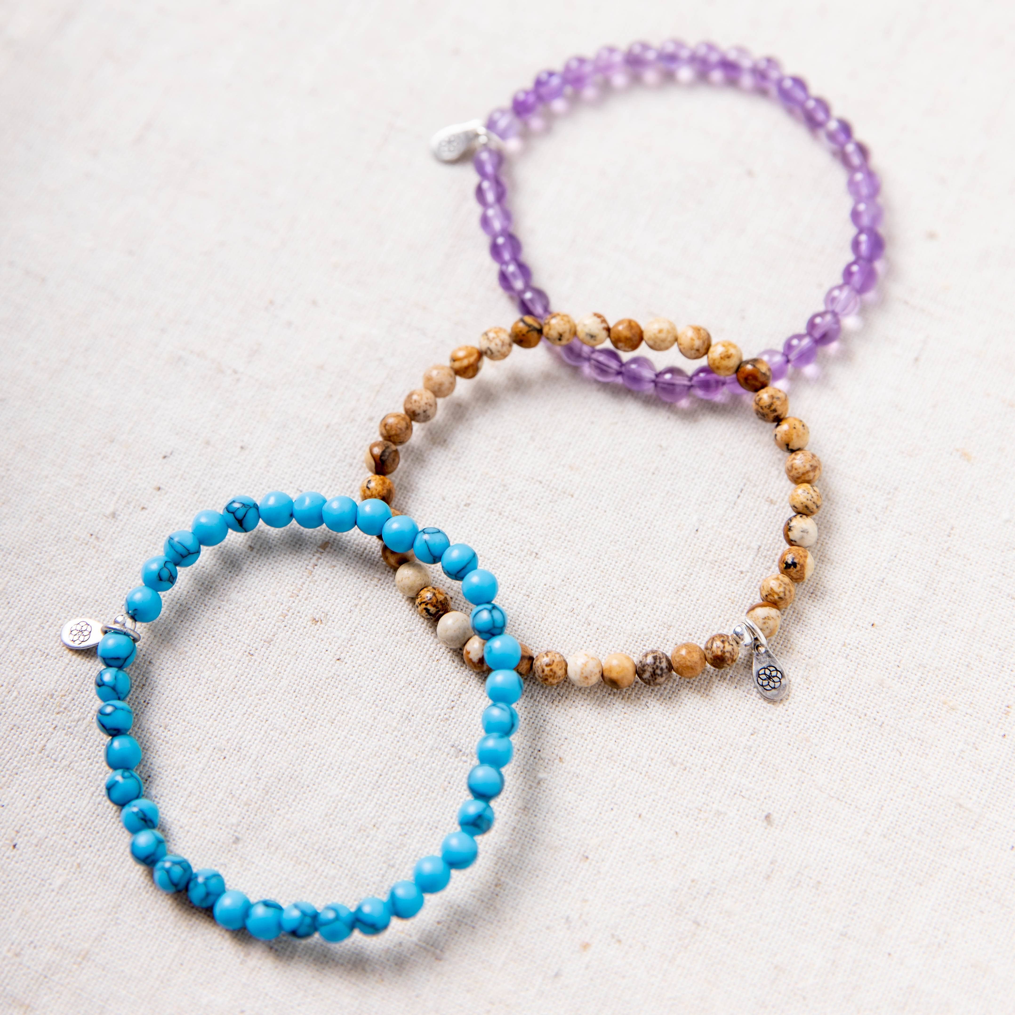 Invest in your intuition with this beloved Willpower and Guidance gemstone set. Three beautiful bracelets balance you out, soothing the mind and making space for your inner voice to ring. We all know that sometimes the heart and mind can fall out of sync and cause us to stumble through life blind, but the soft, supple components of Amethyst, Howlite Turquoise, and Picture Jasper are here to nudge you back on track.