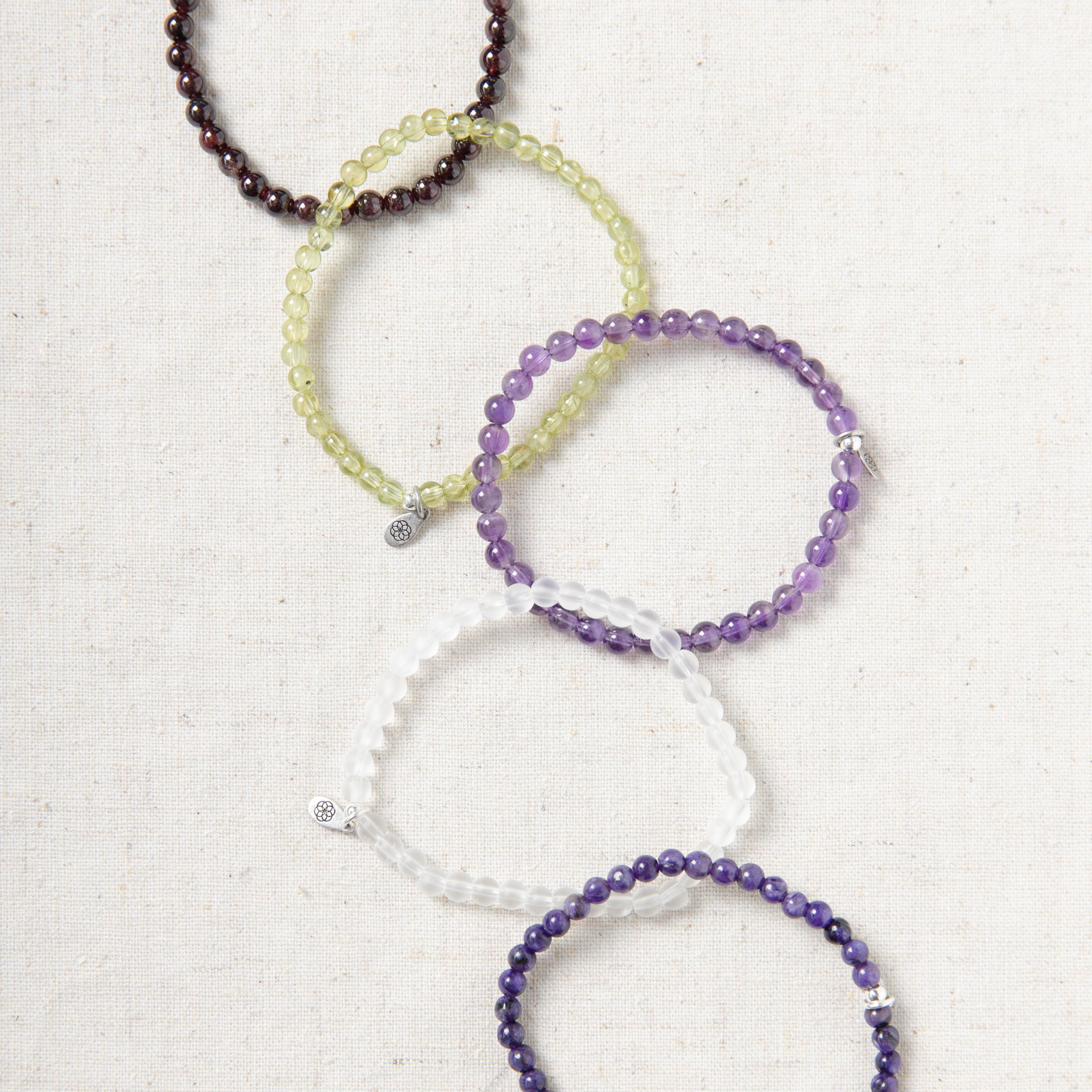 - Amethyst, Snow Quartz, Garnet, Peridot, and Charoite