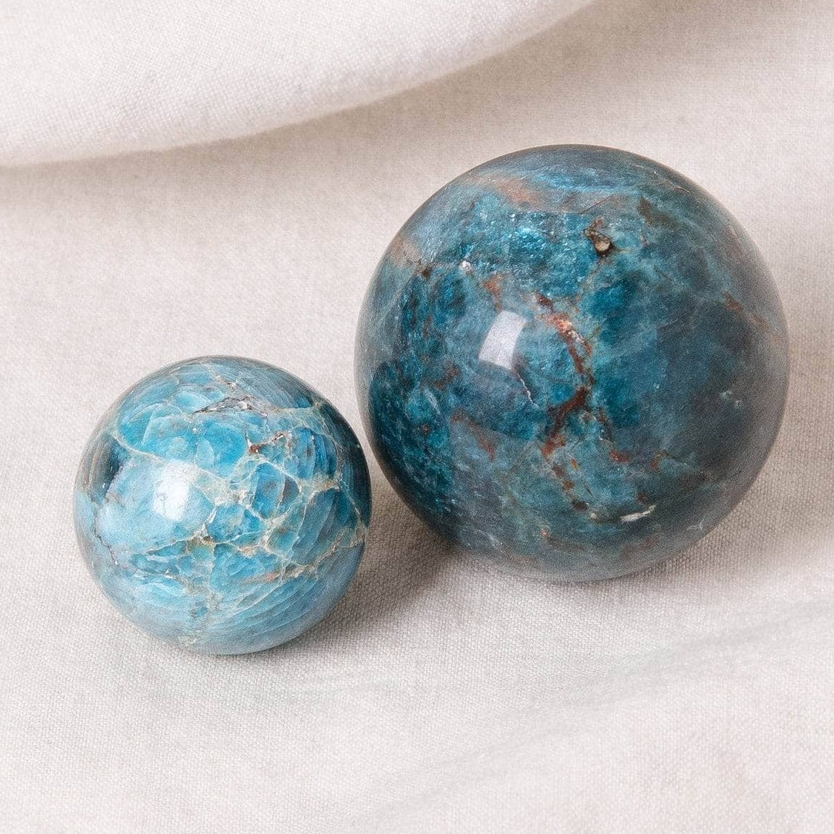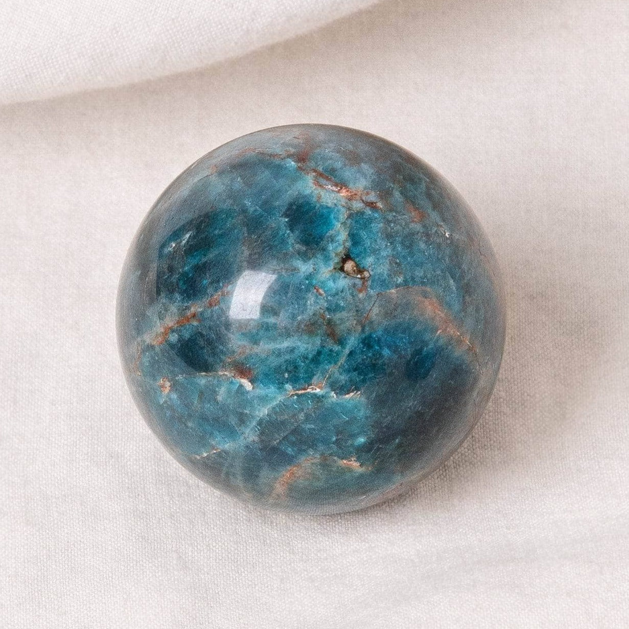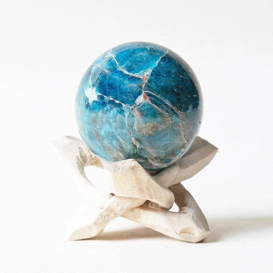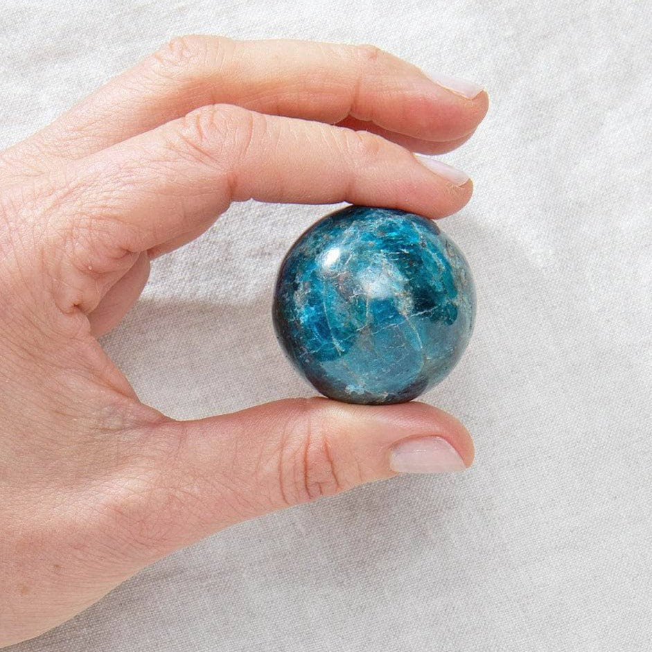 The sphere shape is the perfect choice of sacred geometry for the Apatite crystal. Spheres are an incredible spiritual element. With their solid roundness, they represent themes of oneness, unity, wholeness, cyclical energy, and completion. They serve as a reminder that in ourselves we are full and on this earth and in this universe, we can be unified and complete. They also have big auric energy and historically have been used as scrying tools for those who want to see further.