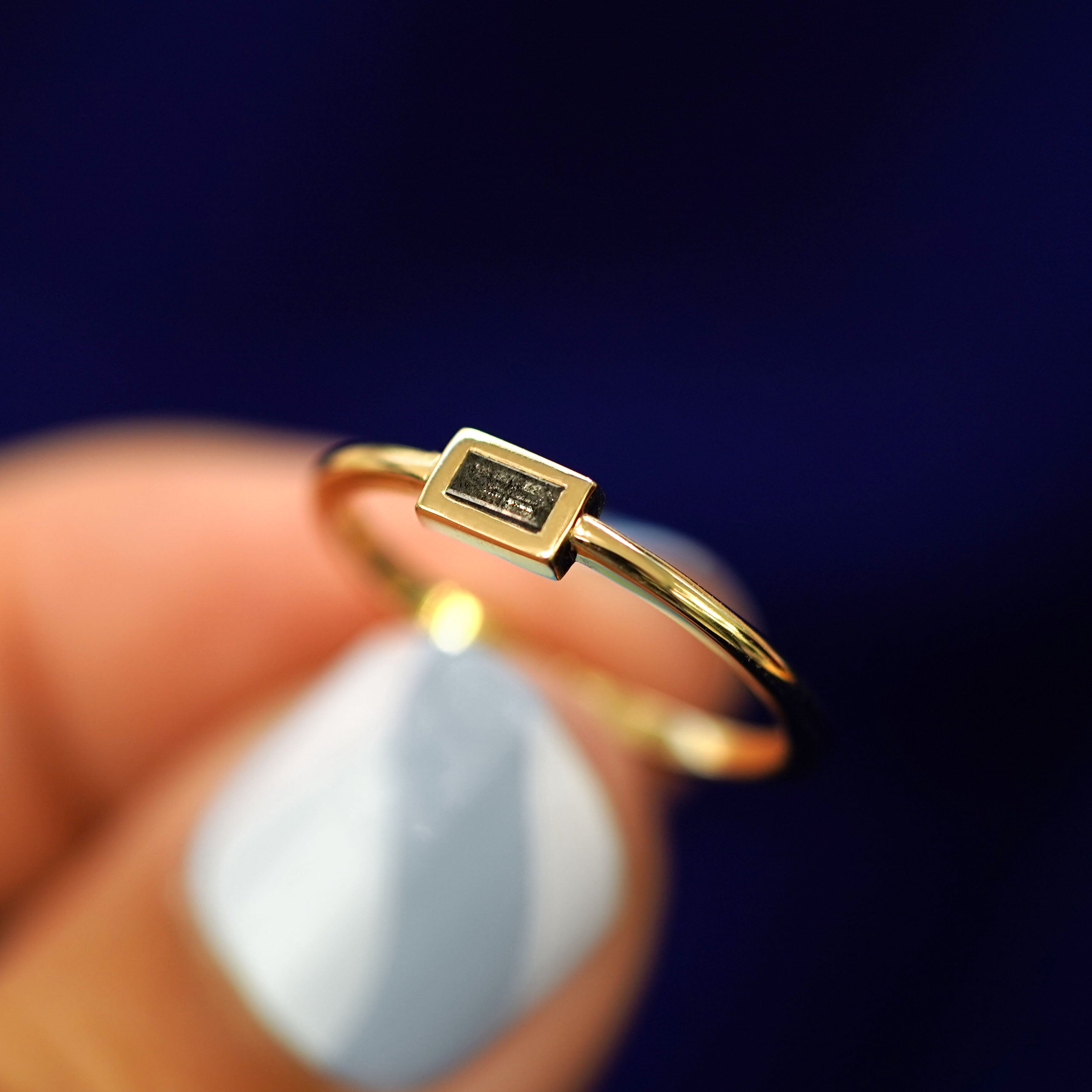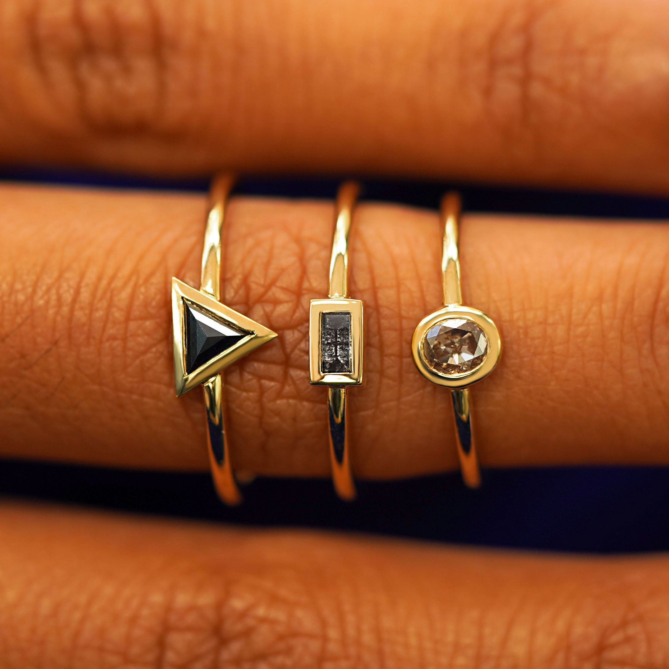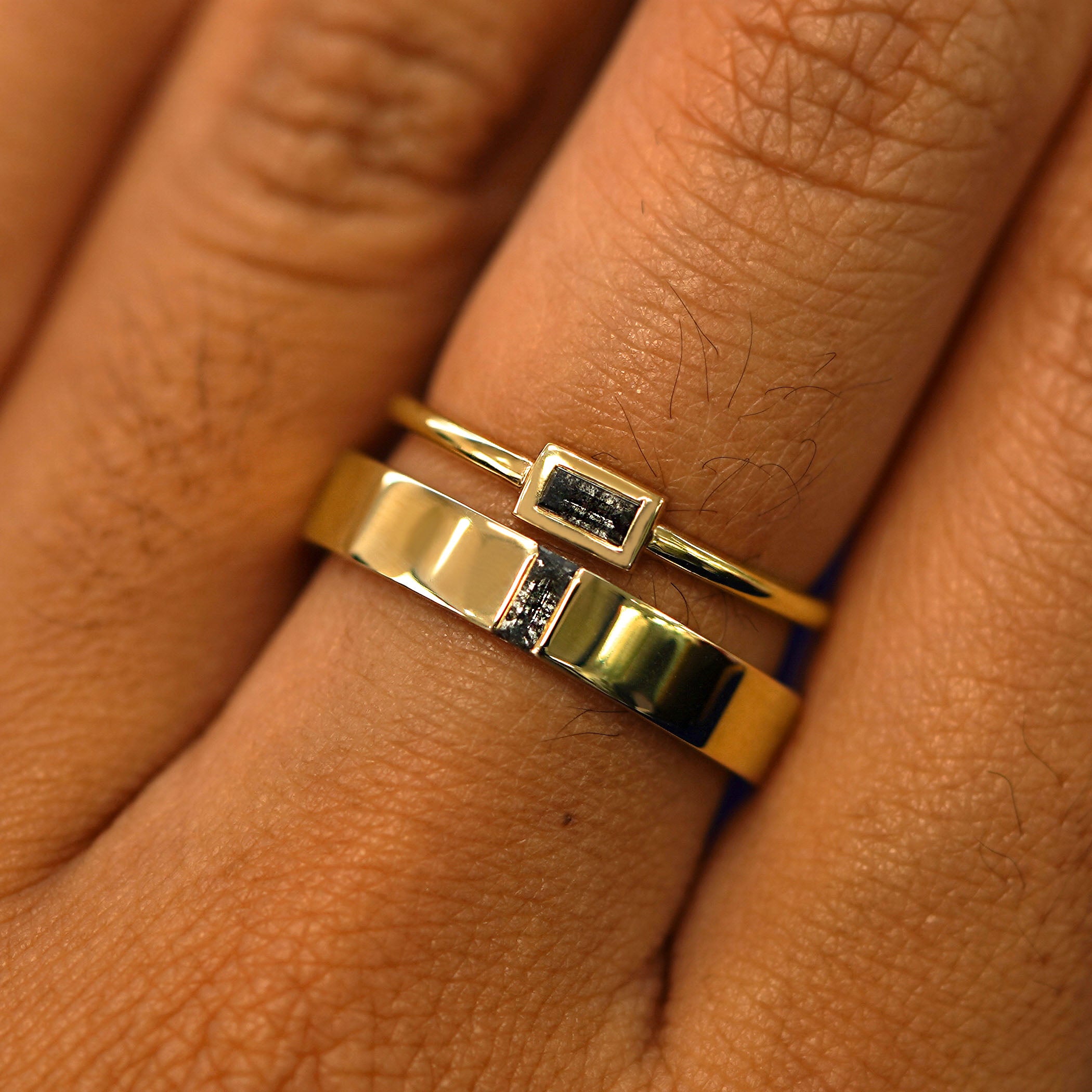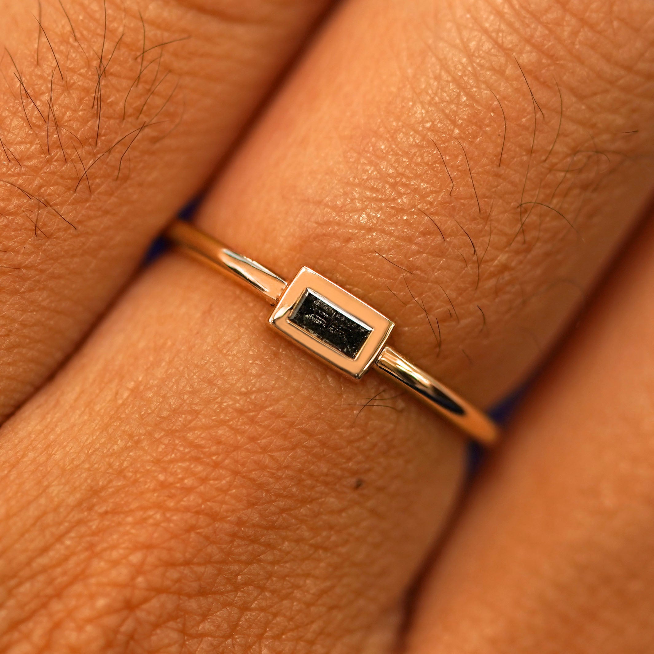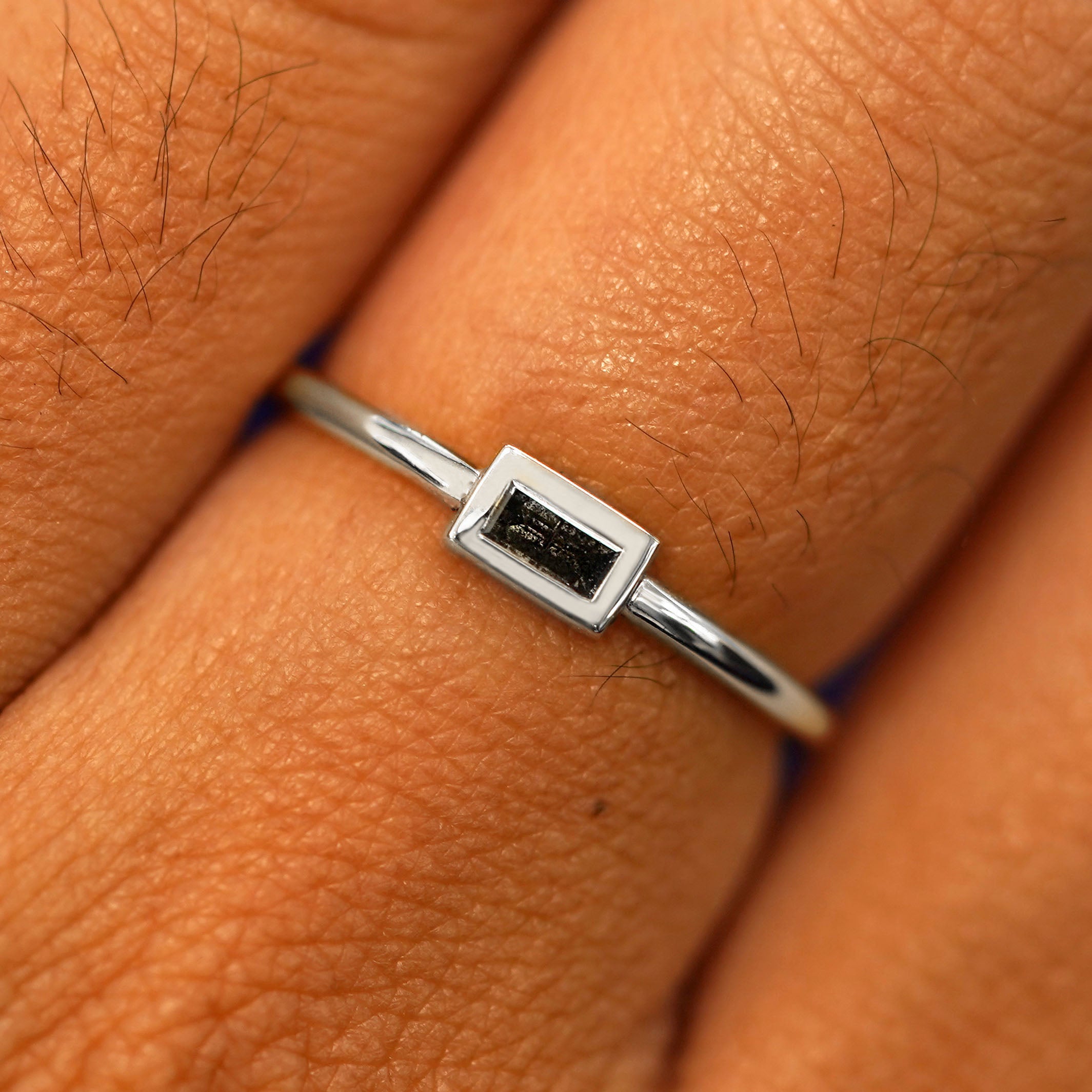 Sparkling, stunning, and stackable, we just can’t get enough of this salt and pepper diamond ring! A gorgeous baguette natural salt and pepper diamond sits in a thick solid gold bezel setting on a thin yet durable band.