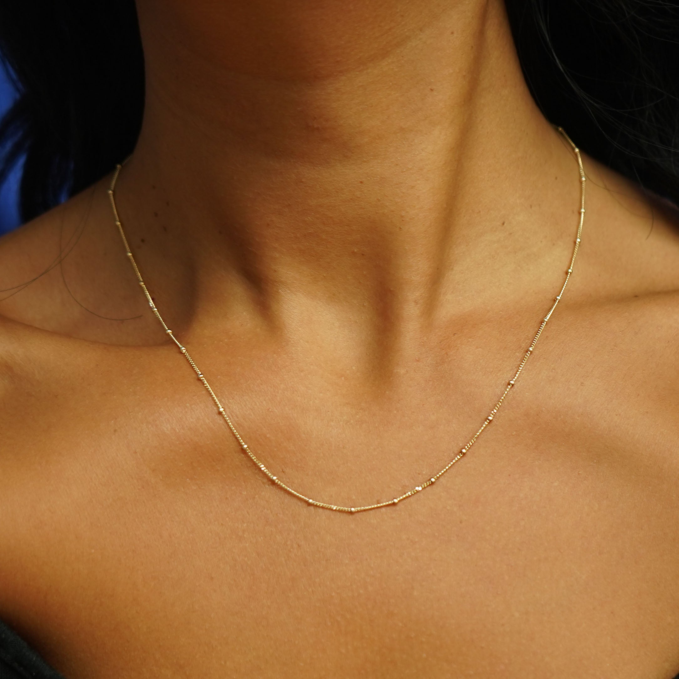 A sparkly chain necklace you can wear anywhere! This gorgeous beaded chain has a chic and fun design that goes with every outfit. Made with recycled 14k gold, this necklace is both comfy and sustainable. Secures with a lobster lock and easy-to-grip Automic Gold AU plate.