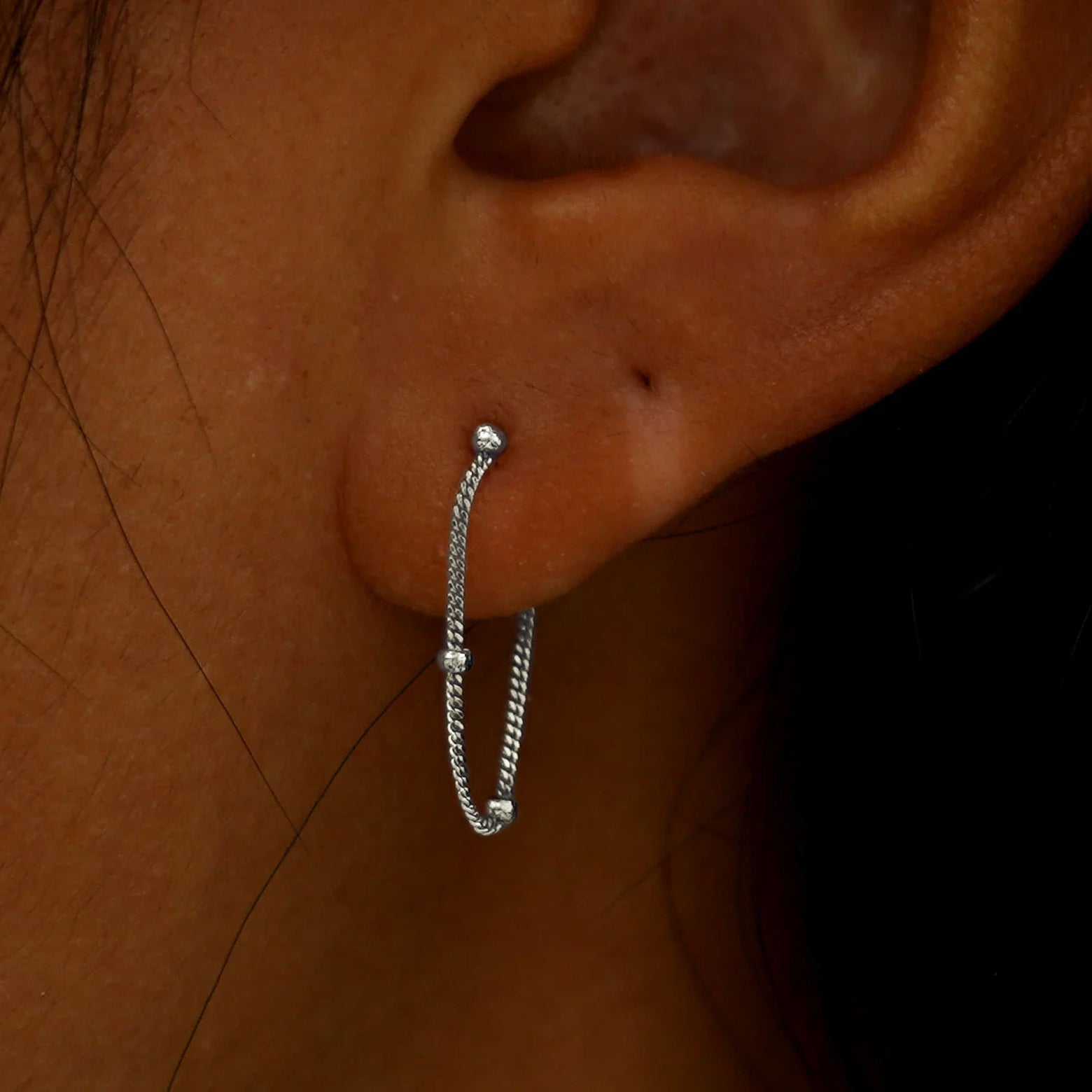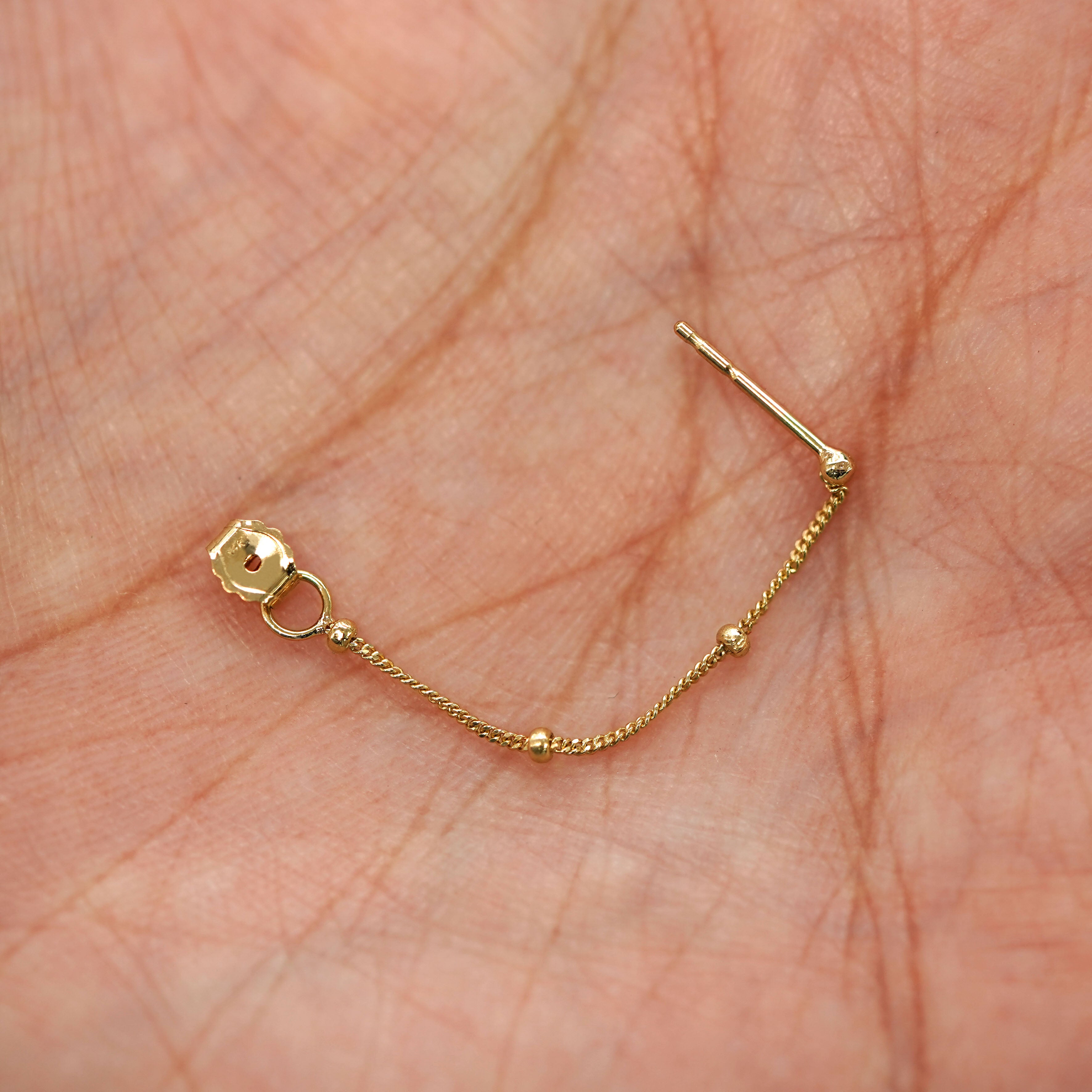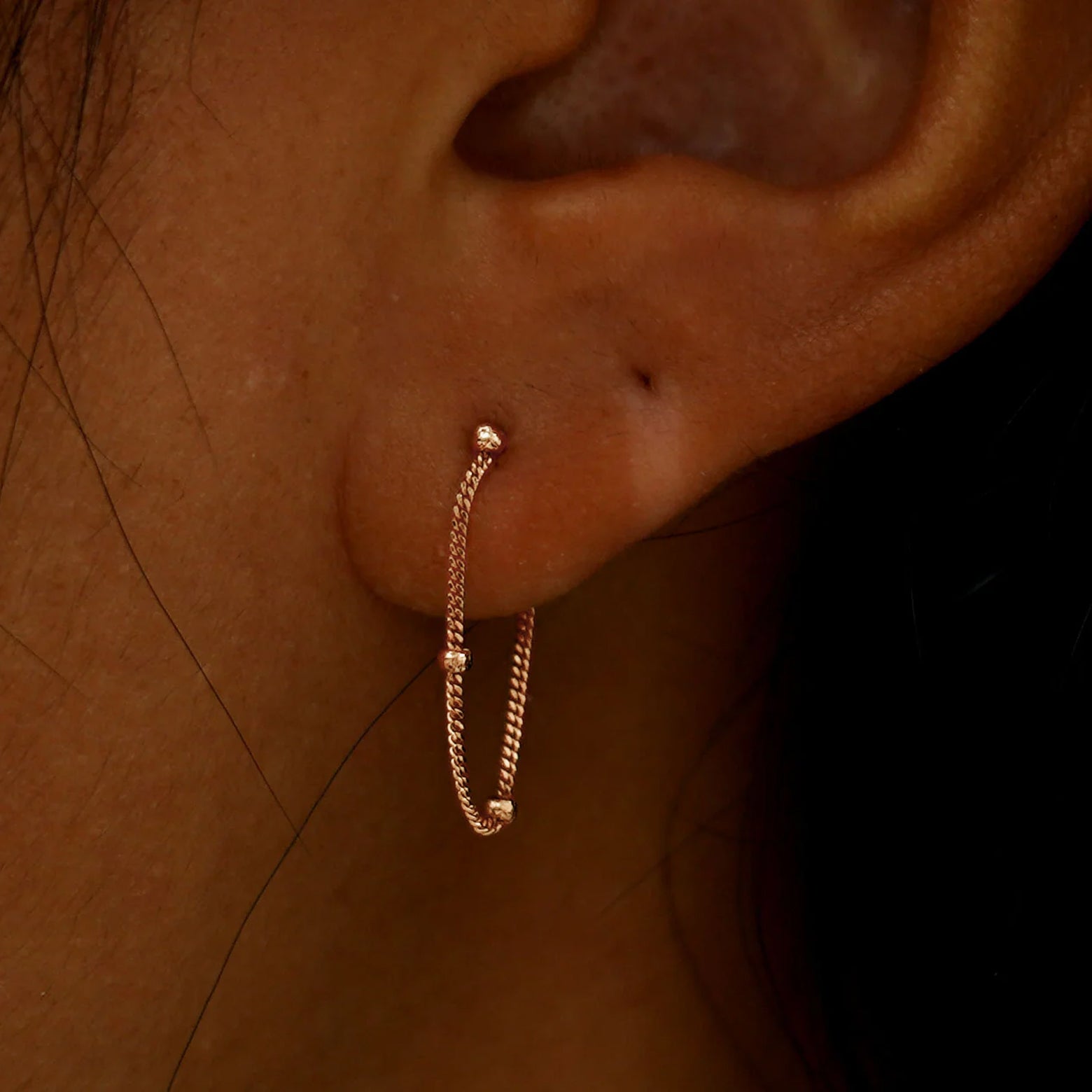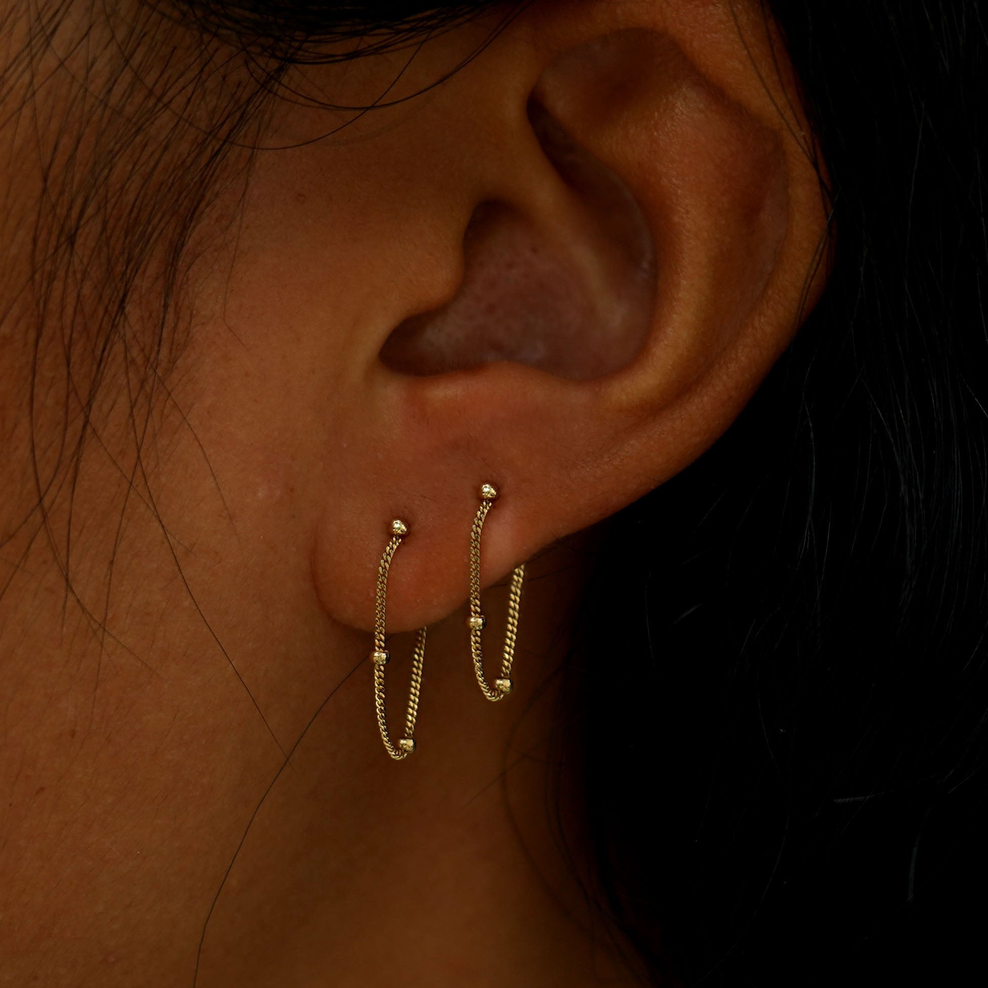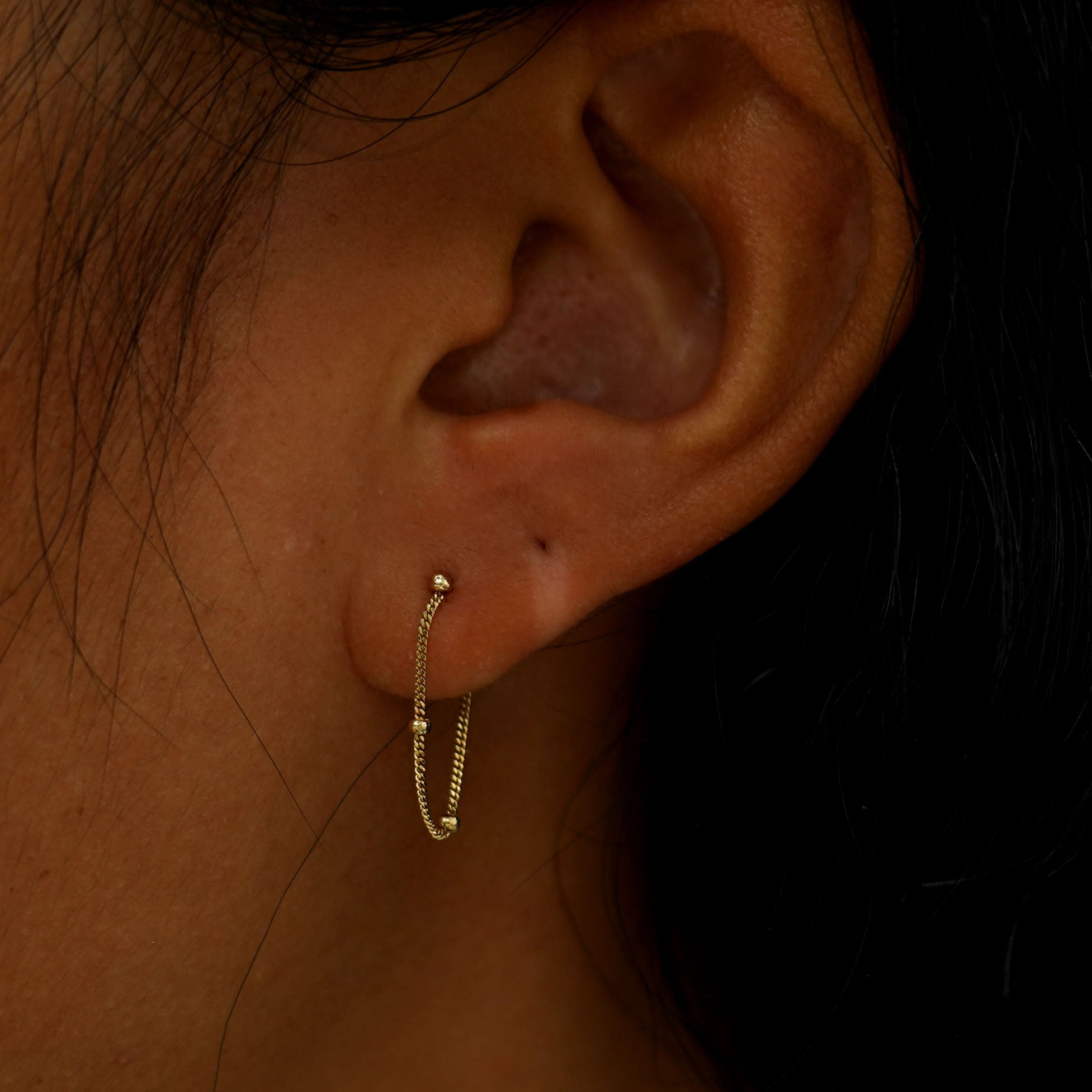 The newer addition to our chain loop earrings, this beaded chain loop features a chic essential chain adorned with solid 14k gold beads. Because the beads are solid they will never dent, so you can wear them without worry.