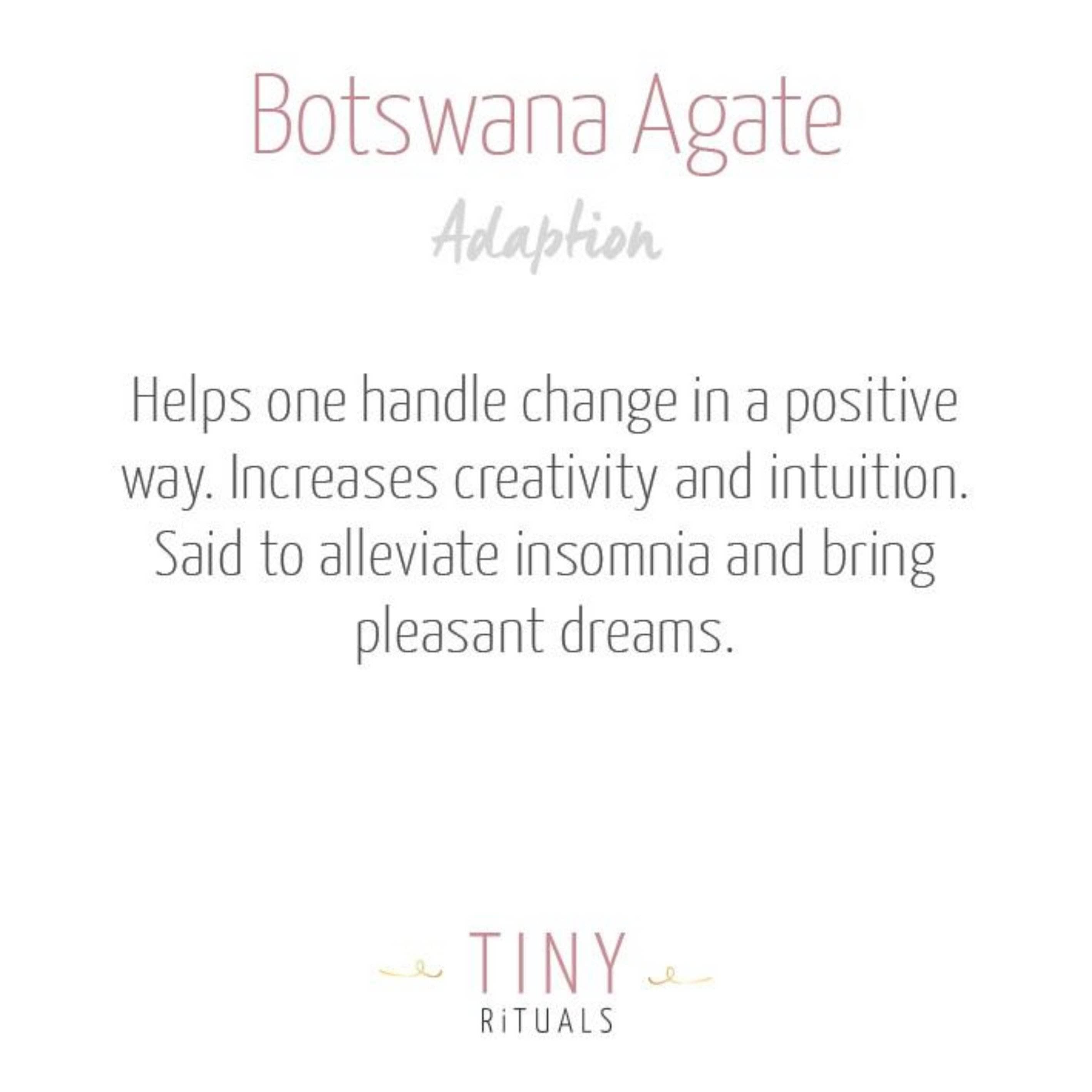 One of the best things about Botswana Agate is the fact that it drinks sunshine and retains it, lending itself well to a stone known for its sublime healing ability and gift of lightening the load for those suffering a recent loss or heavy grief. The Botswana Agate Energy Bracelet is also a beautiful companion for those craving warmth and comfort on long dark nights. A soother for insomnia, this stone invites you to sink down into a restful bliss and even makes space for gentle dreams.