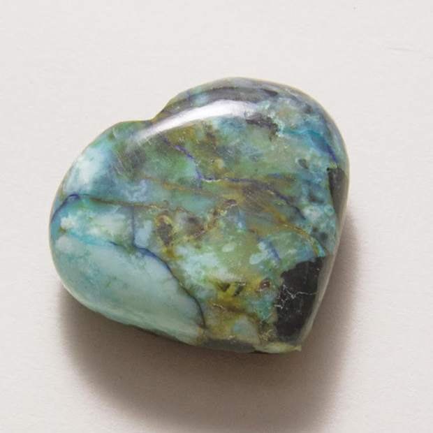 The Chrysocolla Heart will bring balance to your body, mind, and soul. It is exceptional at helping clear out the closet of guilt, anxiety, and any weighty feelings that are dragging you down. It also helps heal issues around fertility and keeps the respiratory system ticking. For those who crave the flow of water energy, rippling sunshine, and pure heart space, this Chrysocolla heart is a token of truth and integrity.