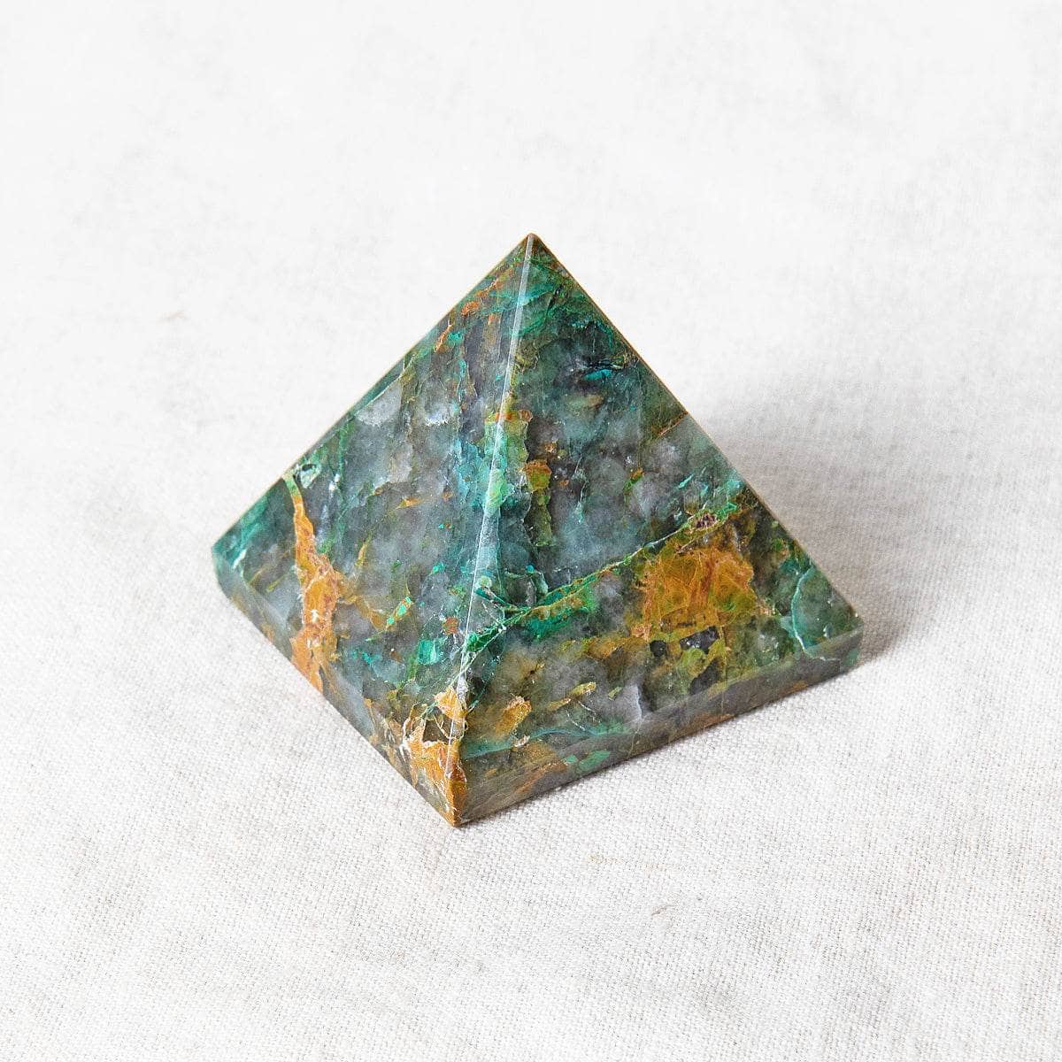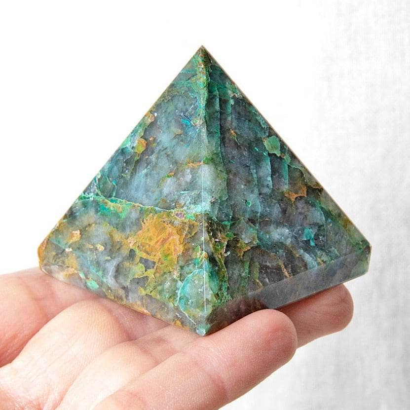 Blues and greens bring calm and flow into the Chrysocolla Pyramid. This crystal pyramid is the perfect tool for helping you to become your own greatest teacher. The mingling of Malachite, Turquoise, and Azurite come together to create a gem that is blessed with healing vibes and encourages the art of self-expression, growing awareness, deep connection, and creativity.