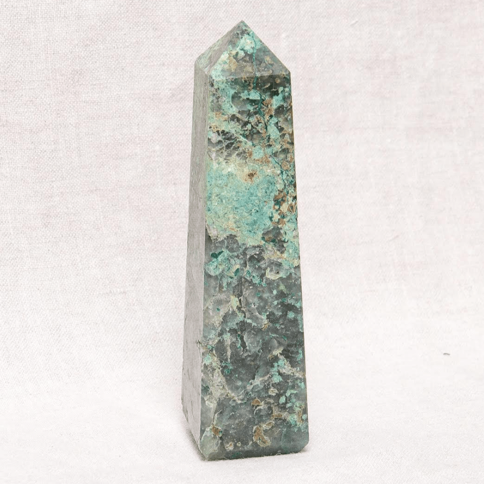 Stand tall and carve out a deeper sense of consciousness with the Chrysocolla Tower. Also known as the teaching stone, here the Chrysocolla crystal is stacked into a tower point - the perfect shade of sacred geometry to pull universal knowledge right into your heart. Of all the healing crystals, natural Chrysocolla is here to centre our communication and help us to say yes to positive change.