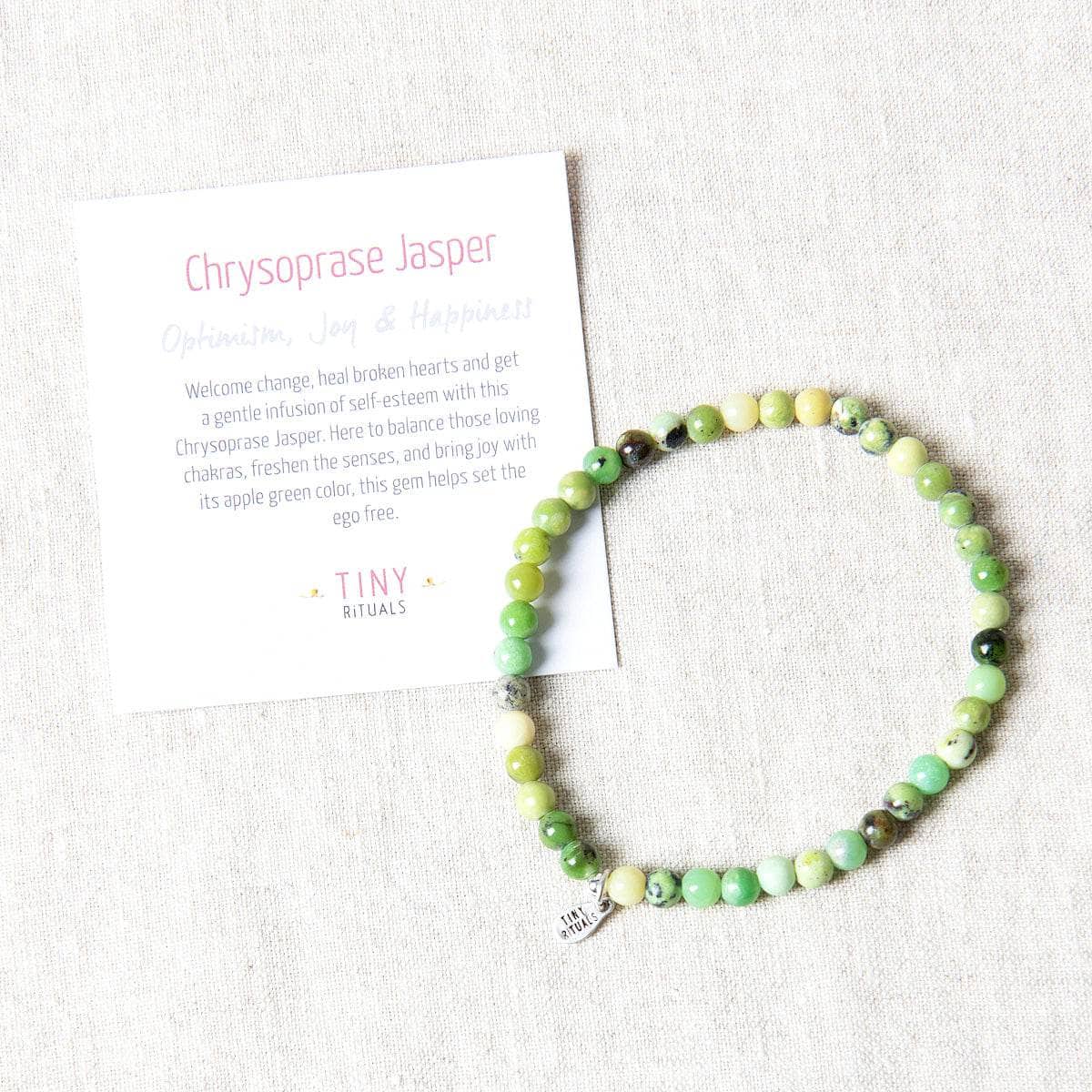 This Chrysoprase Jasper Bracelet is all apple green shades of pure joy, springtime magic, and unbridled enlightenment. Lovingly made from natural Chrysoprase, this shimmering bracelet brings the sweet vibrations of divine truth, higher consciousness, ease and elegance with it. The fluid radiance of this gem also comes soaked in the zest of youthful energy, ever ready to gift you versatility and drive that can help you to change gears and get out of a slump.