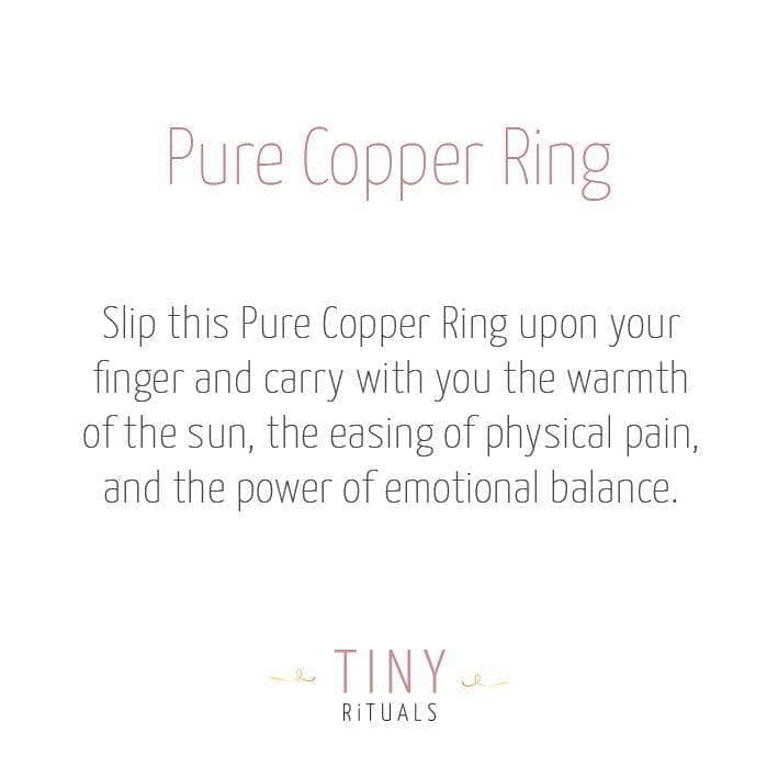 Solid copper is one of the oldest healing materials on earth. Radiant in its shimmering shades of red and gold, one glance at this dreamy and powerful Copper Healing Ring is the deep breath you need to face any kind of day. Copper is beautifully attuned to the healing nature of women. It manages to be graceful, soaked in glory, understated yet incredibly powerful at the same time. Copper is one of the great amplifiers, it can take a fleeting positive thought and turn it into an everlasting belief. Because of this, the Copper Ring is a potent and positive tool to carry with you at all times.