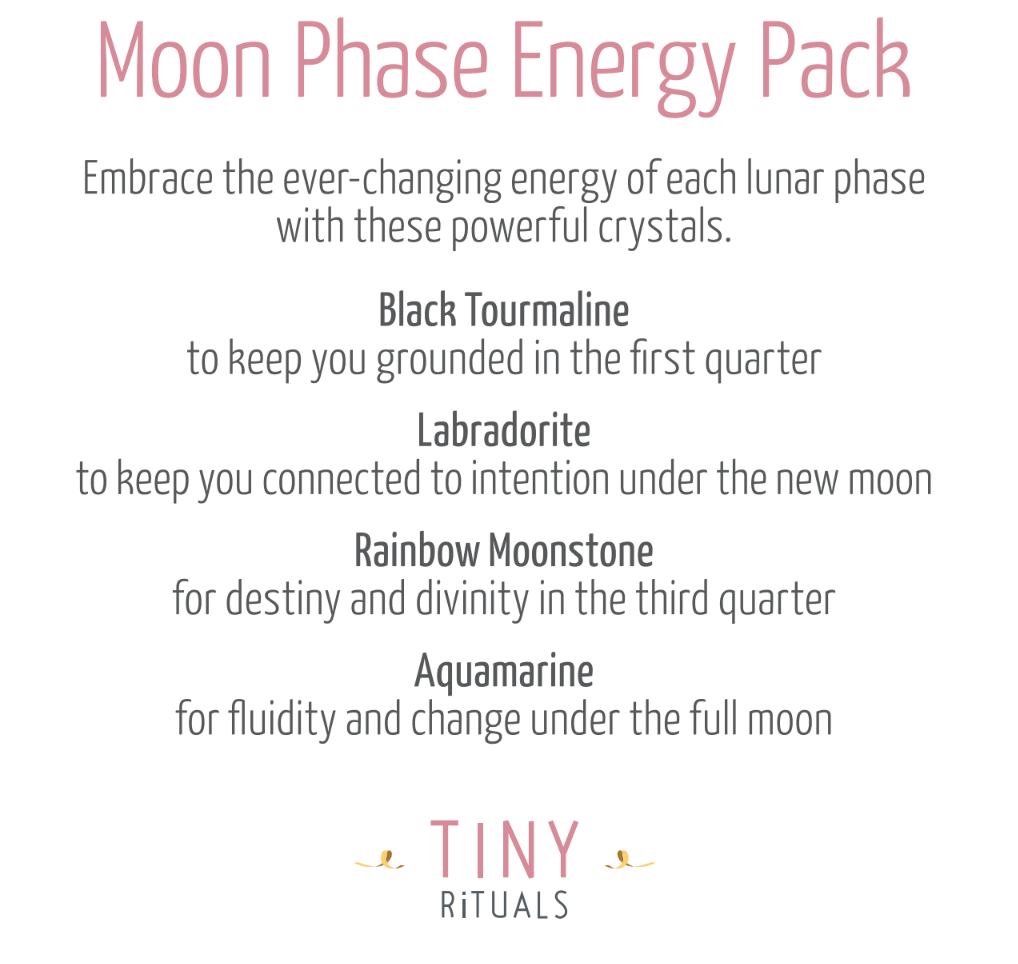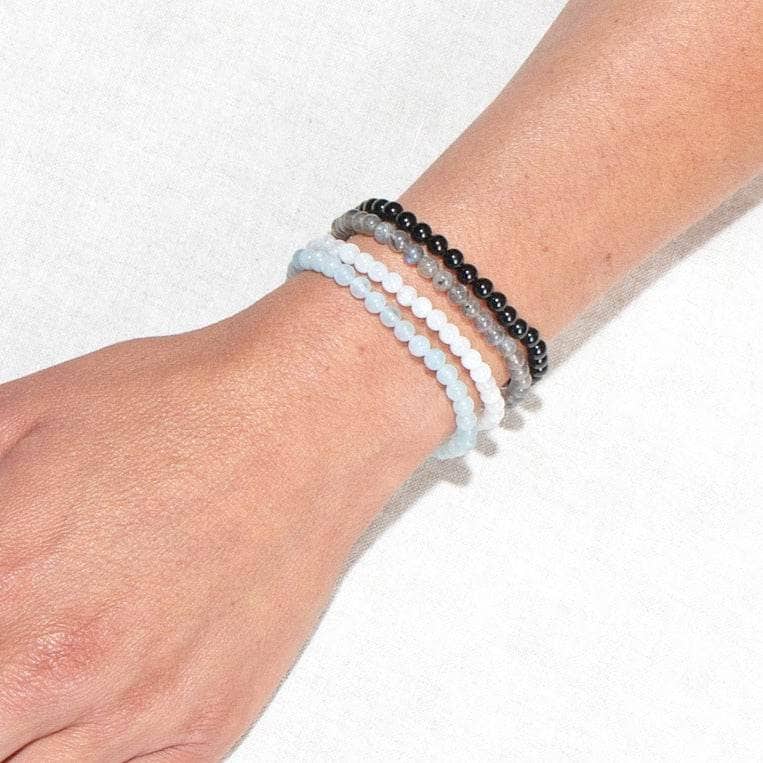 Bringing together the enigmatic energy of four crystals matched to each of the four phases of lunar energy, this Moon Phase Bracelet Pack helps align your vibrational energies to rise and wane and welcome your fullest power all in accordance to grandmother moon. Black Tourmaline for the first quarter, Labradorite for the new moon, Rainbow Moonstone for the third quarter, and Aquamarine for the fullest moon flush.