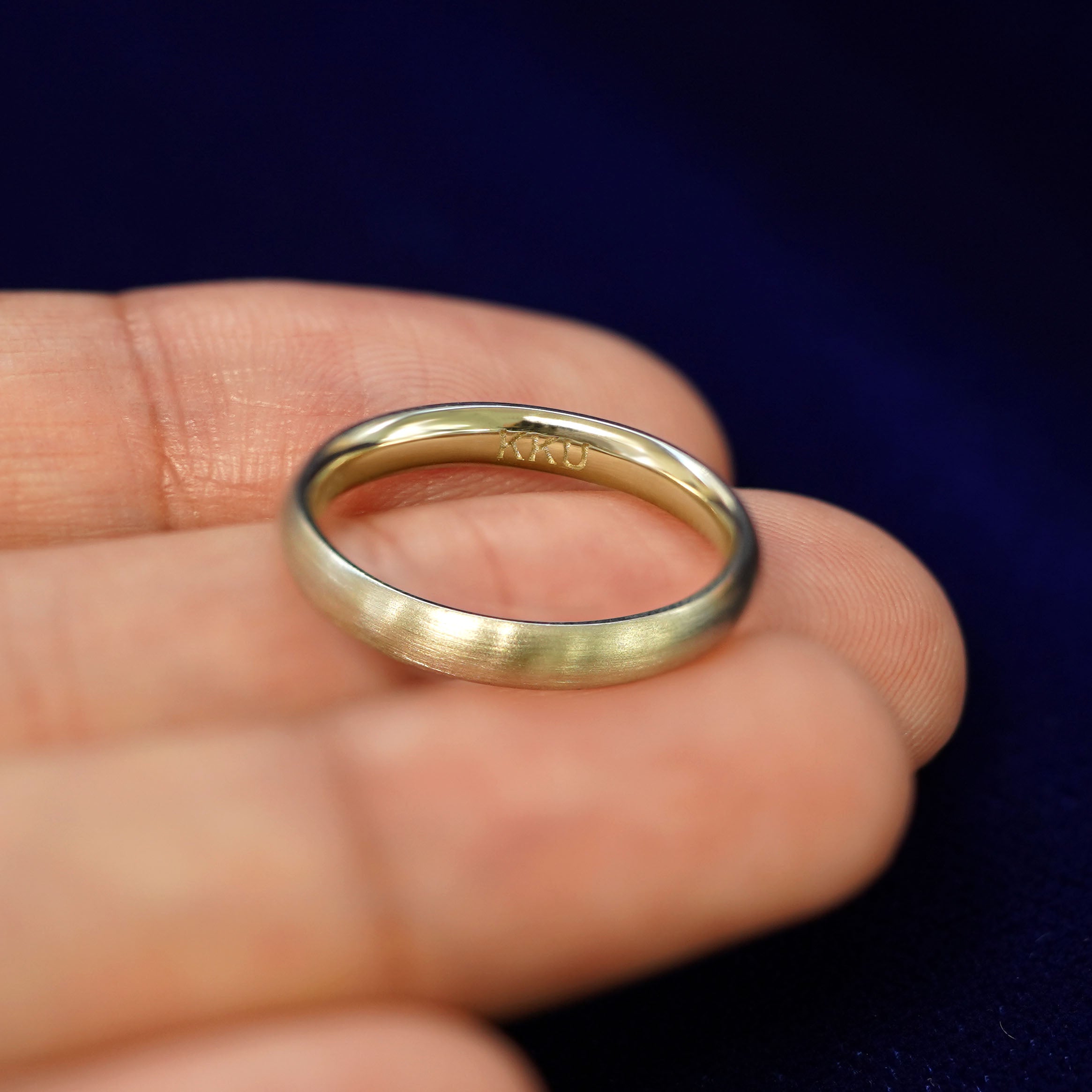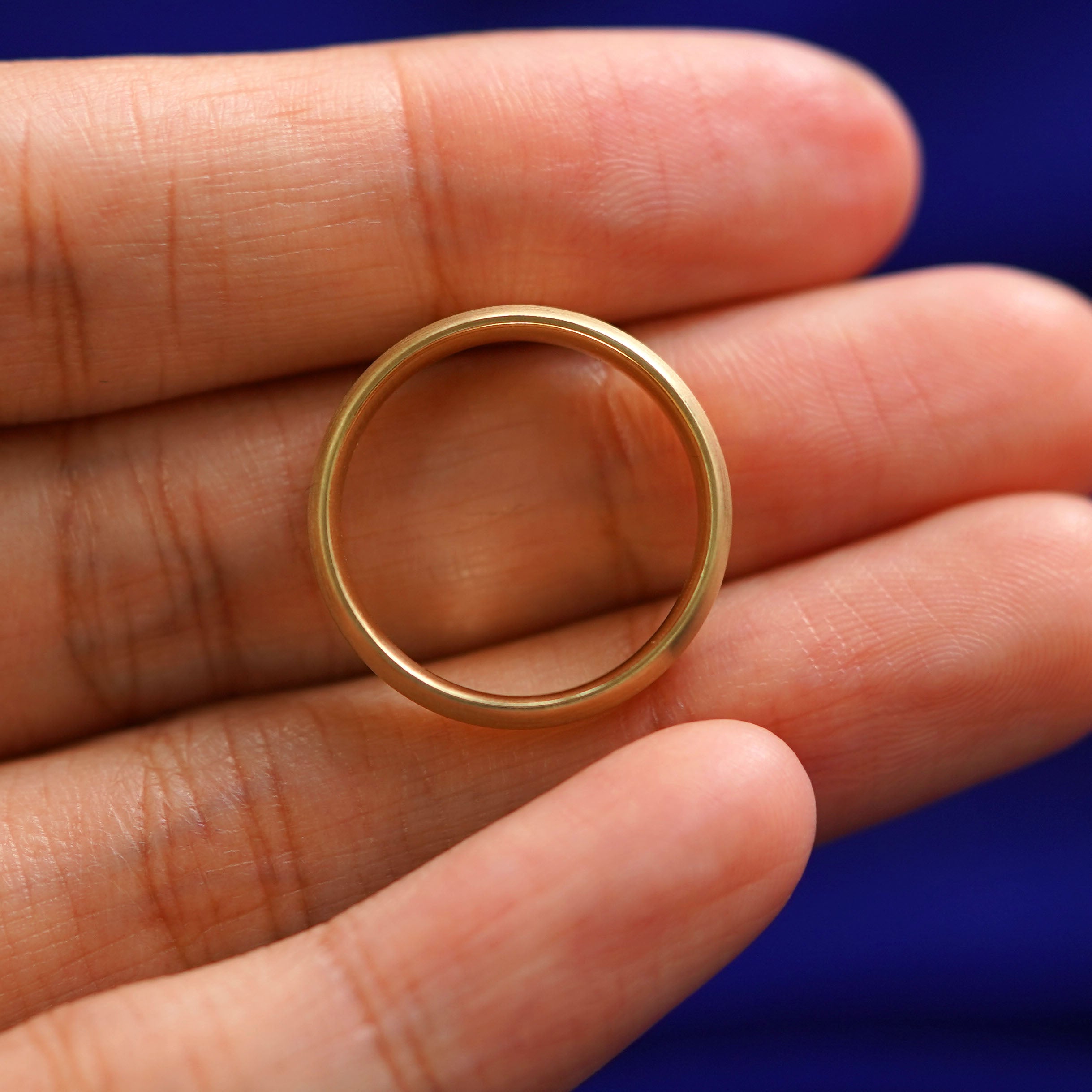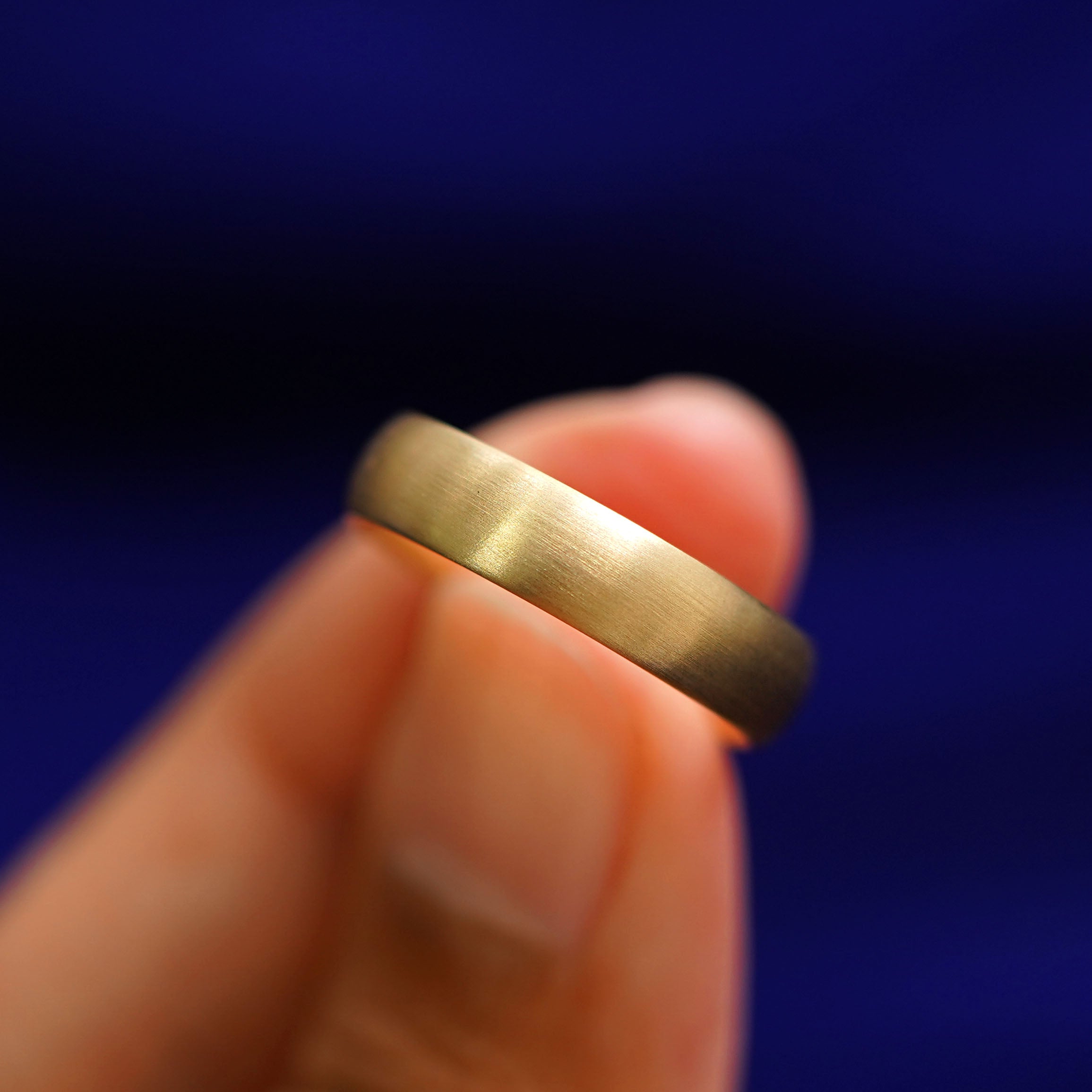 The Matte finish of this 14k solid gold band gives it an even reflection that is subtle and minimal, while the soft curve of this comfort fit wedding ring amplifies the reflection’s magical glow. This matte gold ring is the perfect genderless jewelry piece. Our comfort fit band has a rounded inside edge so it slides on and off smoothly and its comfortable to wear.