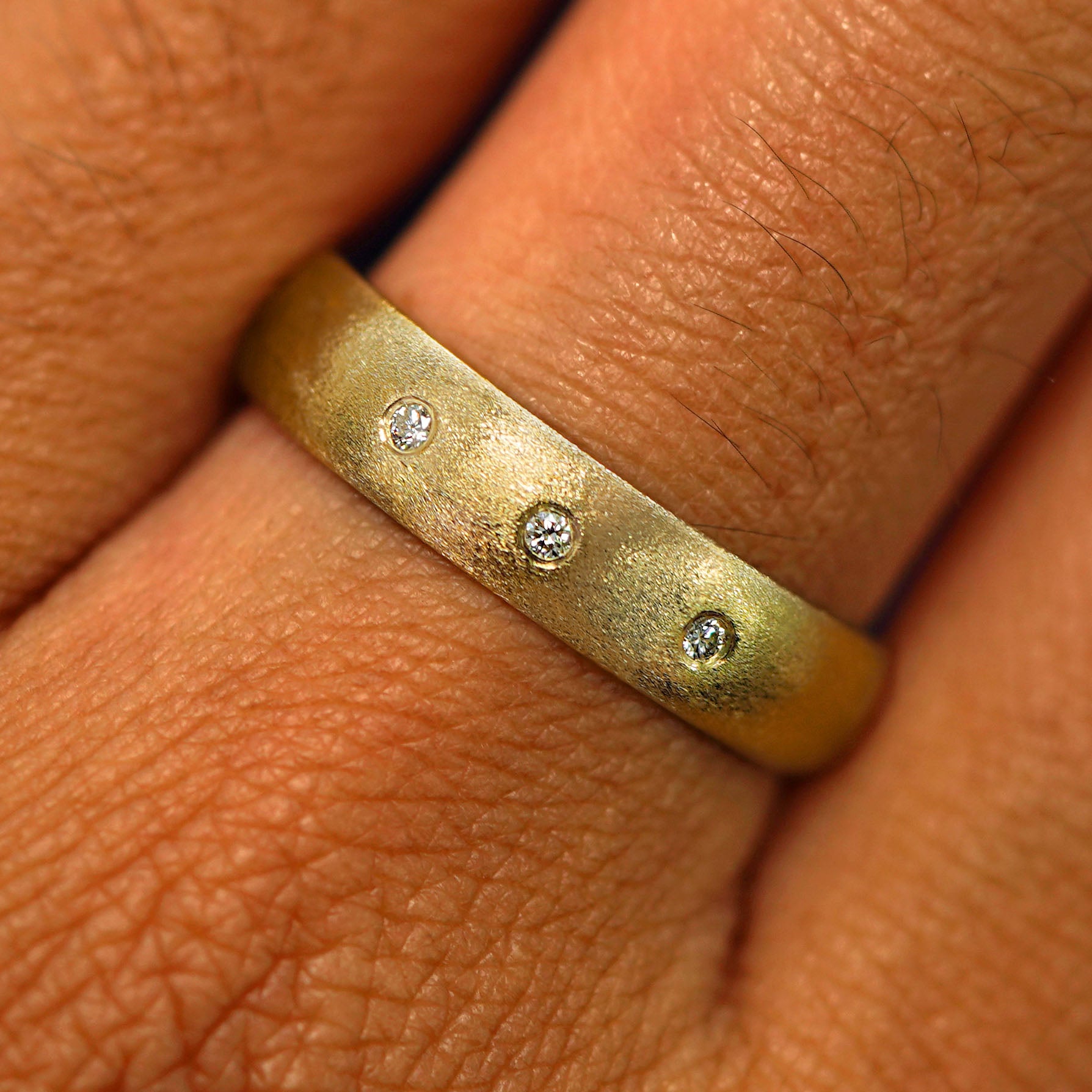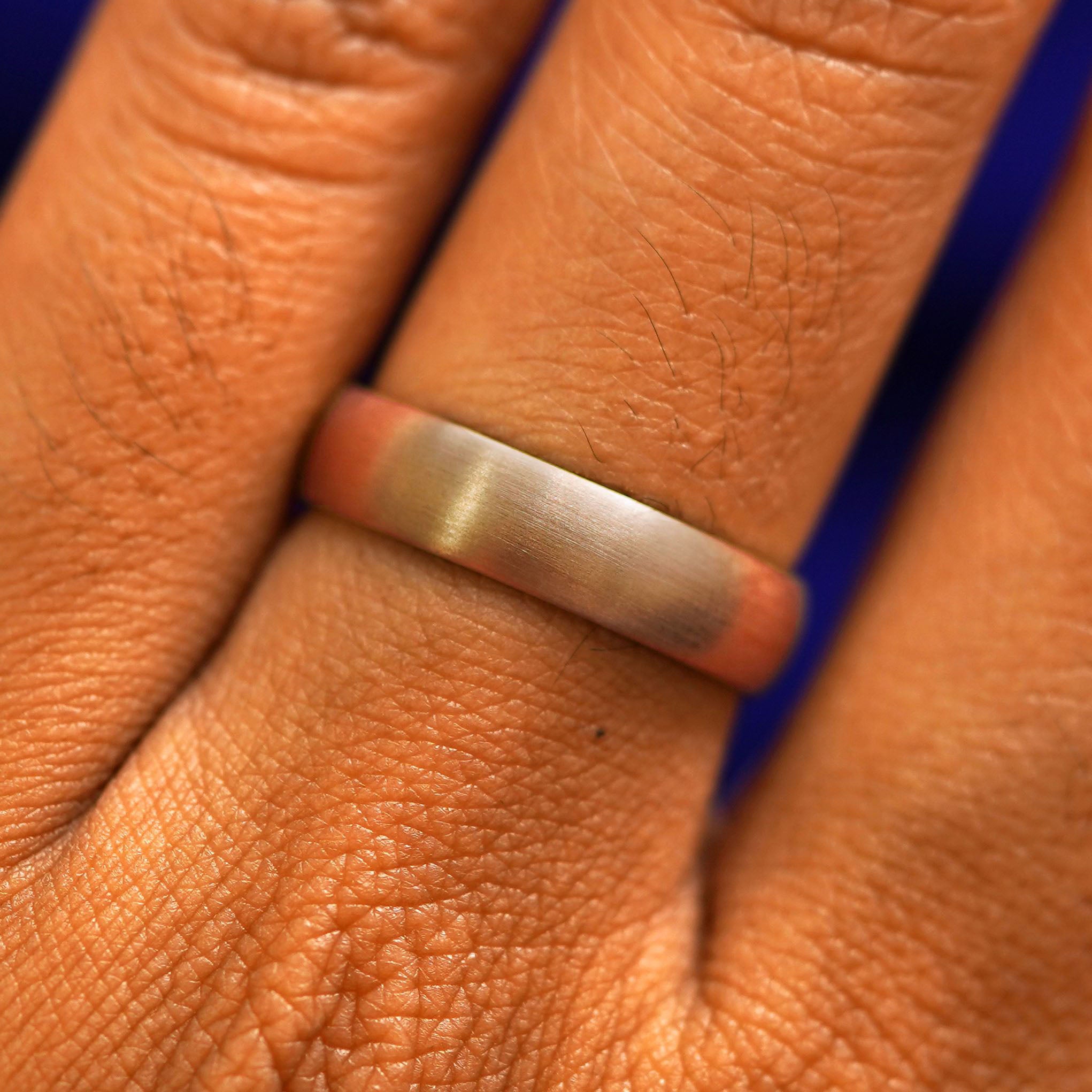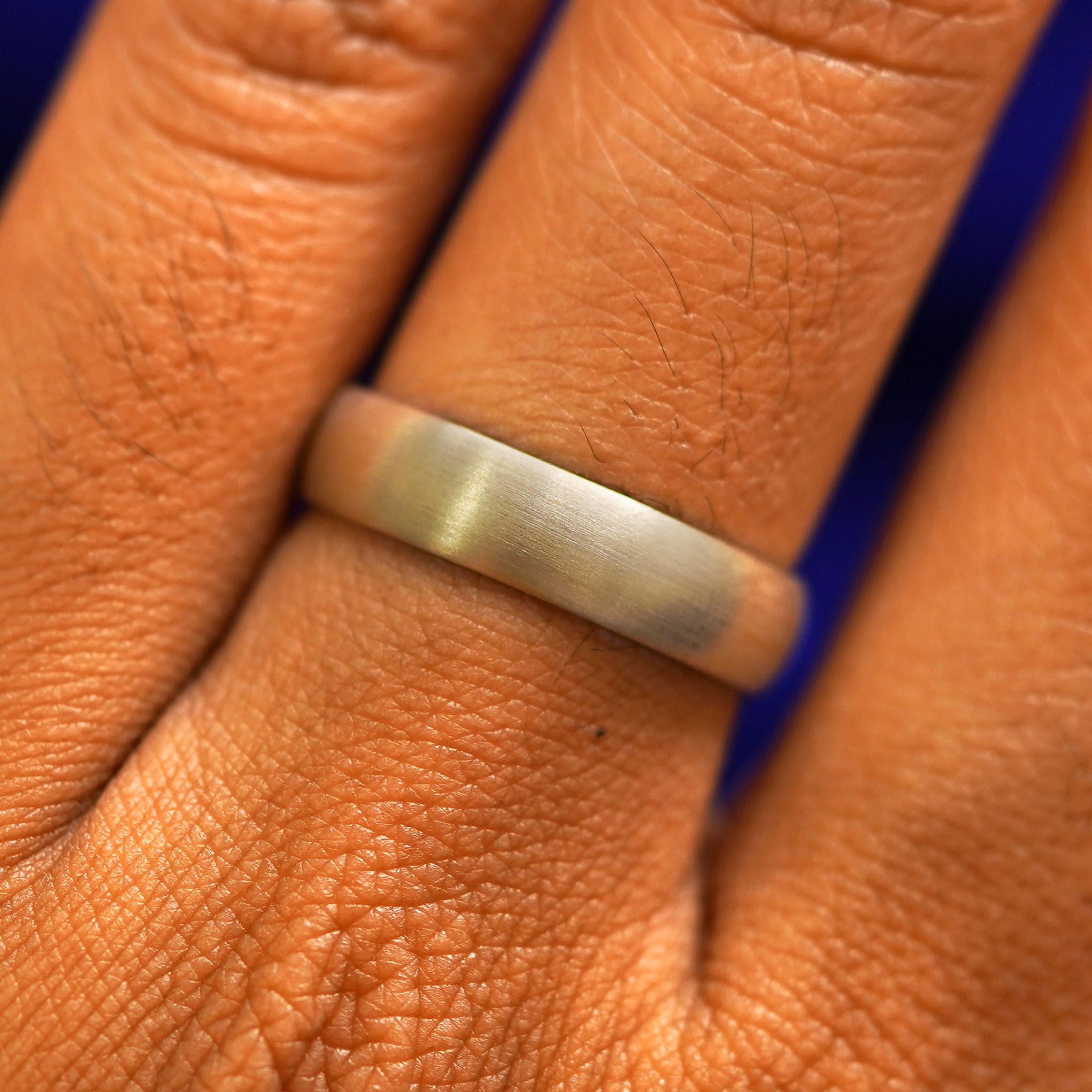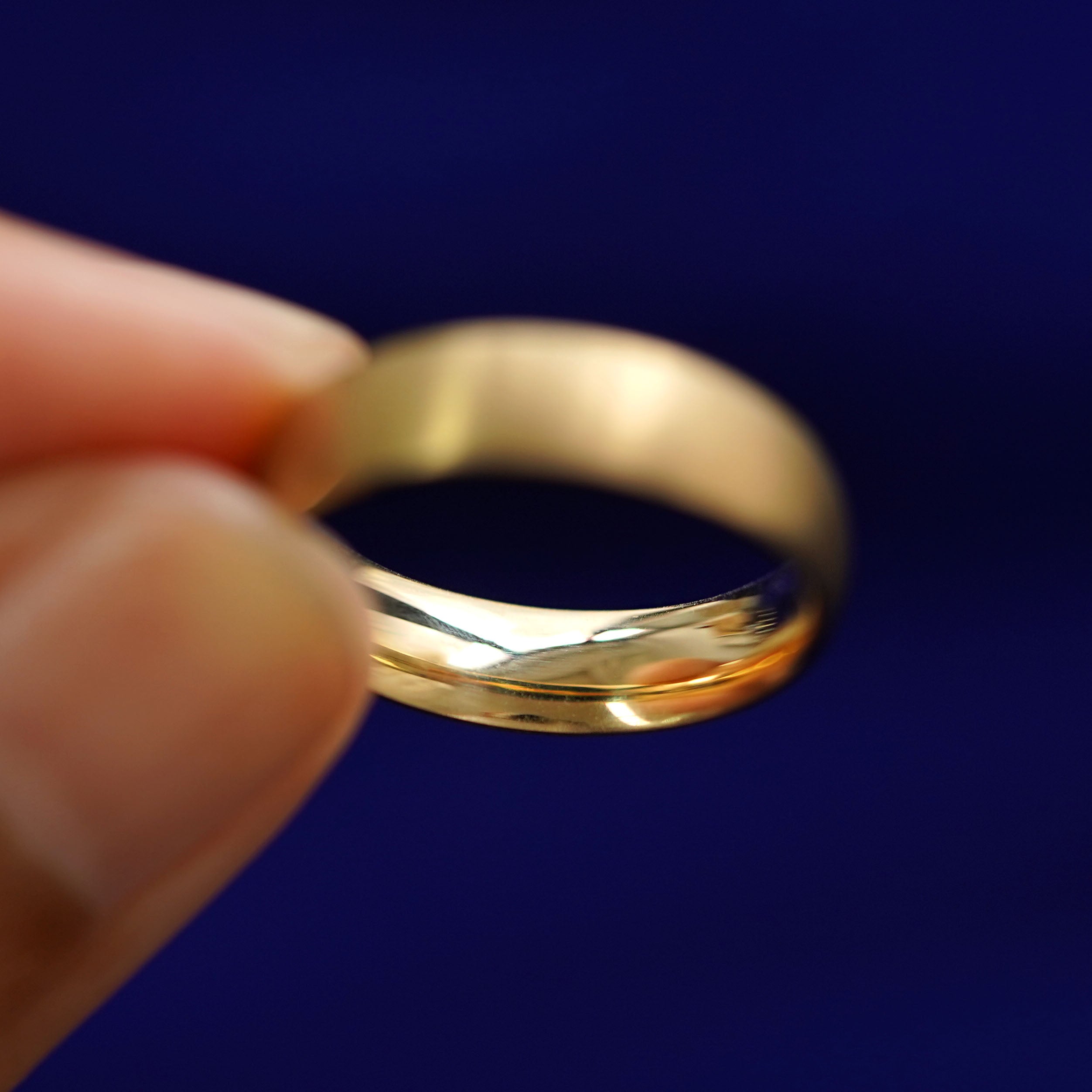 The Matte finish of this 14k solid gold band gives it an even reflection that is subtle and minimal, while the soft curve of this comfort fit wedding ring amplifies the reflection’s magical glow. This matte gold ring is the perfect genderless jewelry piece. Our comfort fit band has a rounded inside edge so it slides on and off smoothly and its comfortable to wear.