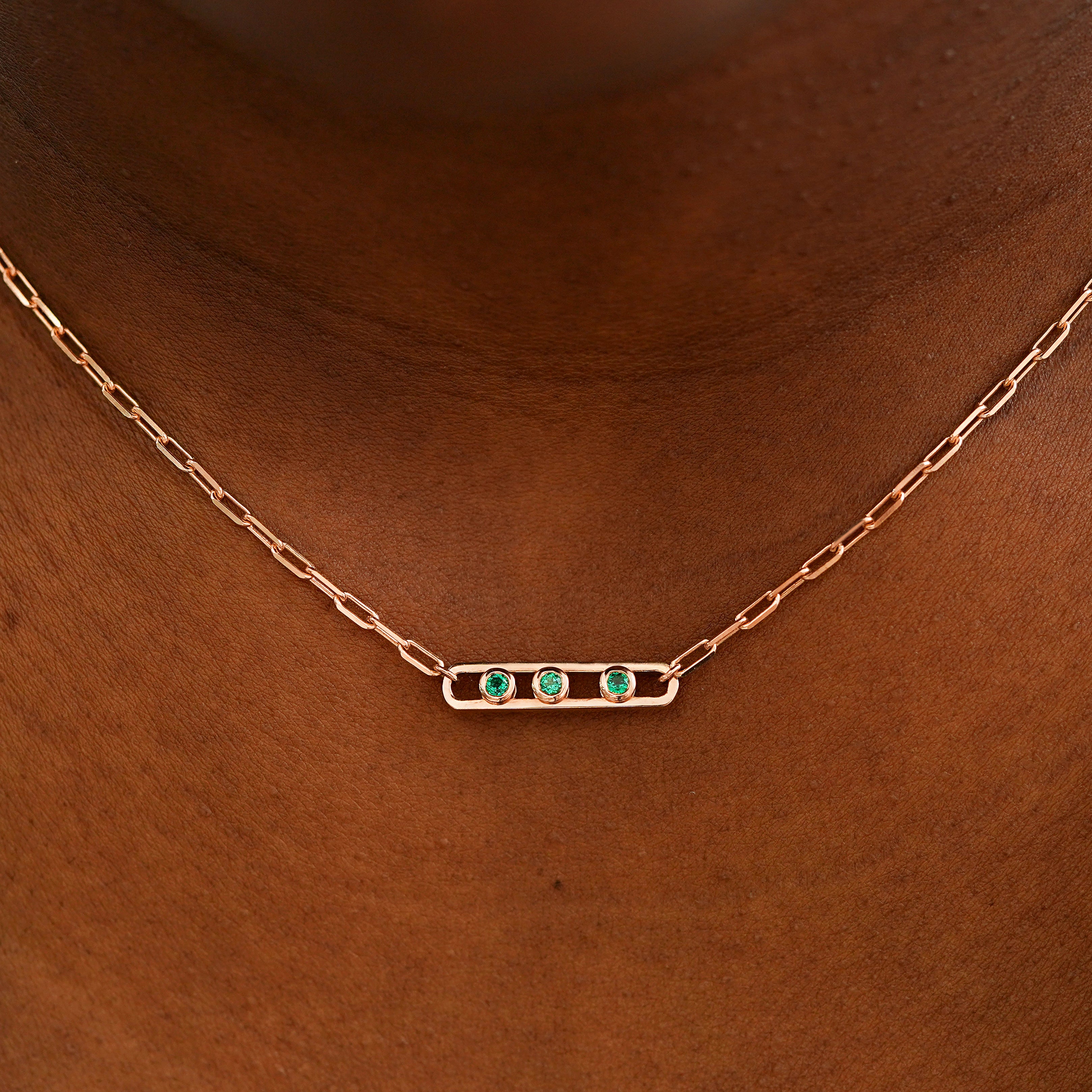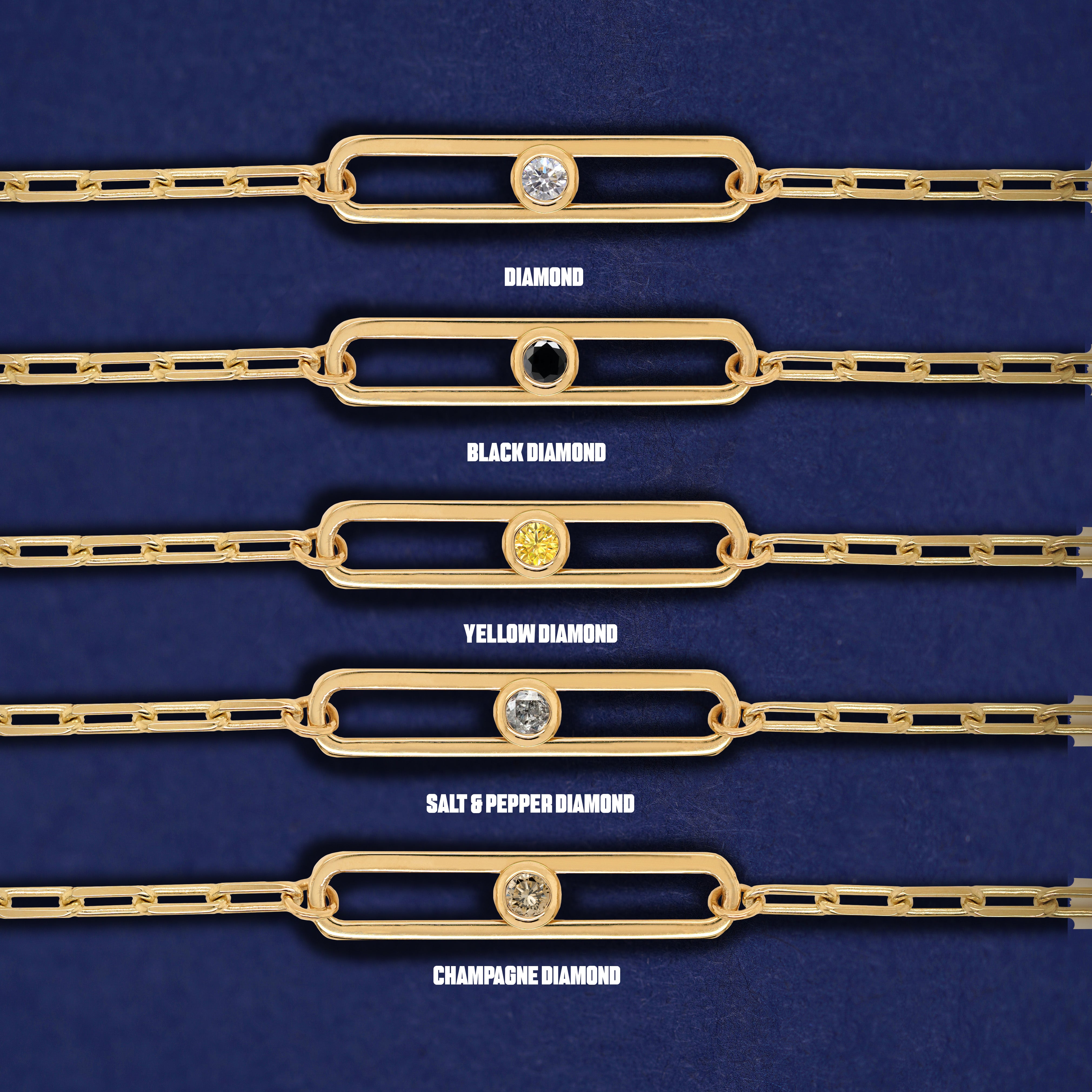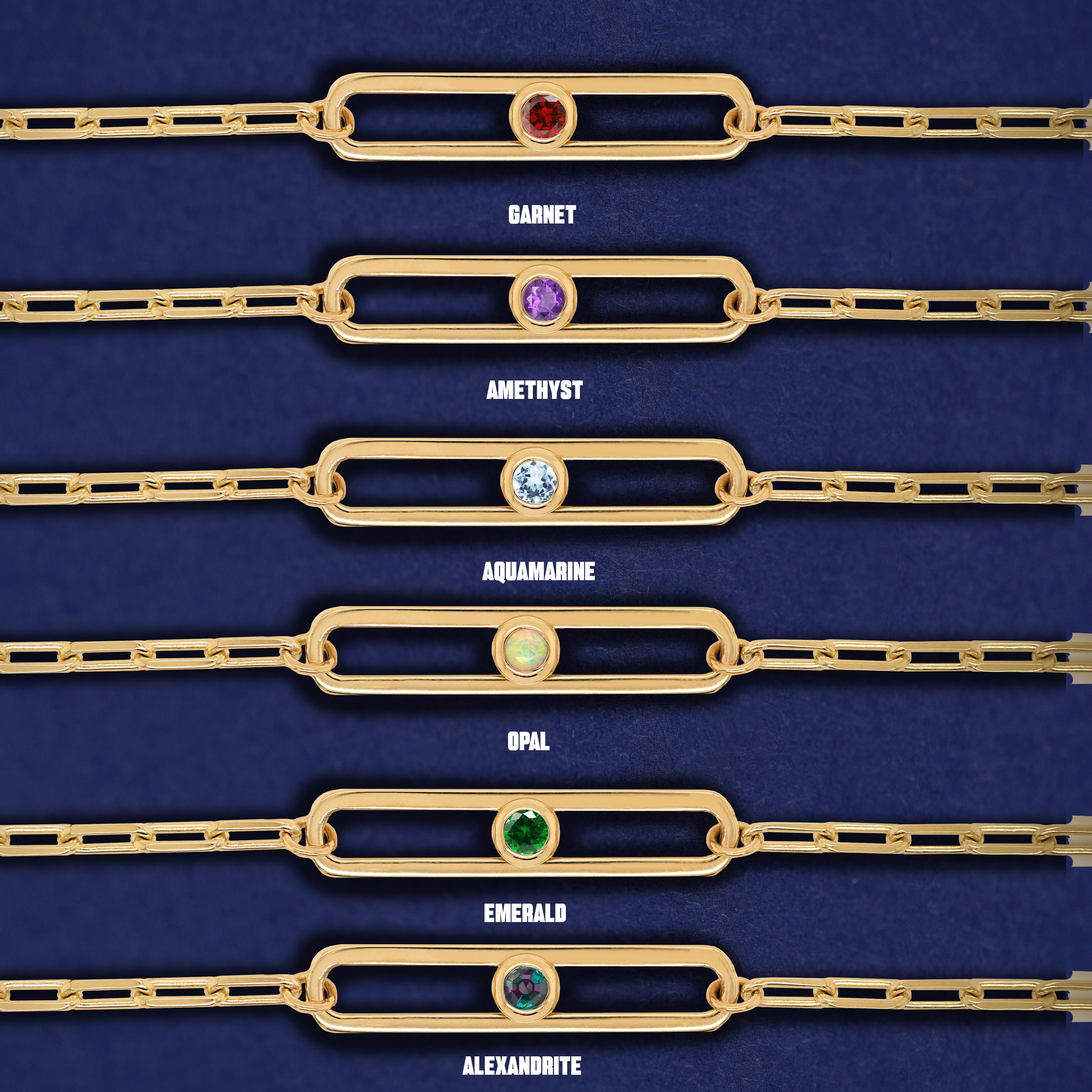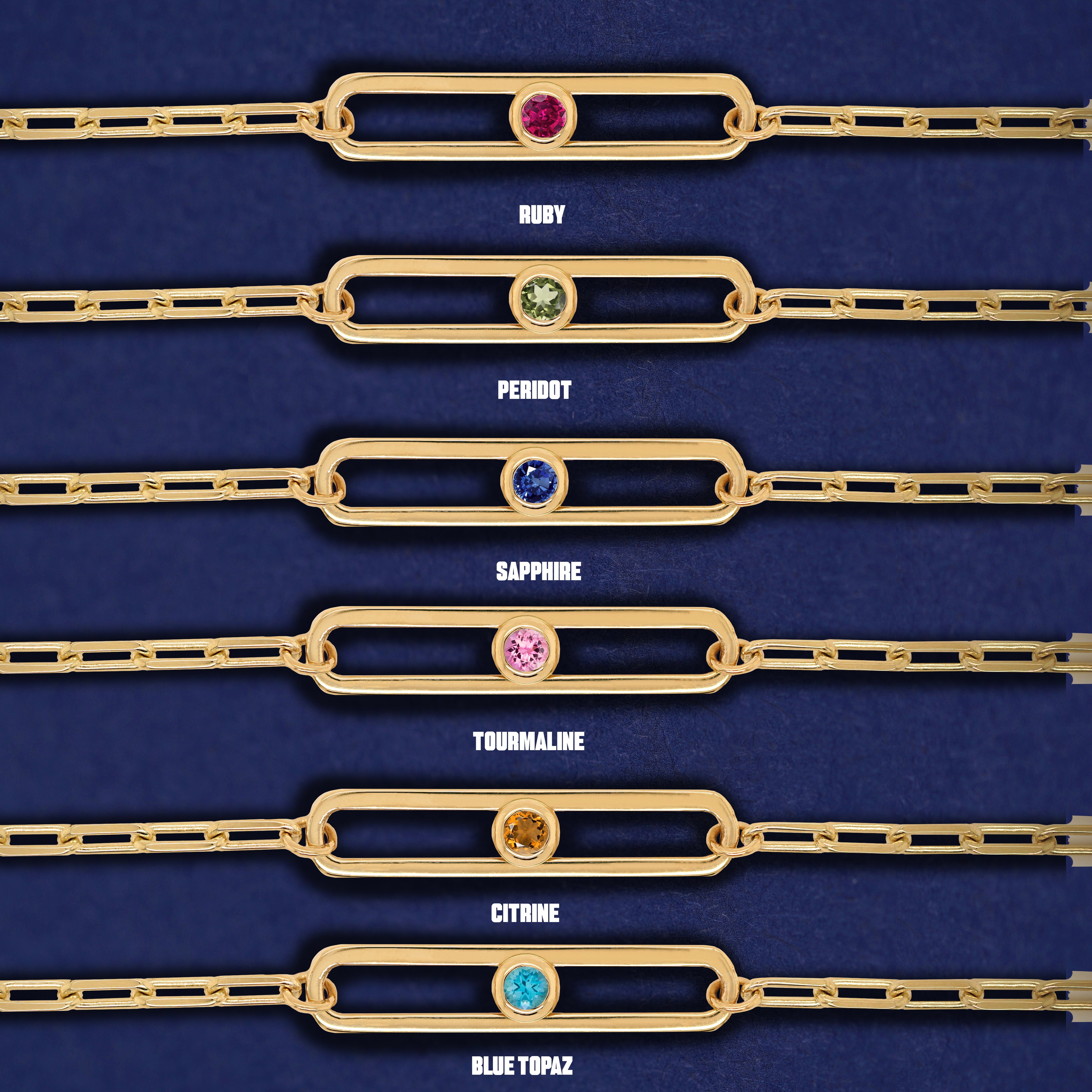 One-two-three, one-two-three…. Who wouldn’t love a dance with these sparkling gemstones? This gorgeous 14k solid gold necklace features a chic open oval on our durable 19 inch Butch Chain. Add one, two, or three gemstones that will glide and slide inside the open oval link in a glittery, shimmery dance.