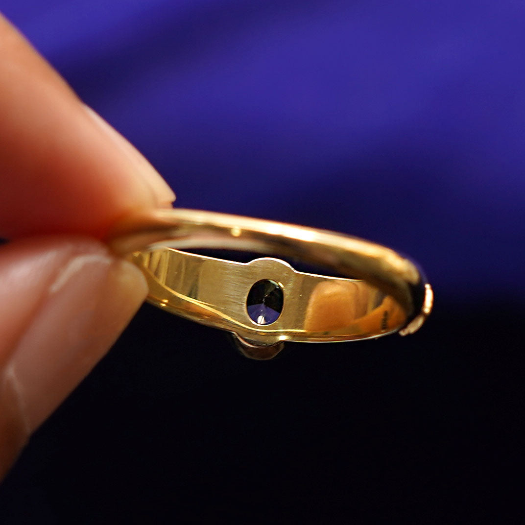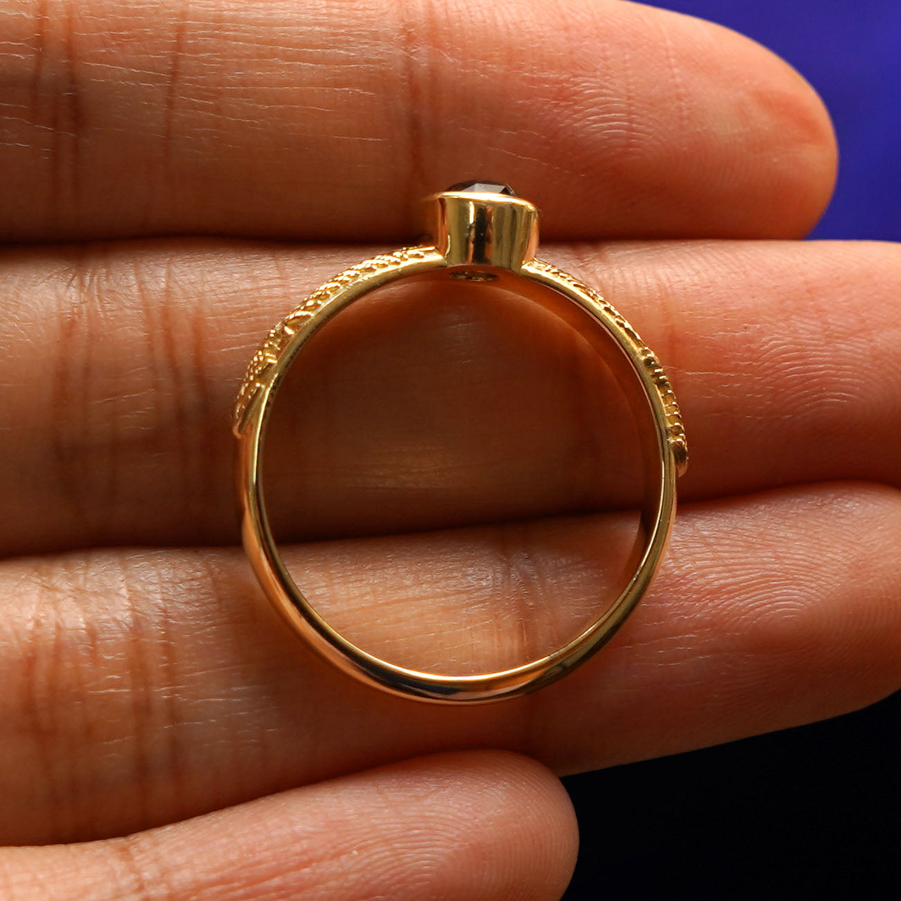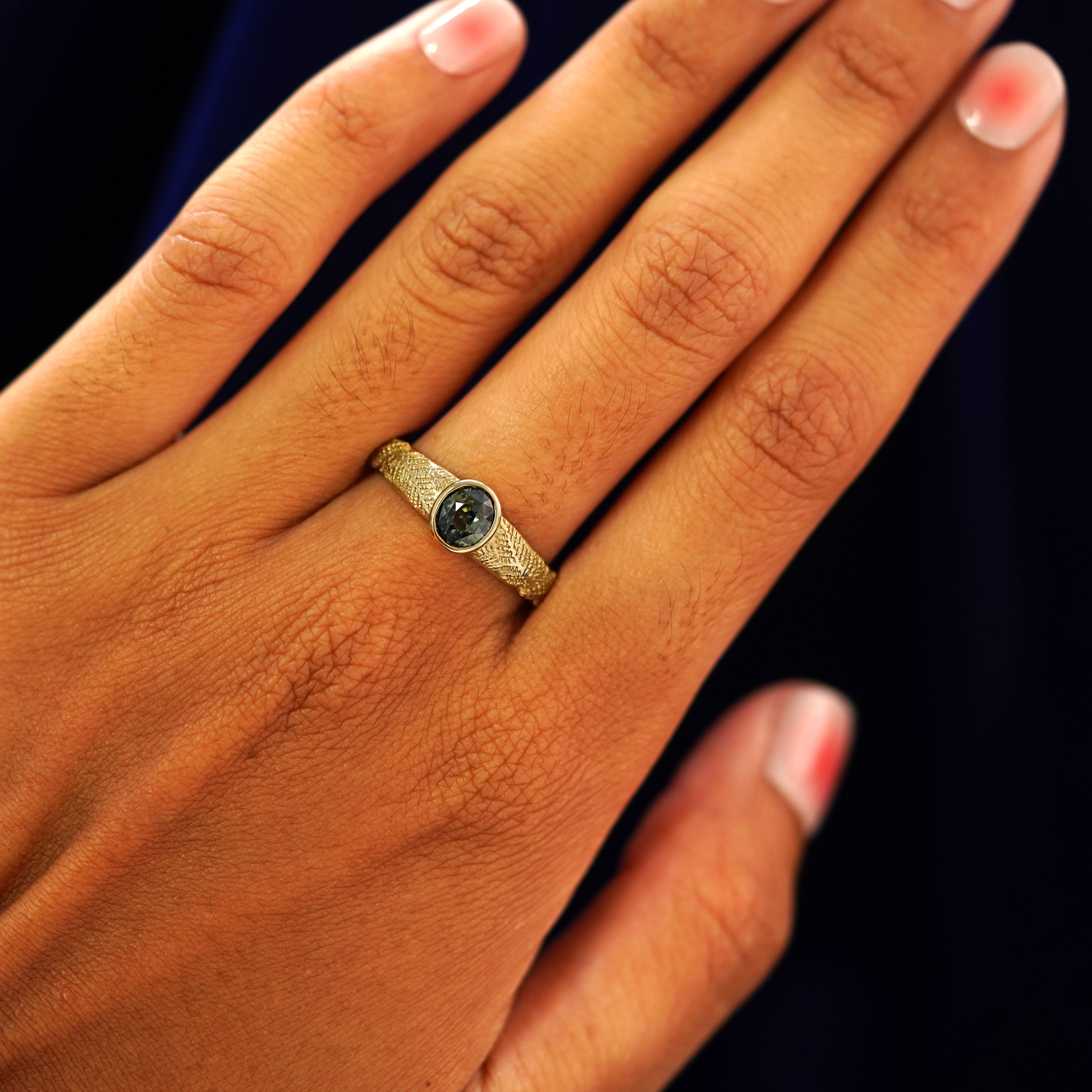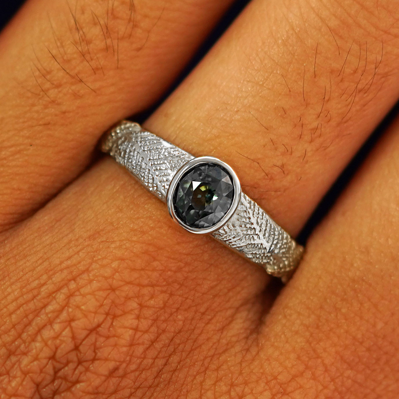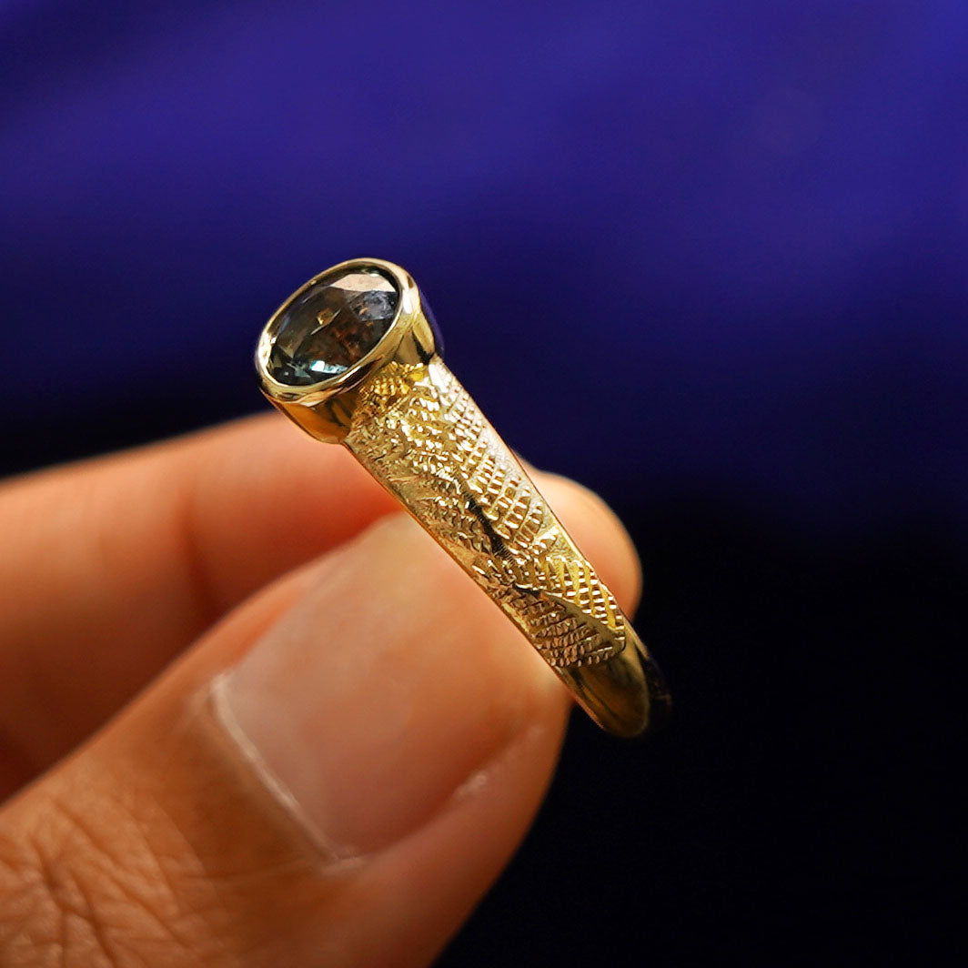 “This one is for the forest lovers like myself. I love the pine texture on the top, and the light green flashes in the dark sapphire complete the forest vibe. Interesting fact: The sapphire I chose for this ring is from Montana and this particular pine is also the state tree of Montana.” - AL (founder of Automic Gold)