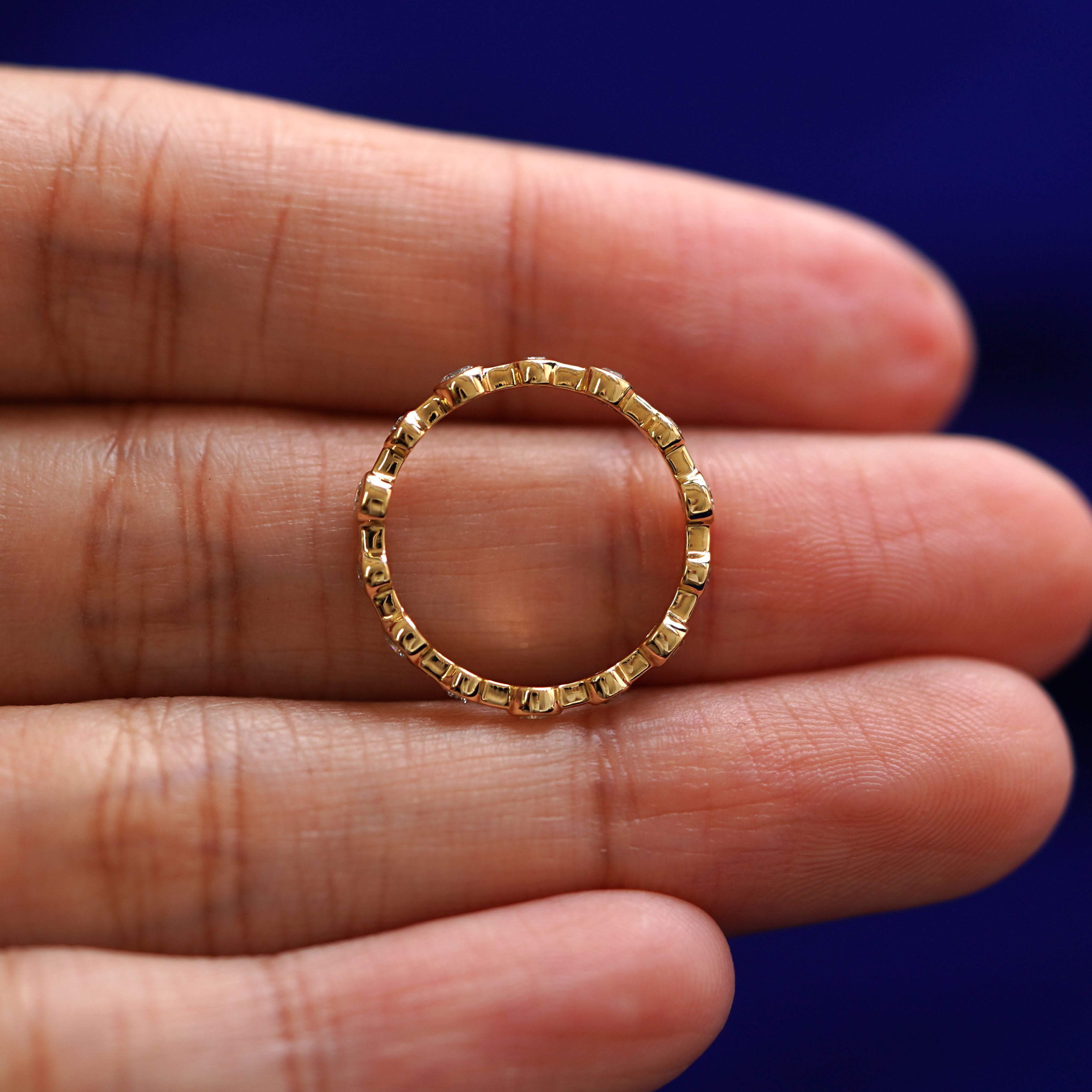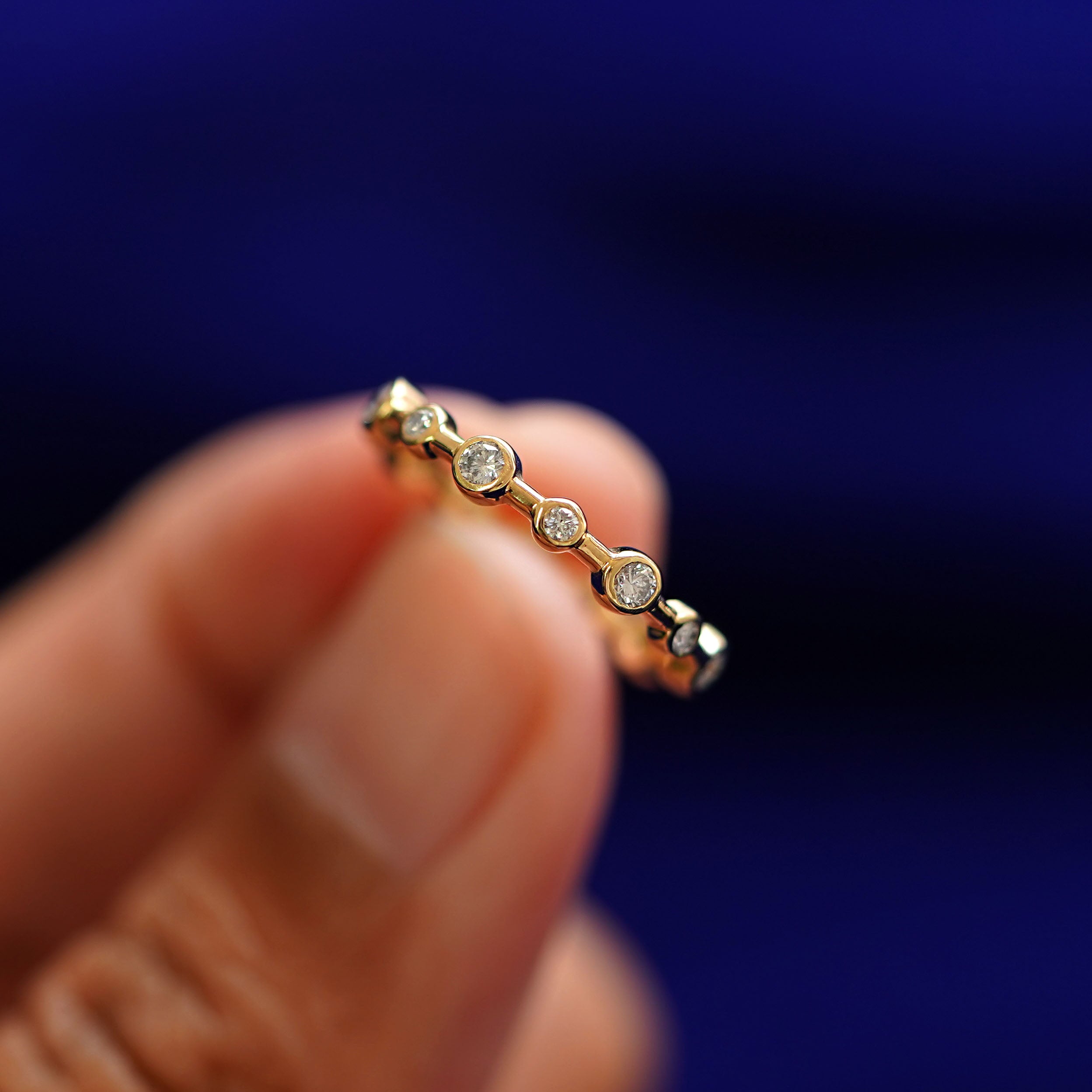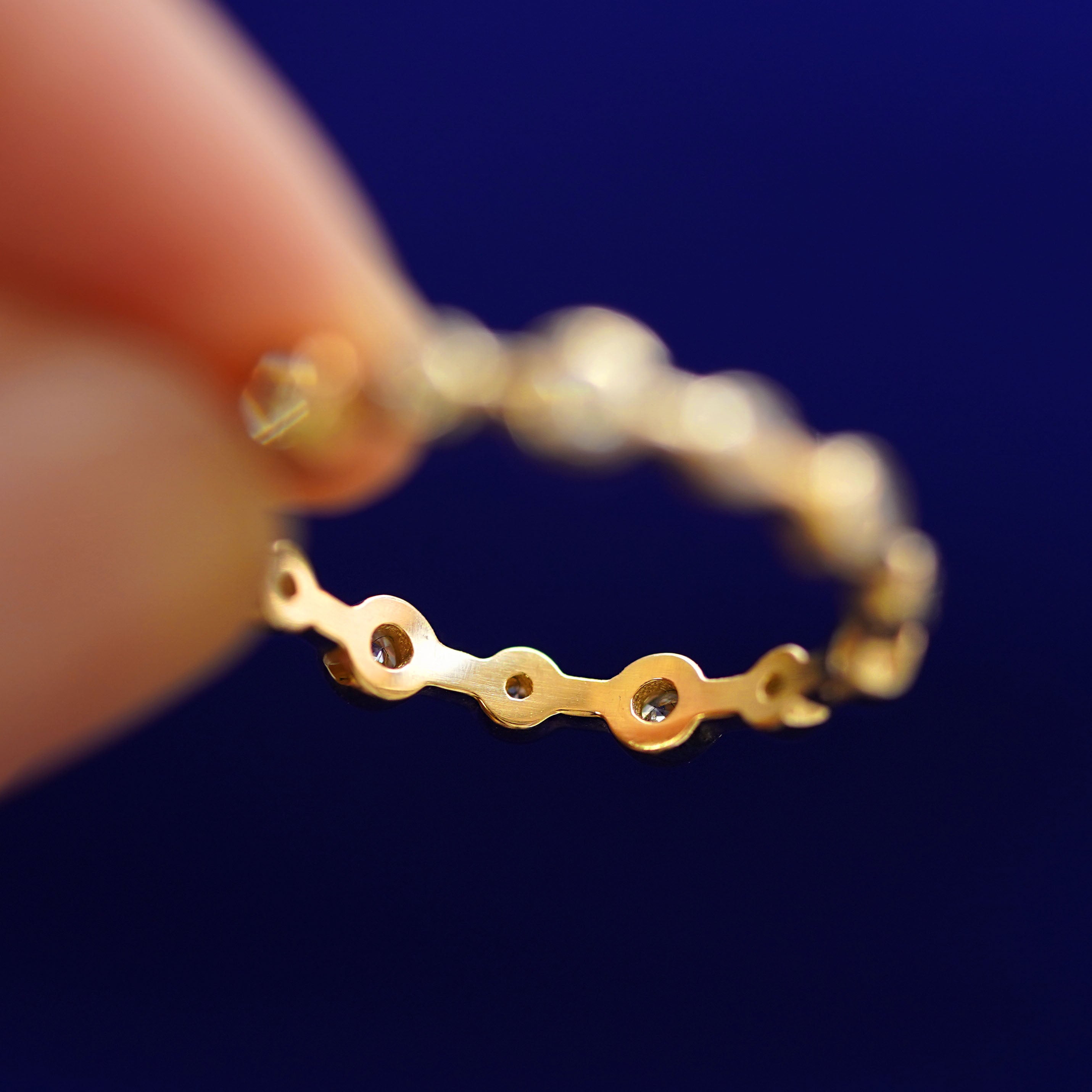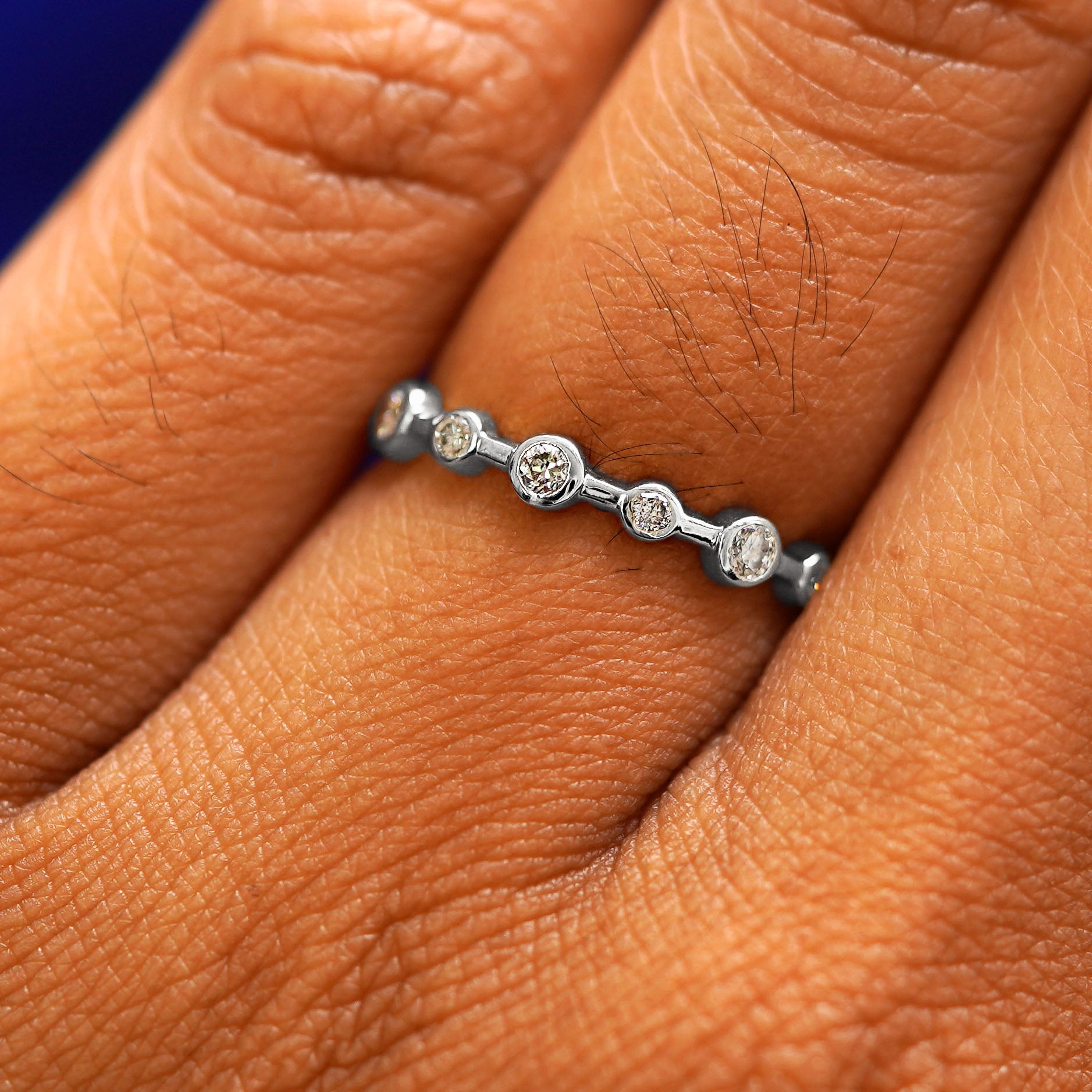 Our beautiful diamond bubble ring is perfect for any occasion. This glittering eternity-style ring features alternating 1.5mm small and 2mm larger diamonds infinitely through the solid gold or platinum band. Diamonds go with everything and this gorgeous diamond ring is the ultimate everyday jewelry piece. Wear this band as an everyday staple, gift it as an anniversary ring, or use it to ring in your wedding!