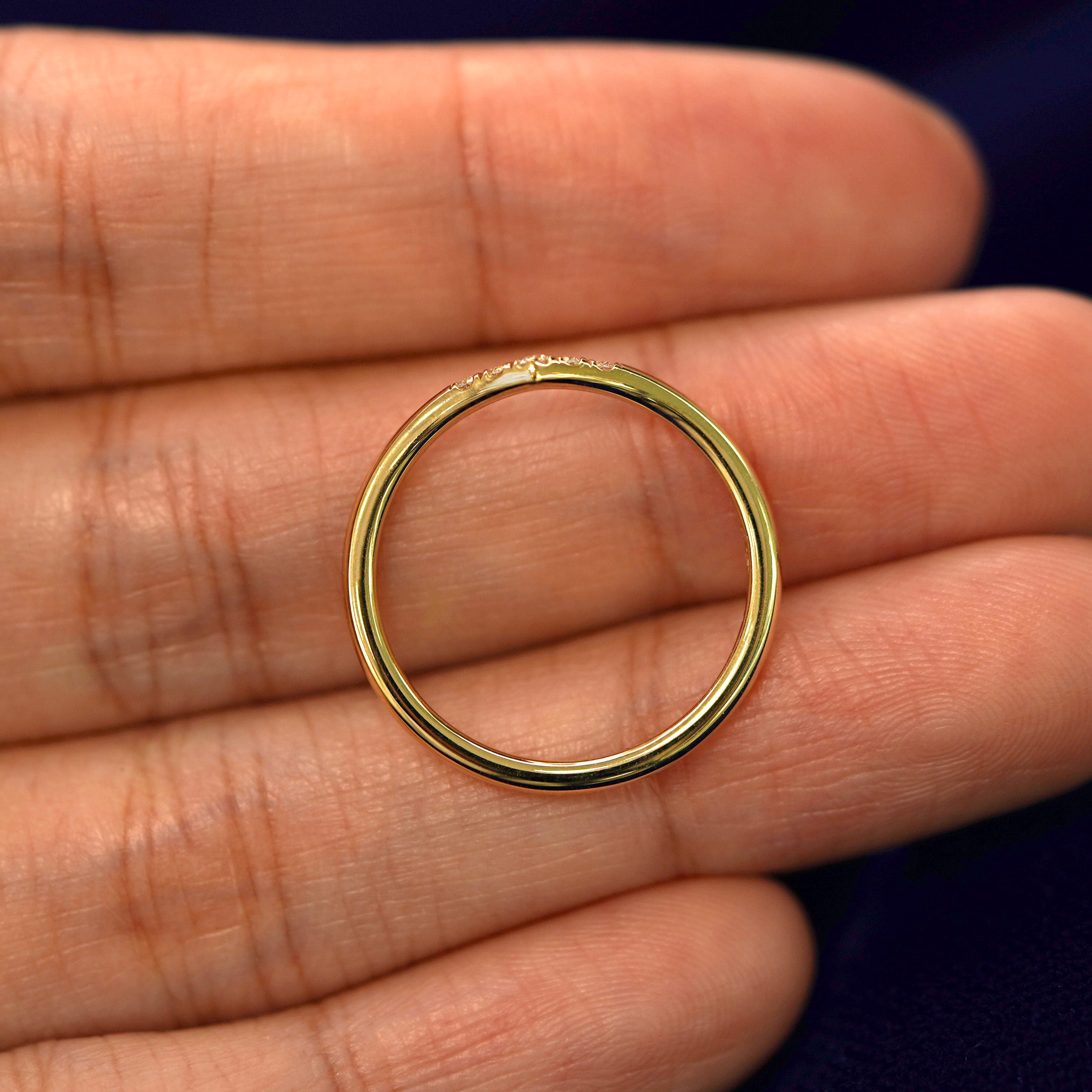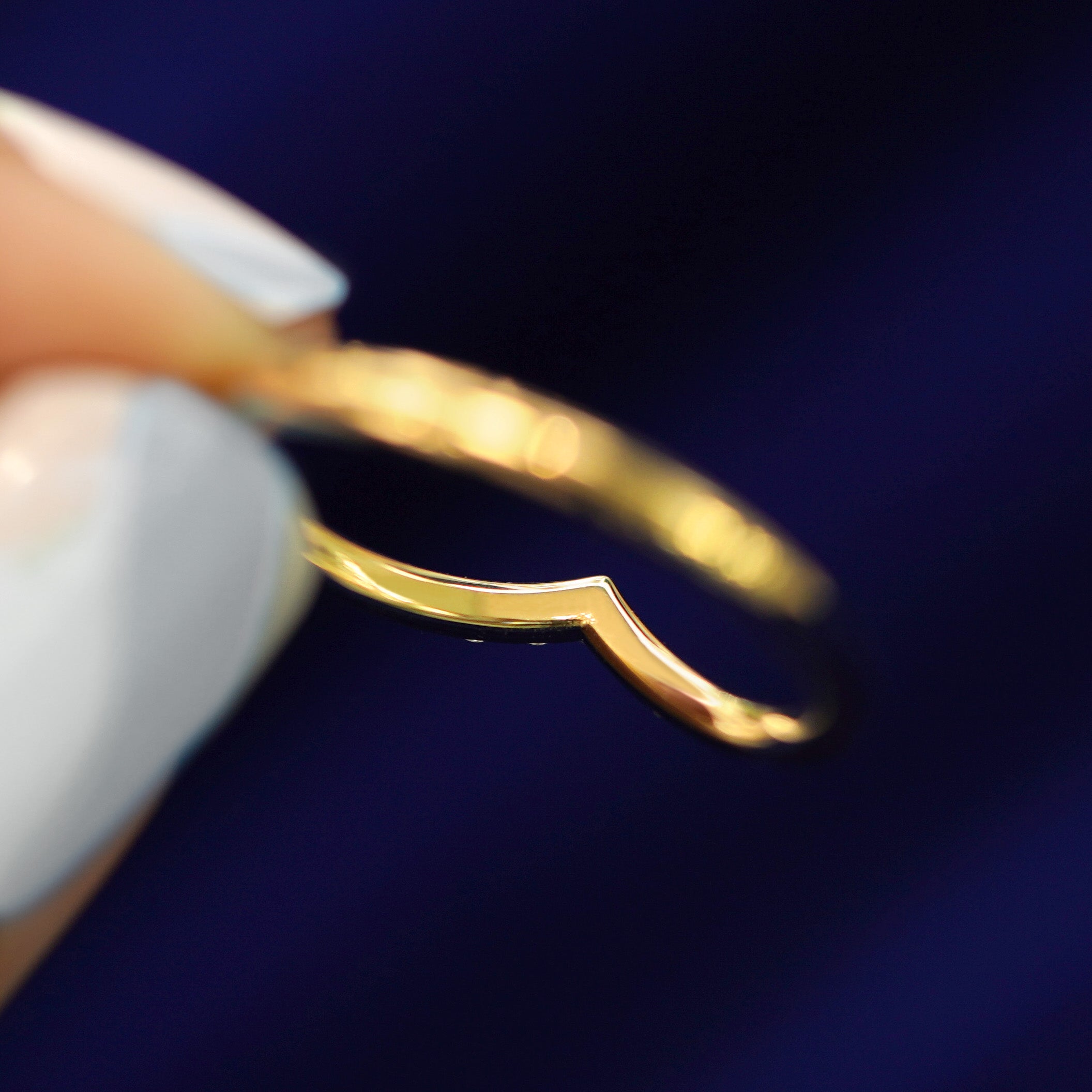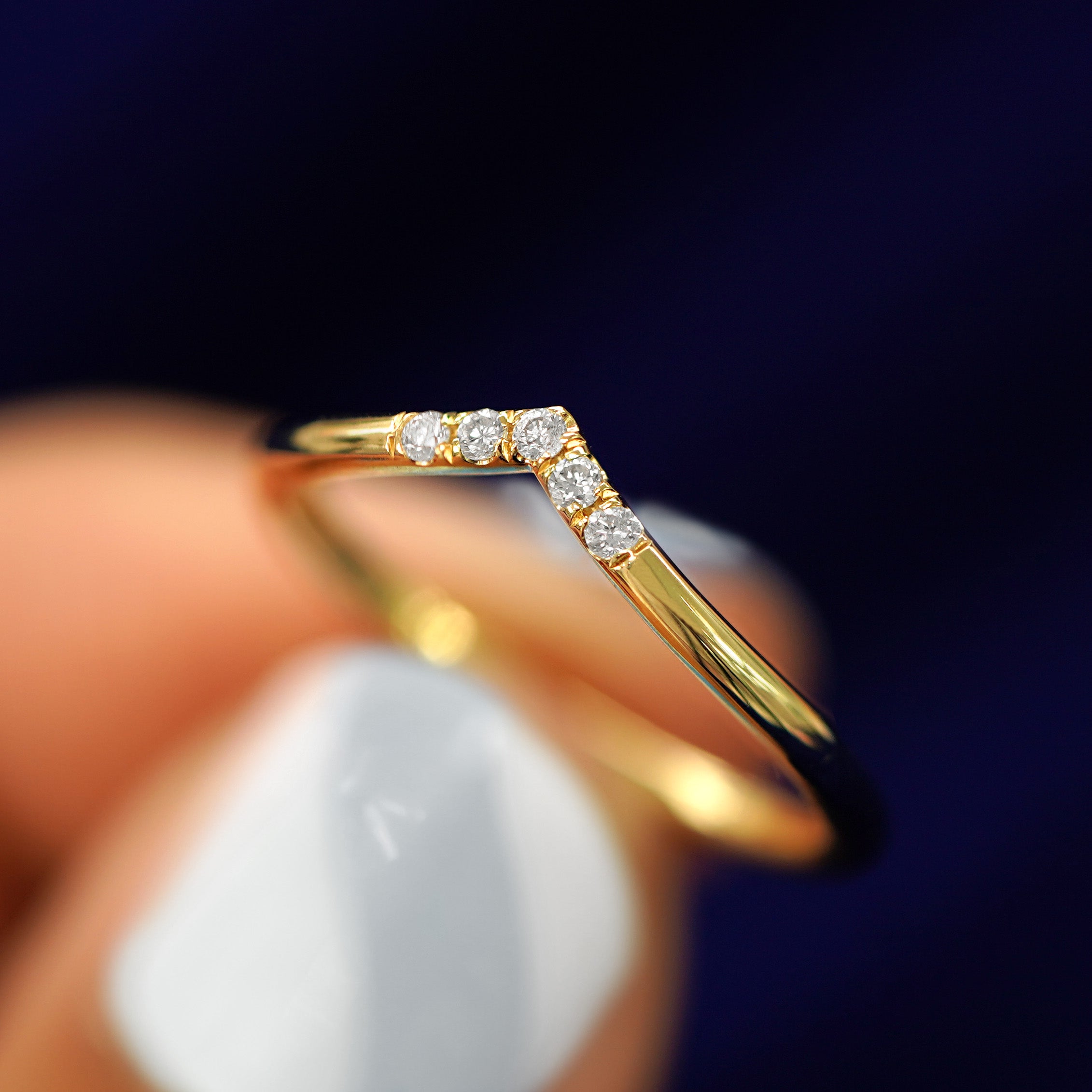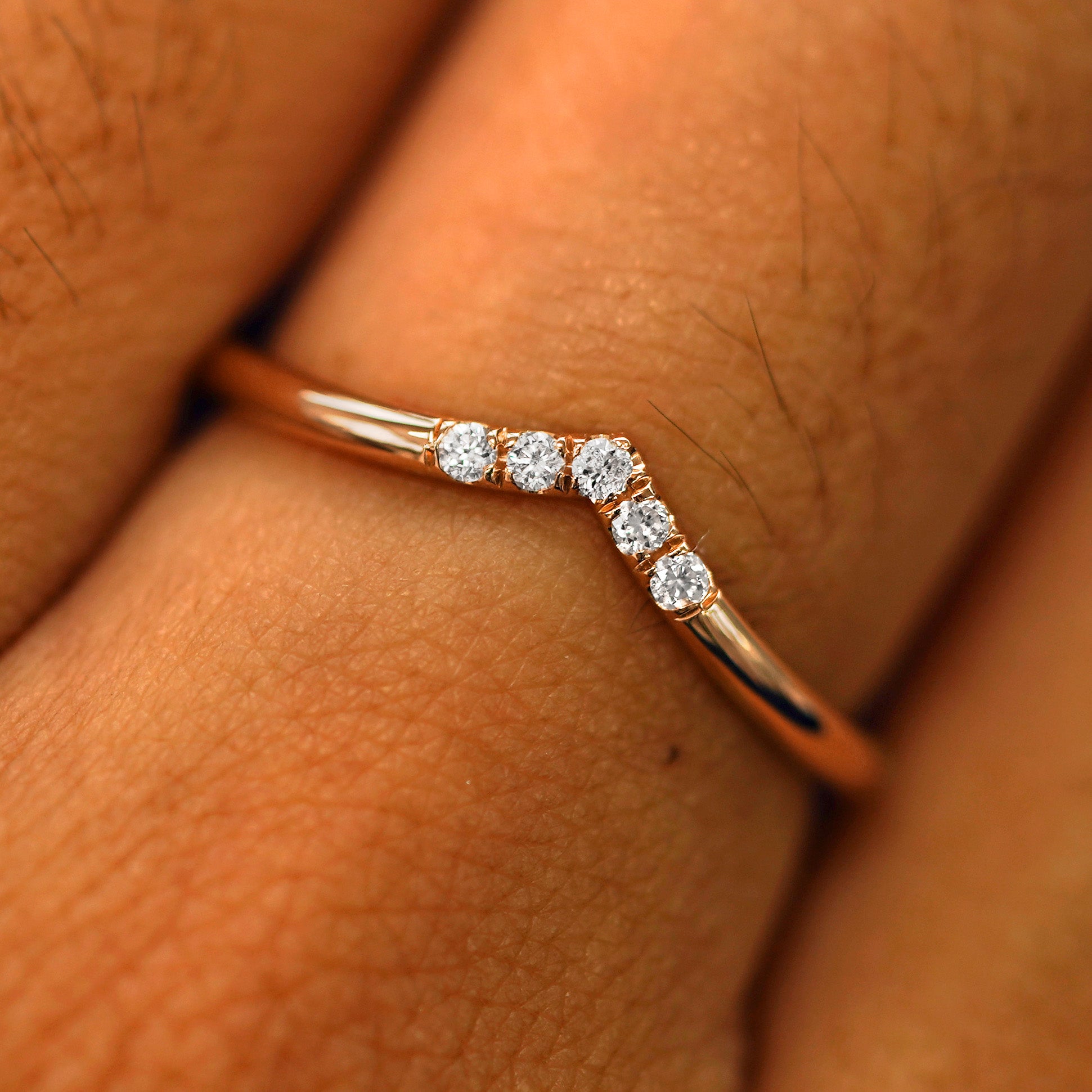 A classic style with a little sparkle, this diamond chevron band has a remarkable look that will complement any engagement ring. 5 glittering reclaimed natural diamonds are set into the v-shaped bend on this solid 14k gold or 950 platinum band. A high polished finished makes the entire piece shine.