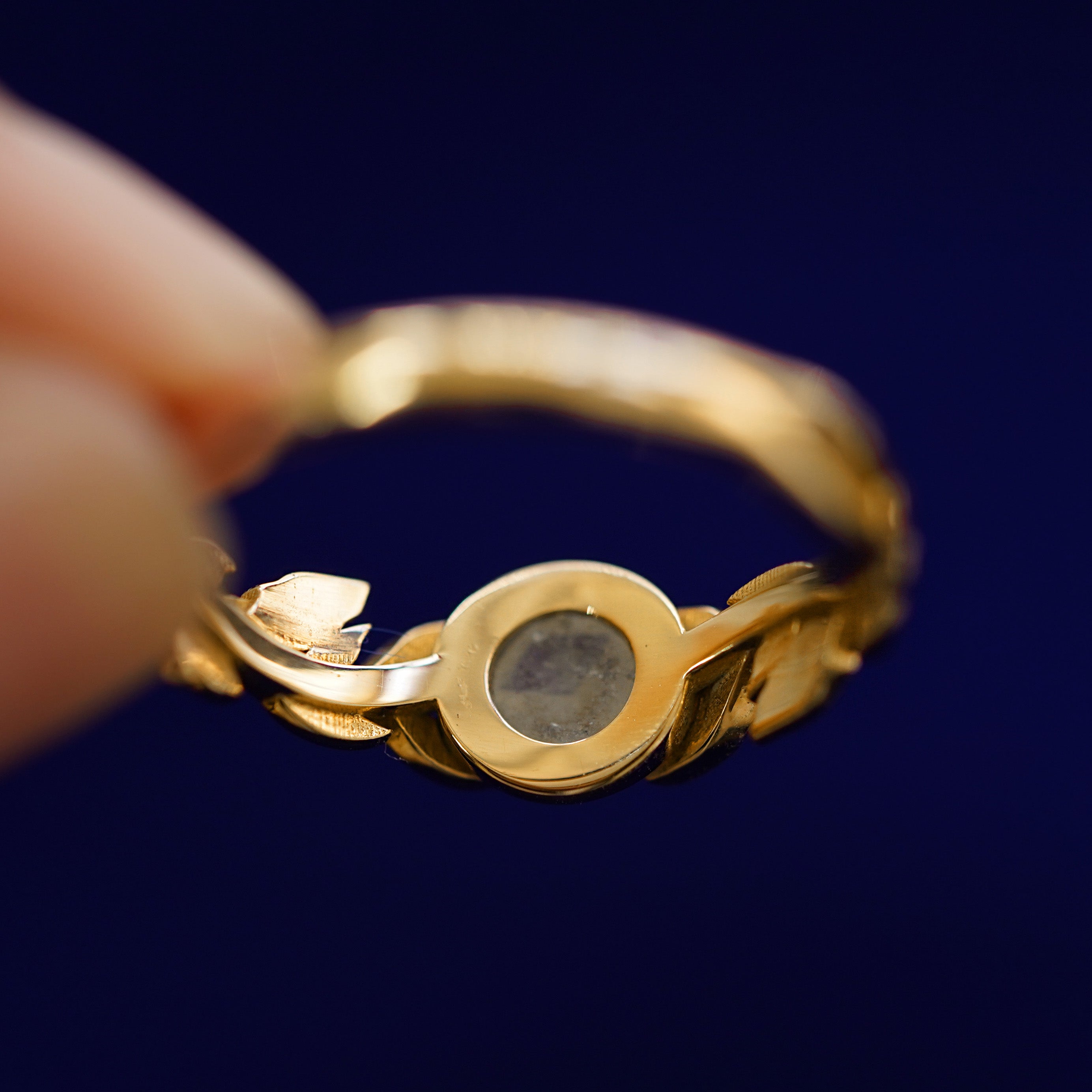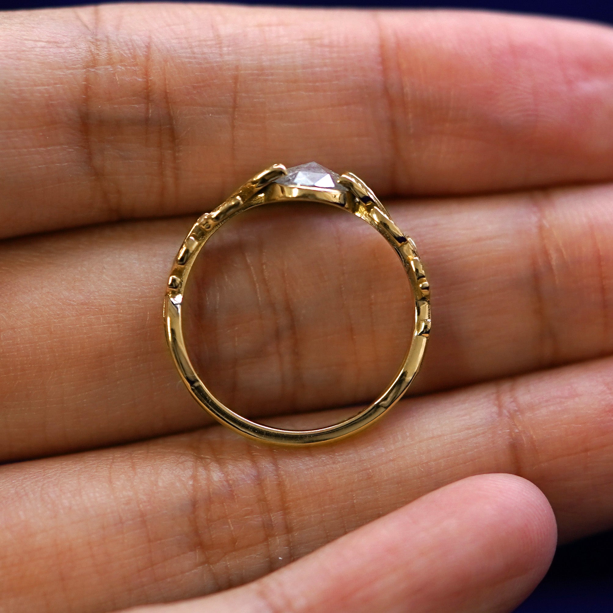 The perfect balance between elegance and earthiness, this Diamond Leaves ring features a rose-cut diamond with salt and pepper inclusions for a natural feel. Each leaf is hand-engraved on the recycled platinum or solid gold band, and they frame the diamond centerpiece beautifully. This incredible sustainable ring is perfect for plant lovers.