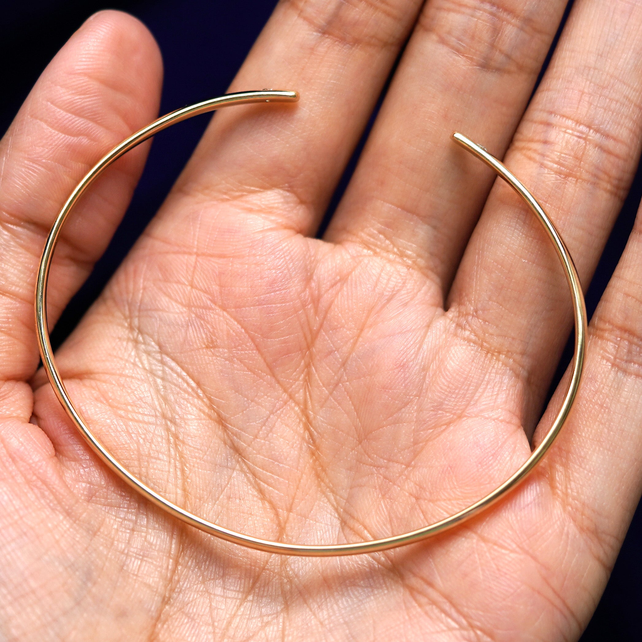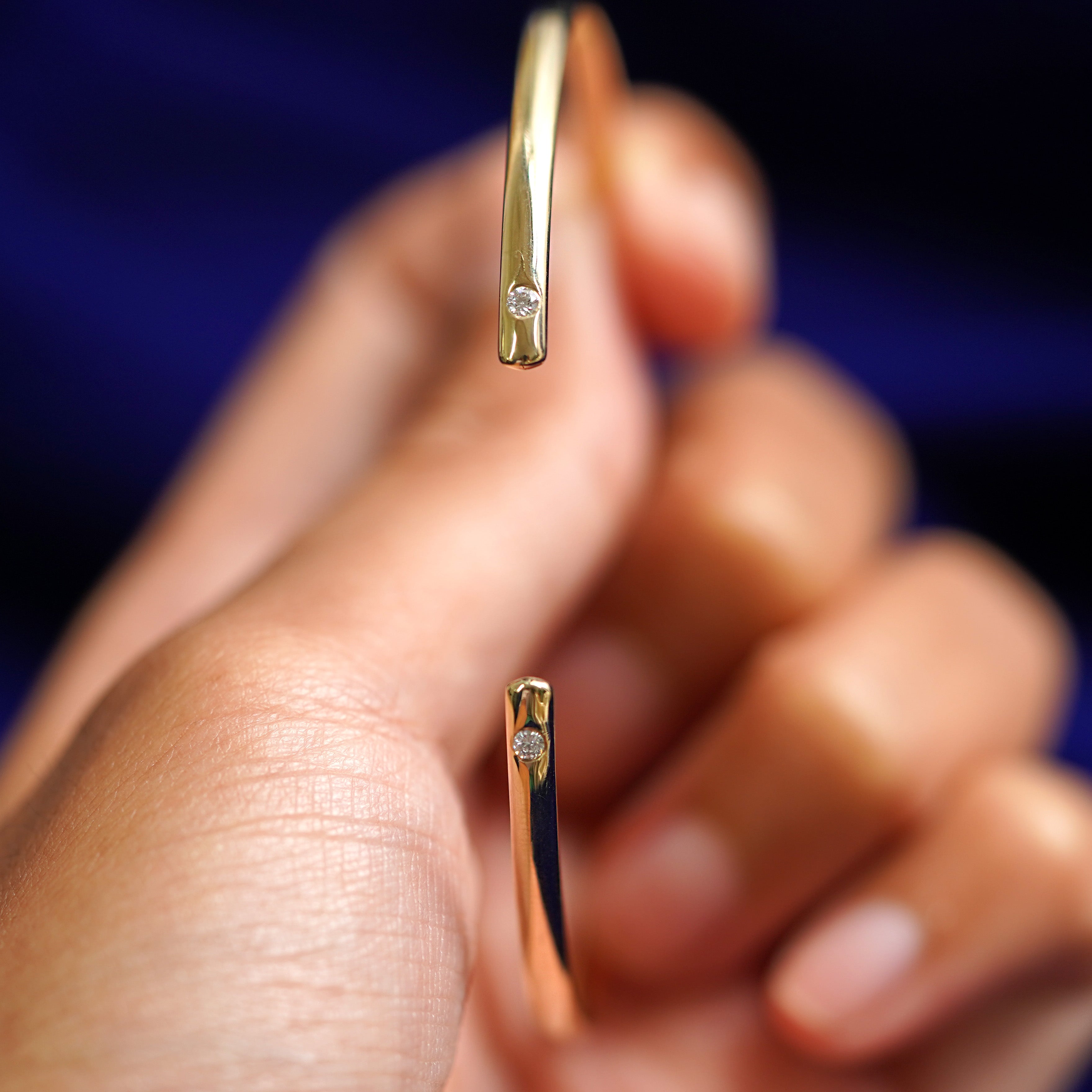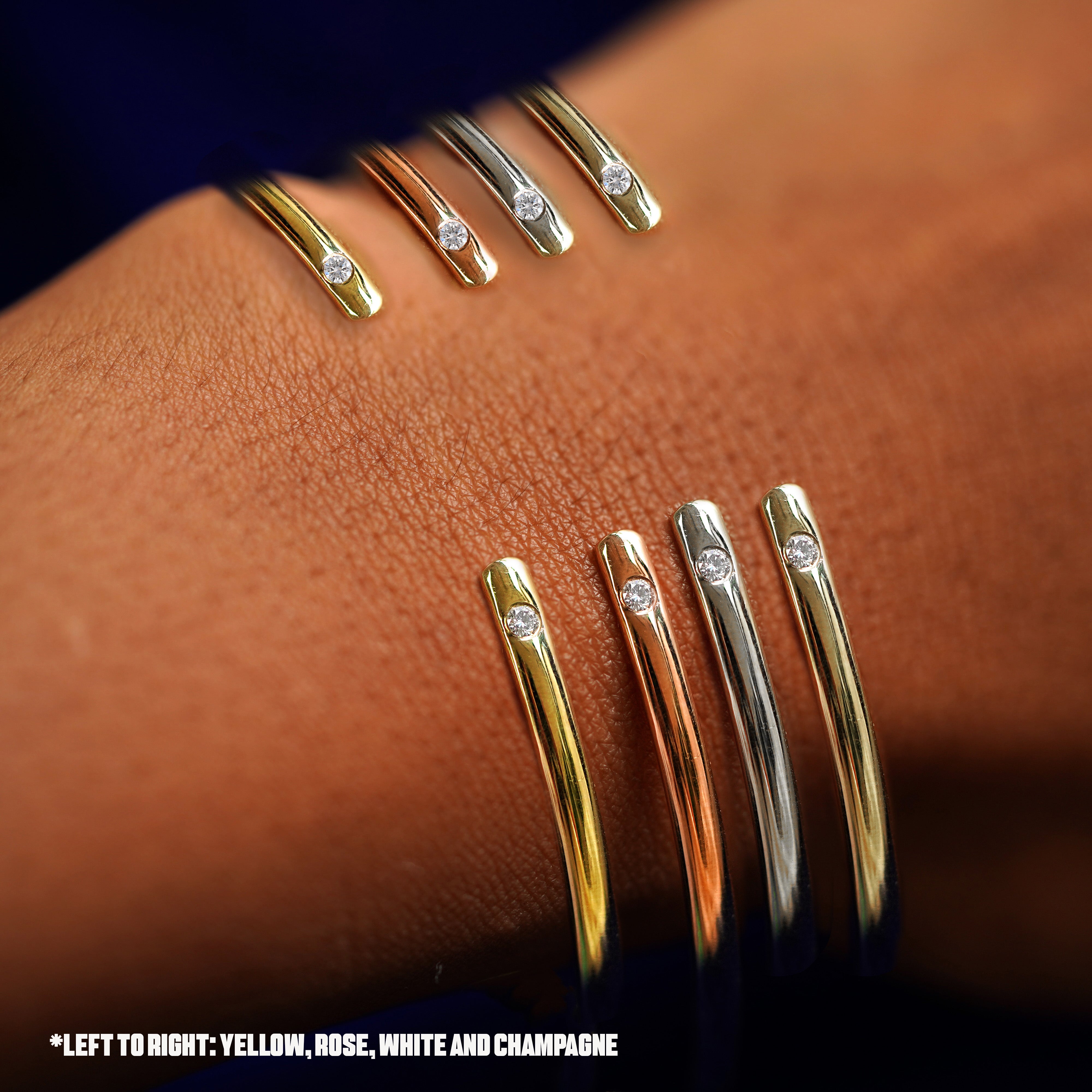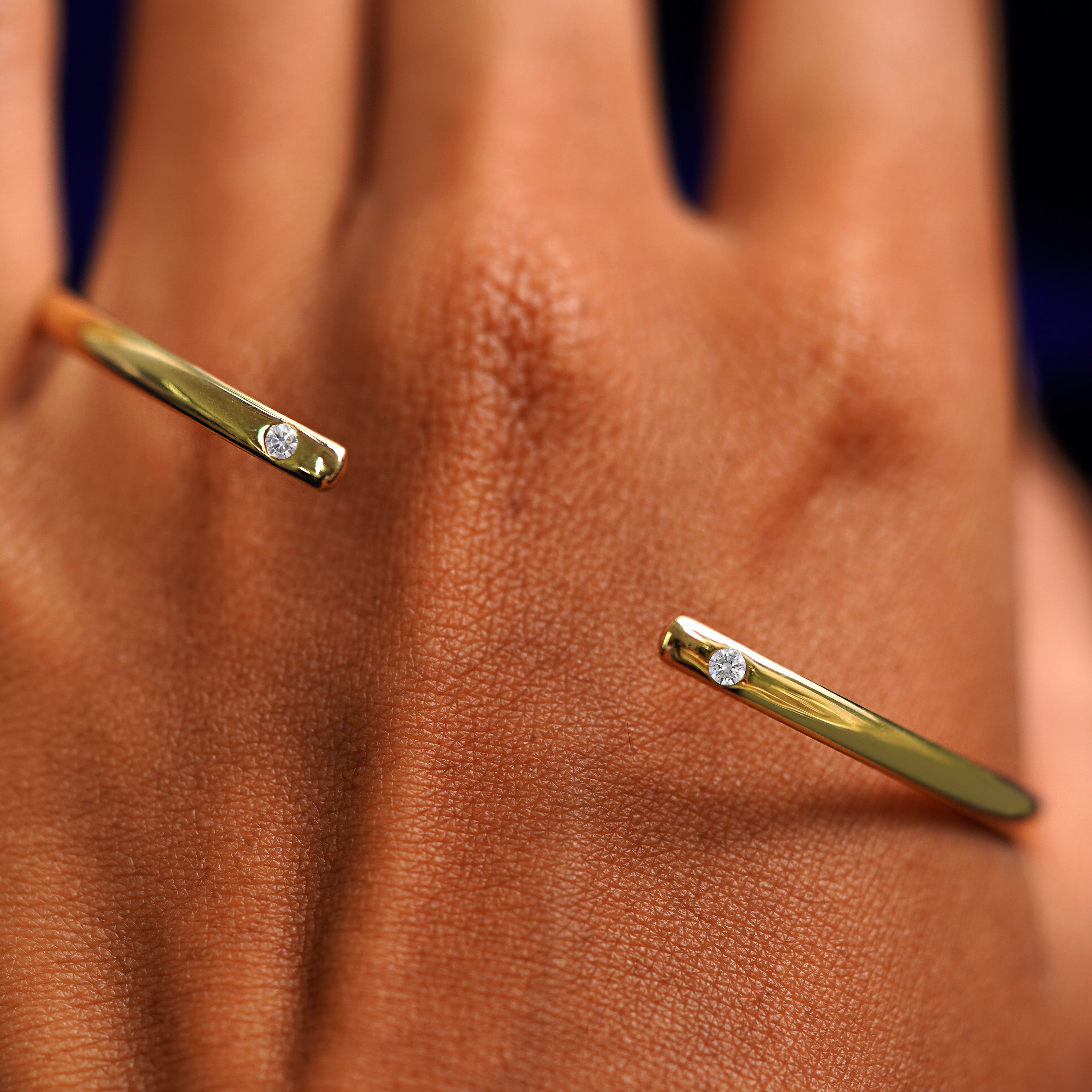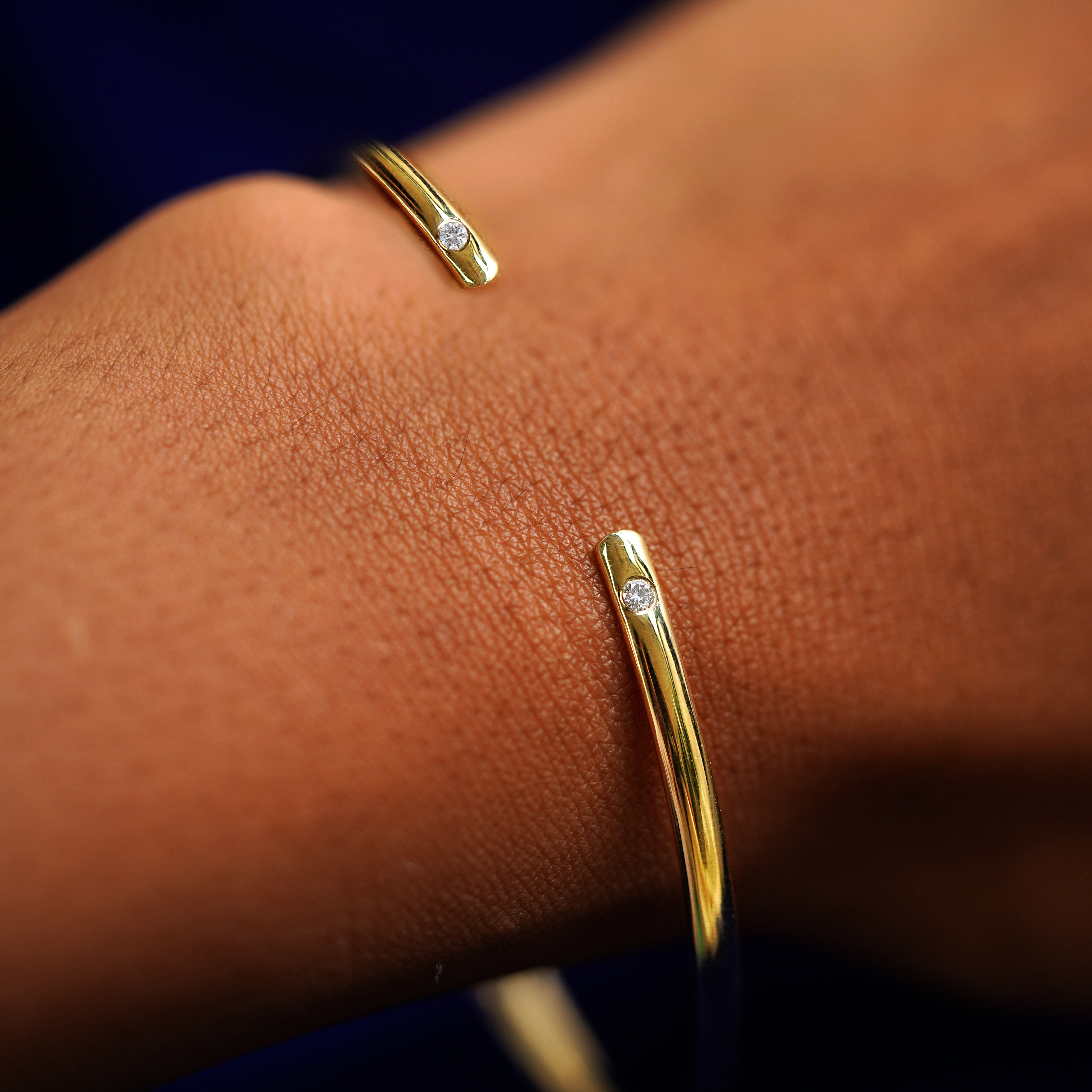 This Diamond Open Bangle Bracelet is easy to put on and will stay put. The perfect piece of solid gold jewelry, wear it diamond side up or gold side up to switch up your look. This cuff bracelet is minimalist jewelry with maximum sparkle.