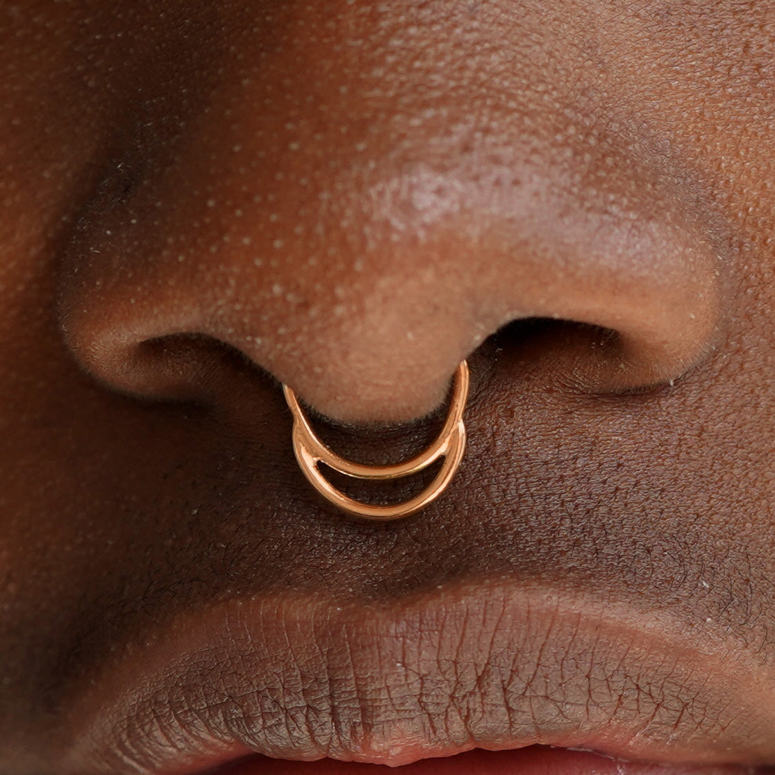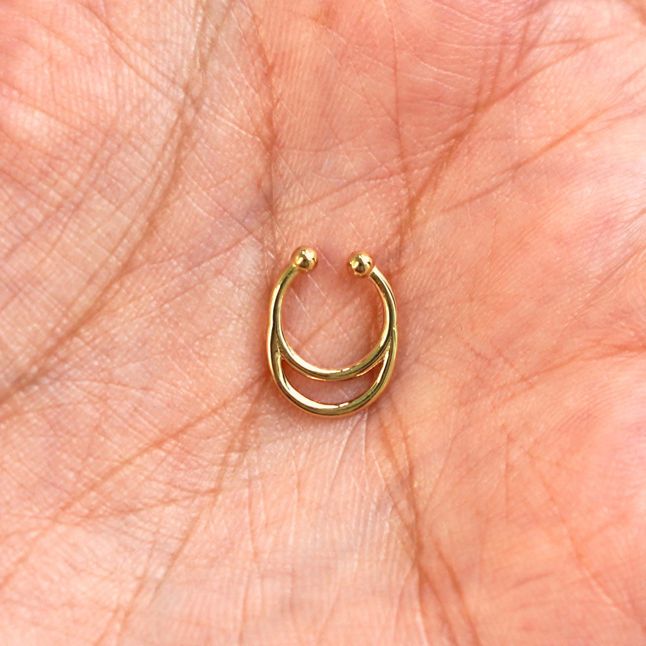 A spin on the classic hoop body piercing, this fabulous double circle septum ring has double the style! With both non-pierced and pierced options, this delicate 14k solid gold beauty is perfect for everyone. Body jewelry without the worry, whether you need a faux septum ring or can rock the real thing, we’ve got you covered!