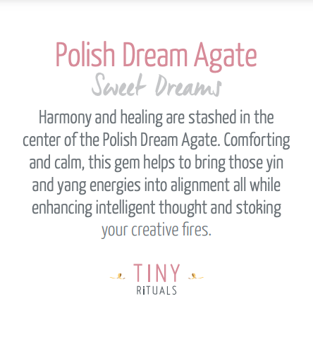 Dream Agate is ethereal and earthy. Like all forms of agate, this gemstone works softly to bring you into sweetness and ease and gives you the key to access your inner power. Agates are earth stones and can be considerably less intense than some of the other crystals you may come across. They are no less potent in their healing powers but instead, they send their energy rippling through like a stone skimmed across the water rather than waves crashing against the shore.