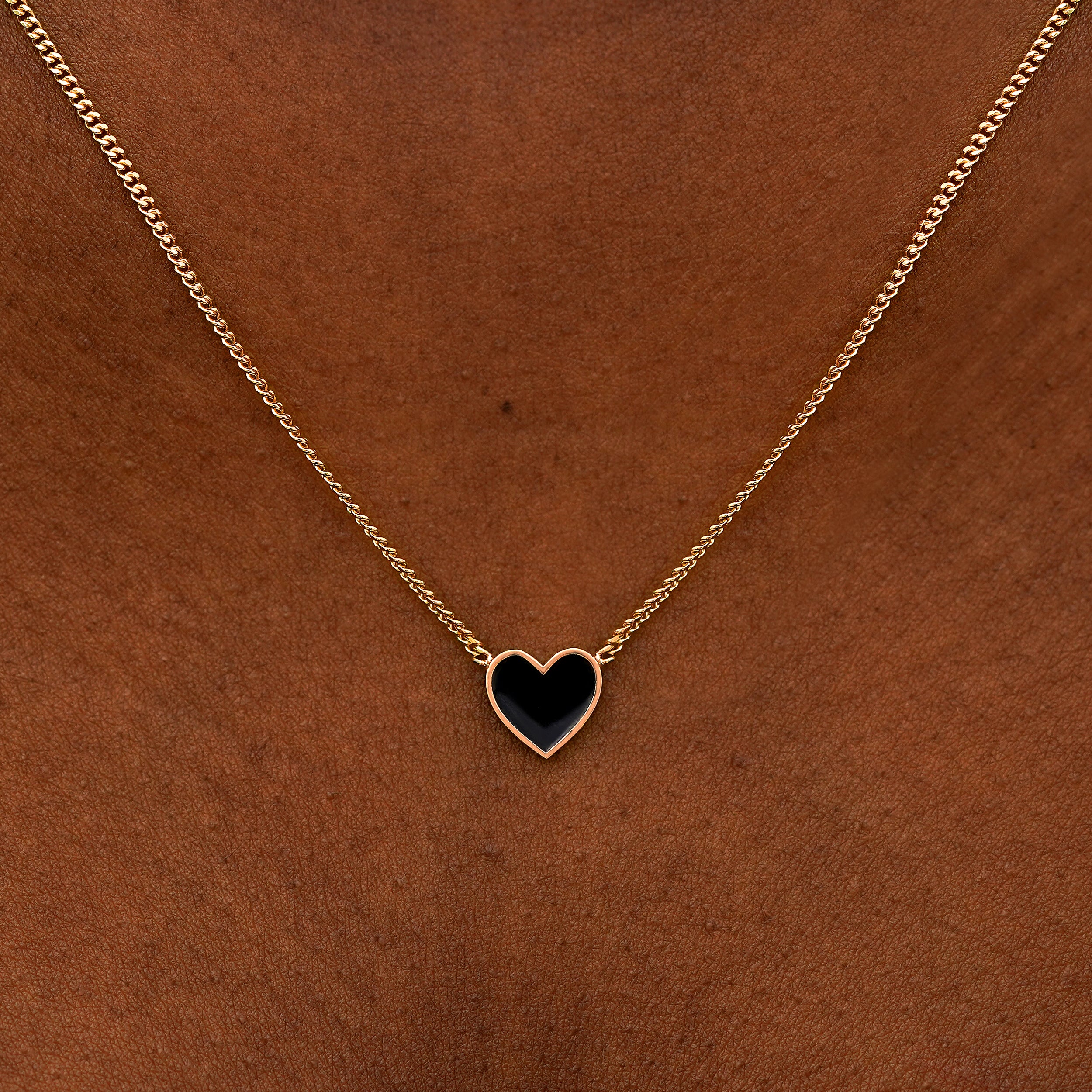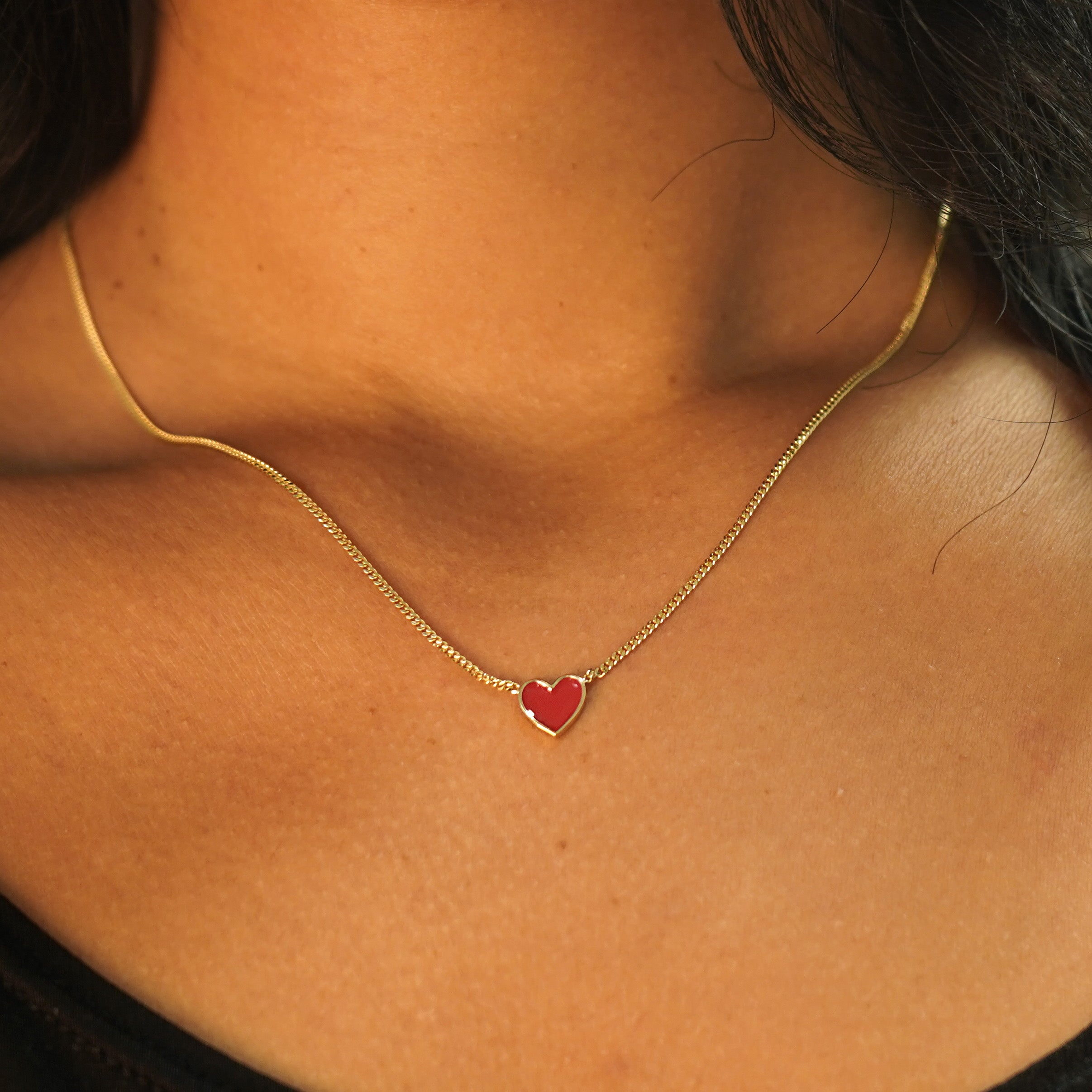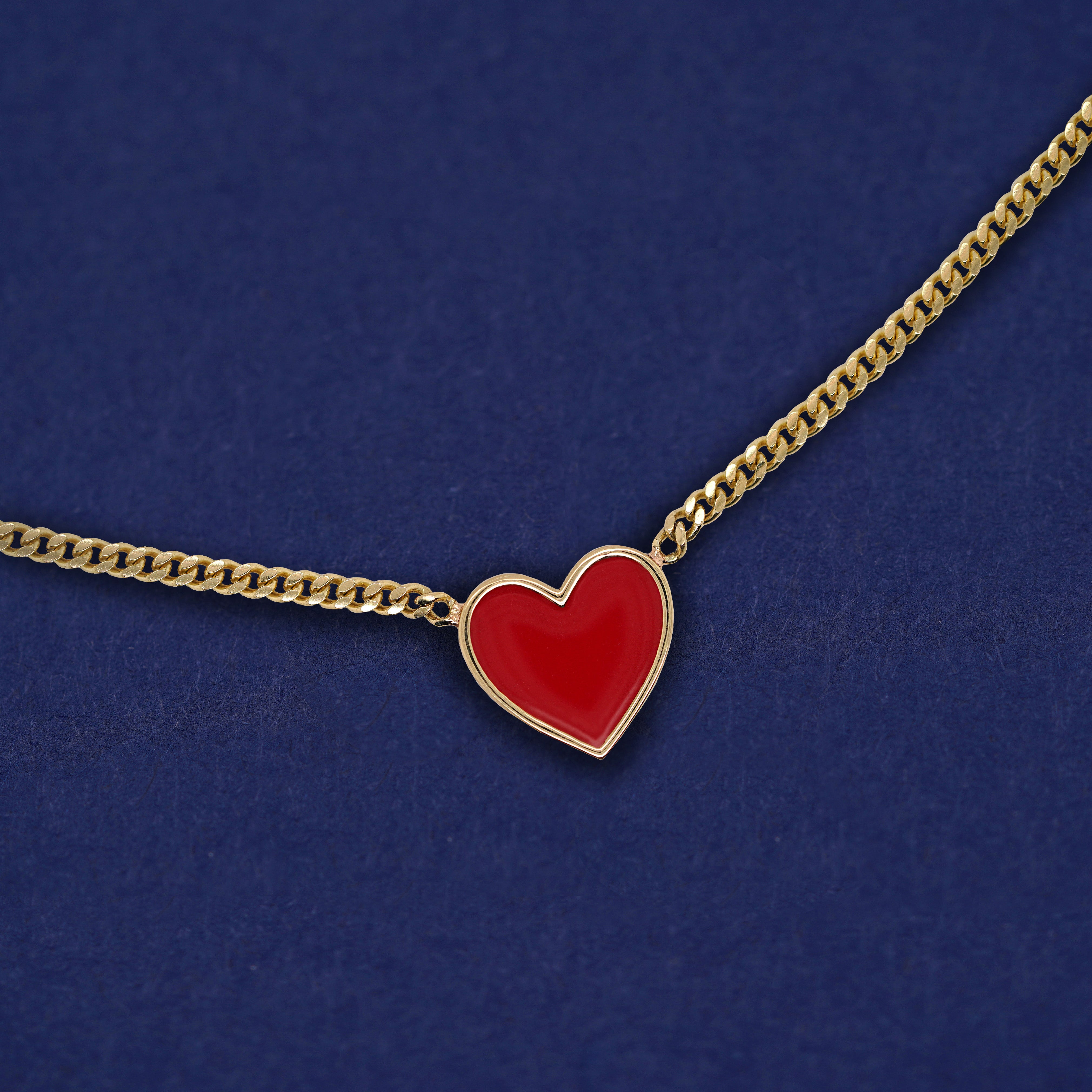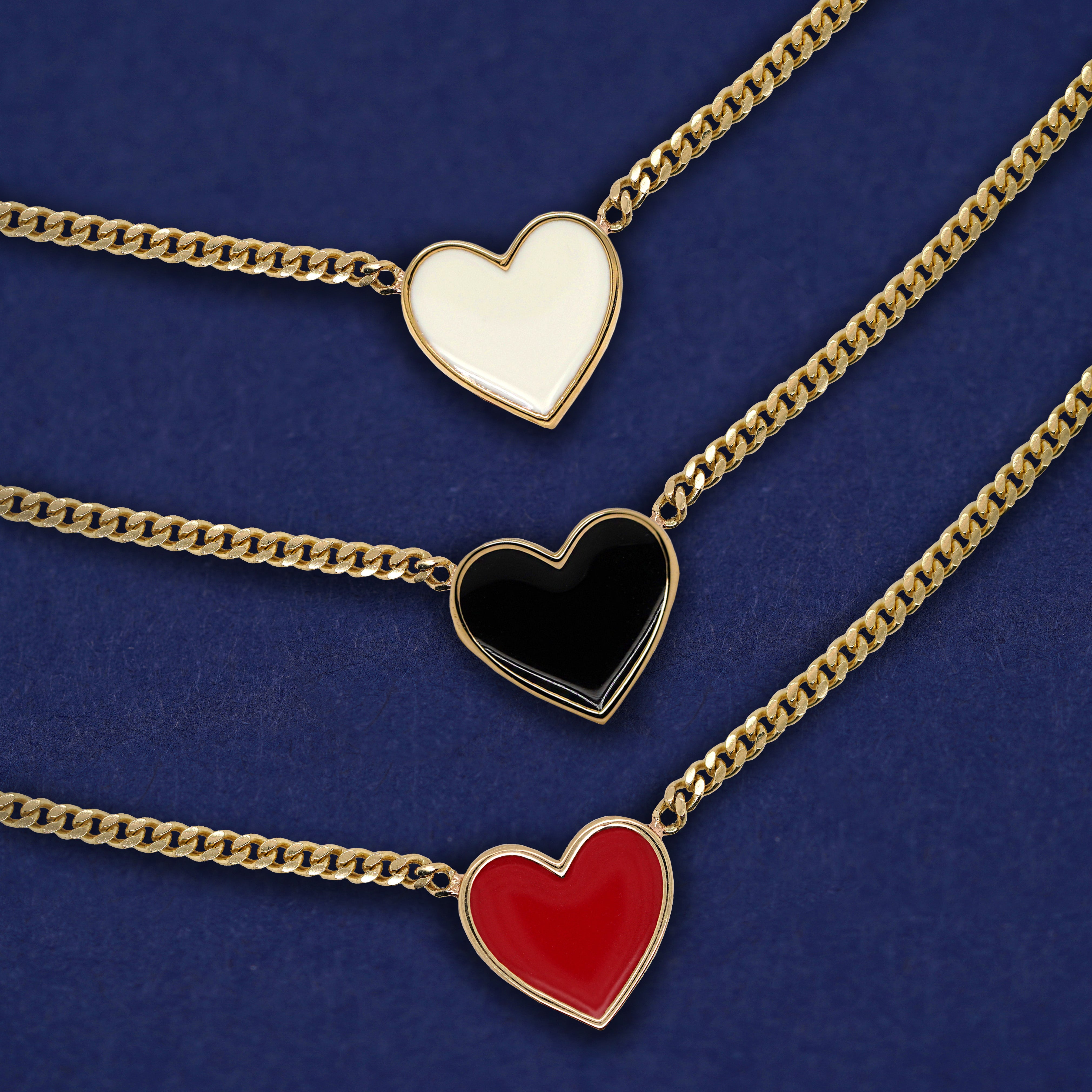 All you need is love...ly enamel heart jewelry to brighten up your wardrobe. This beautiful piece features a gorgeous reversible heart in the center of our durable 14k Mini Miami Chain. Our enamel hearts are scratch resistant and waterproof so they can be worn everyday. Wear the necklace with the classic solid gold heart side out or the colorful enamel side out. Secures with a lobster lock and easy-to-grip Automic Gold AU plate.