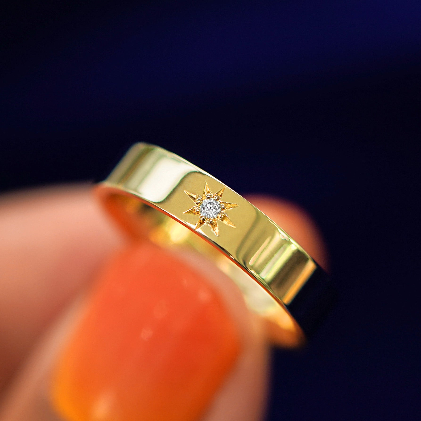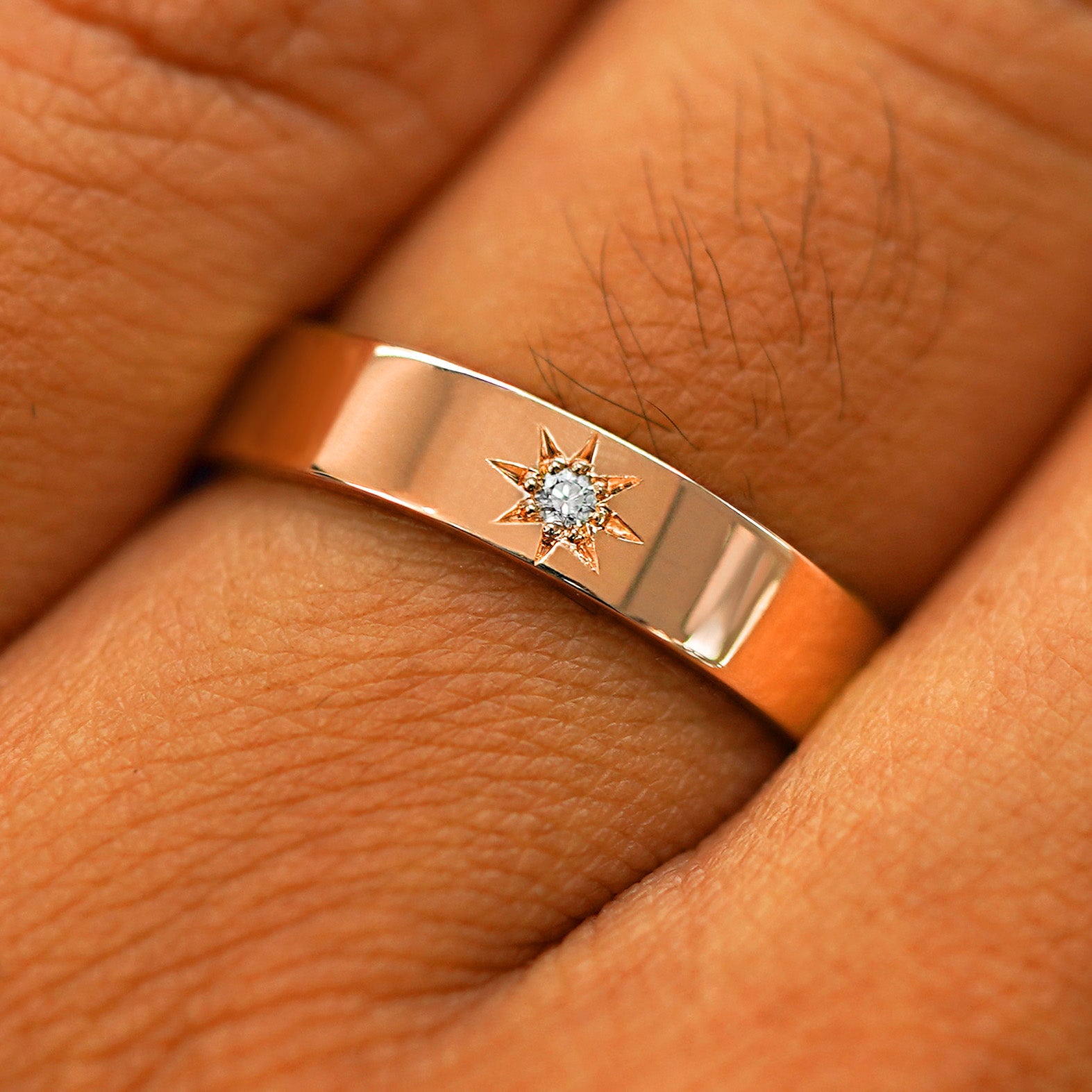 Your love is written in the stars, so bring the stars to your love! The perfect wedding band, this stunning ring features a beautiful round diamond in the center of a hand-engraved star on a solid 14k gold or 950 platinum industrial band. Comfortable, durable, beautiful, and not just for weddings, this band is perfect for anyone who loves a sparkly, stackable, everyday ring.