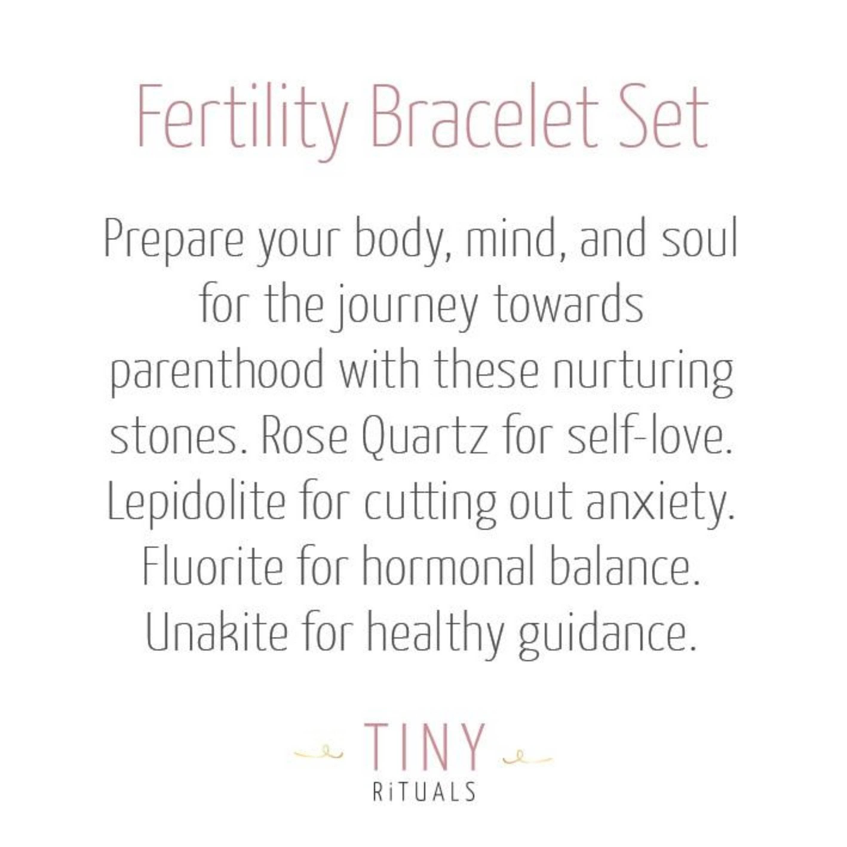 Get flushed with life as you turn to the ripe and rosy healing properties of the Fertility Bracelet Set. Stacking up on deep nurturing vibes, opening up your body for the energy to flow, and finding your own authentic path to pregnancy and motherhood, these specially picked fertility gemstone bracelets bring together the warm compassionate glow of Rose Quartz, the lullaby of Lepidolite, the hormone balancing hand of Fluorite, and the spiritual growth of Unakite.