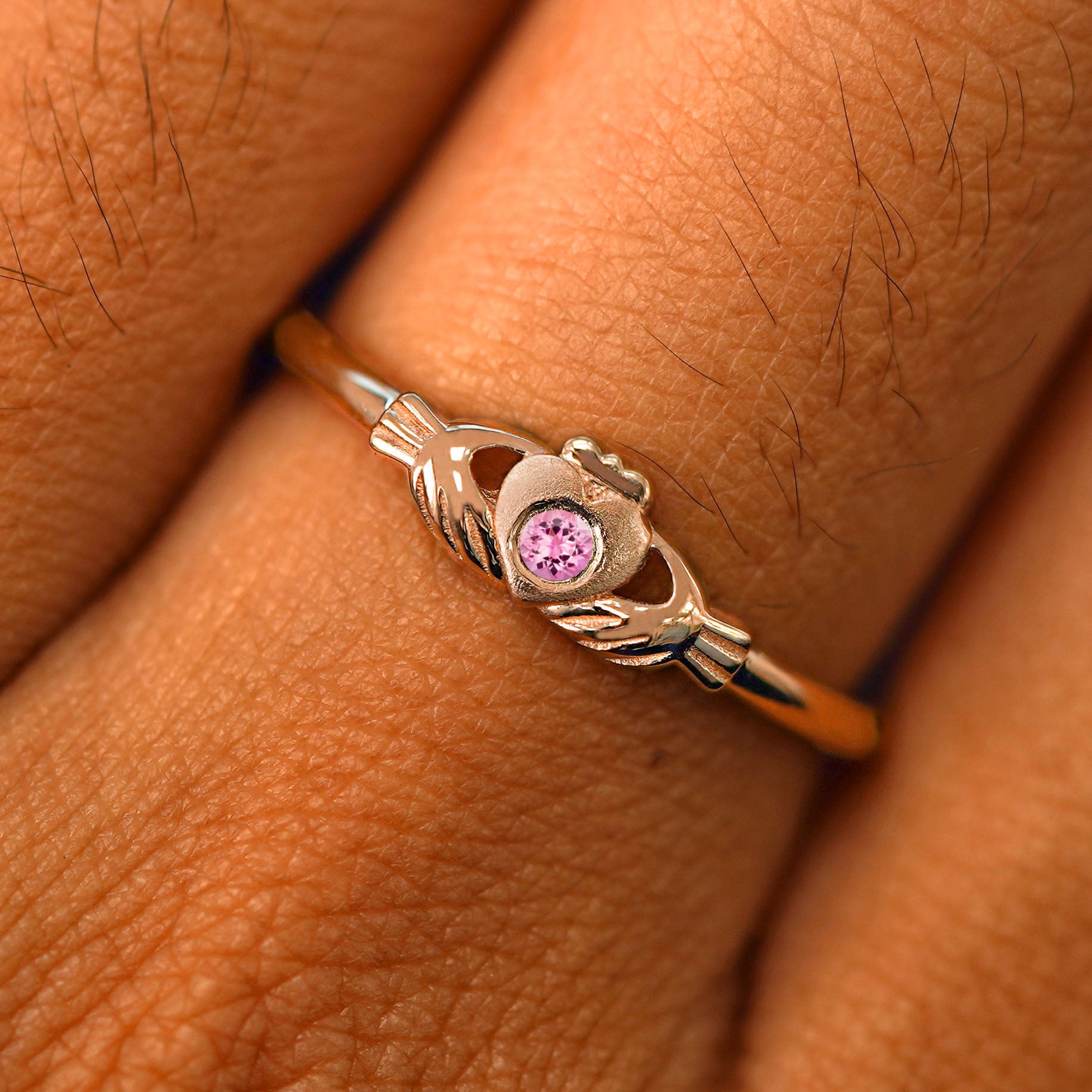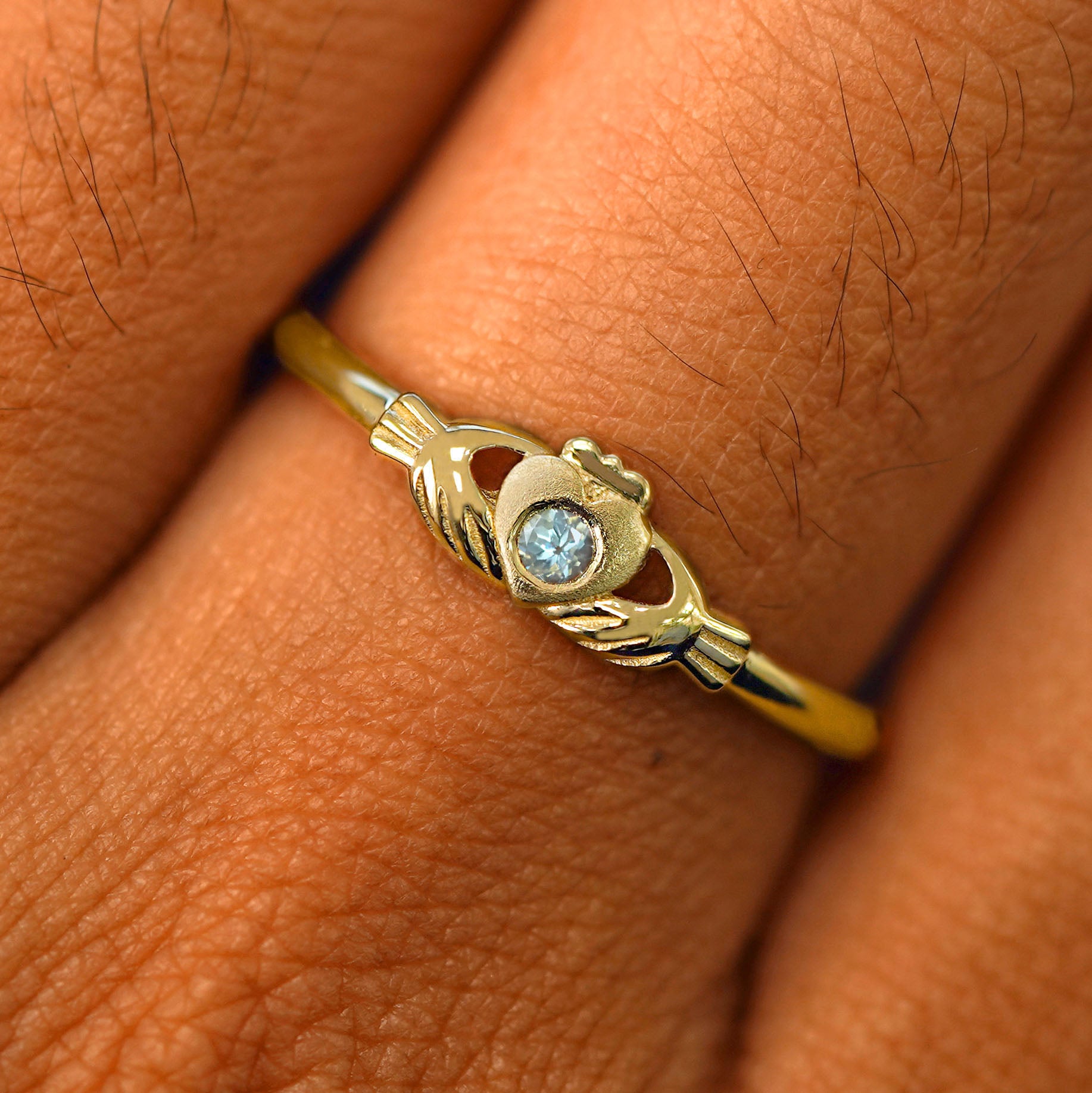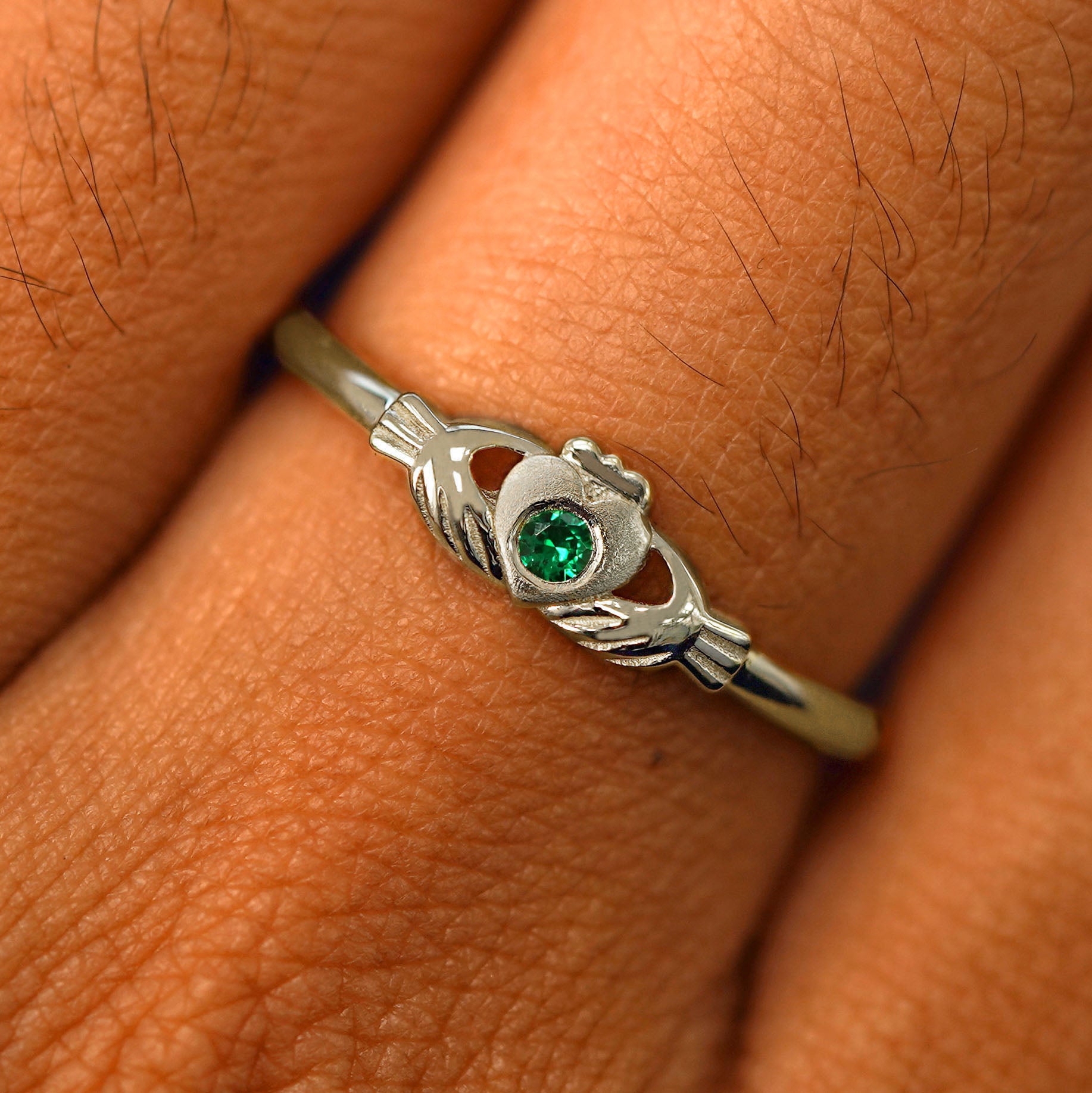 This band is just like our timeless solid gold Claddagh Ring but with a little added sparkle. A glittering 2mm gemstone sits flush in the center of the textured heart on this solid 14k gold or 950 platinum ring.