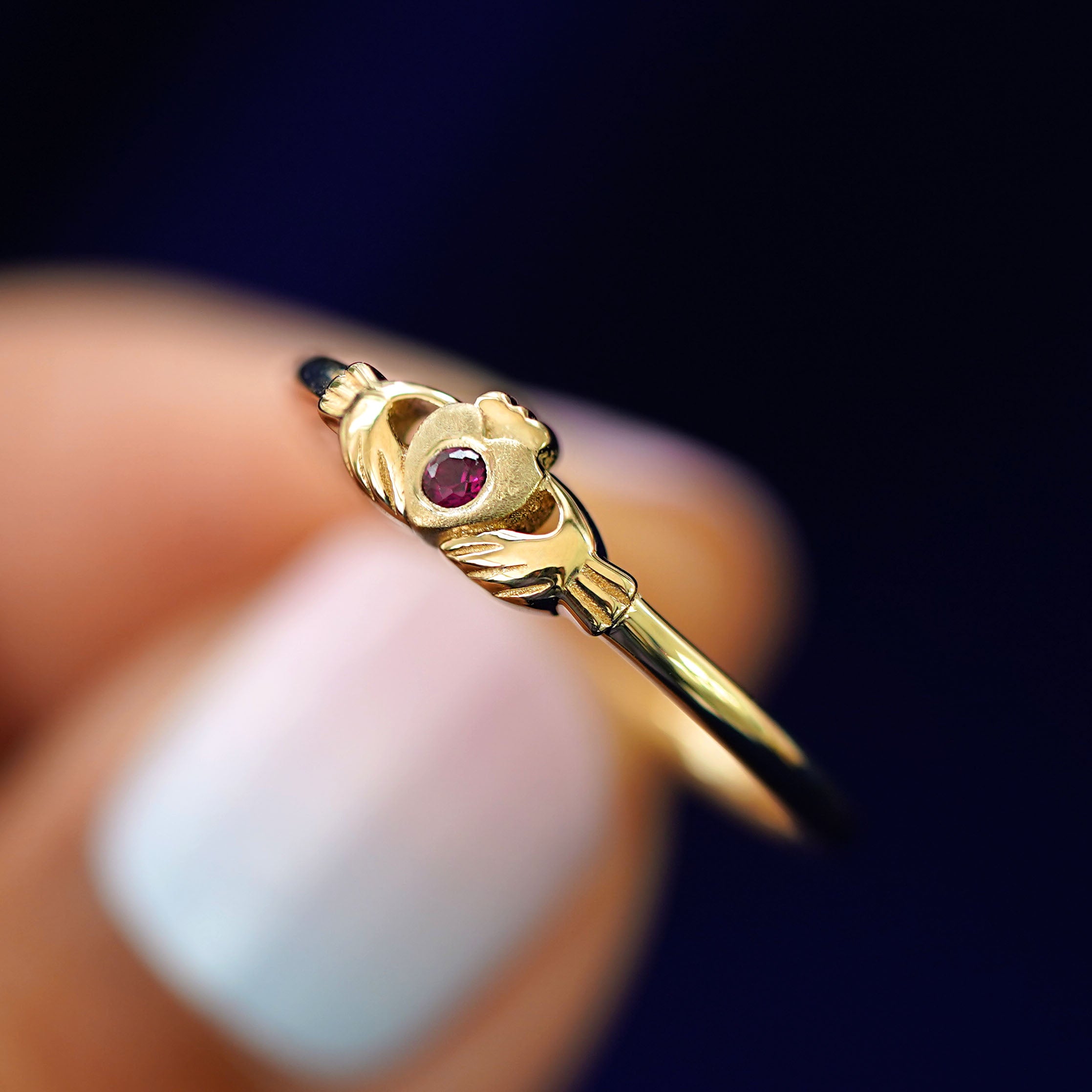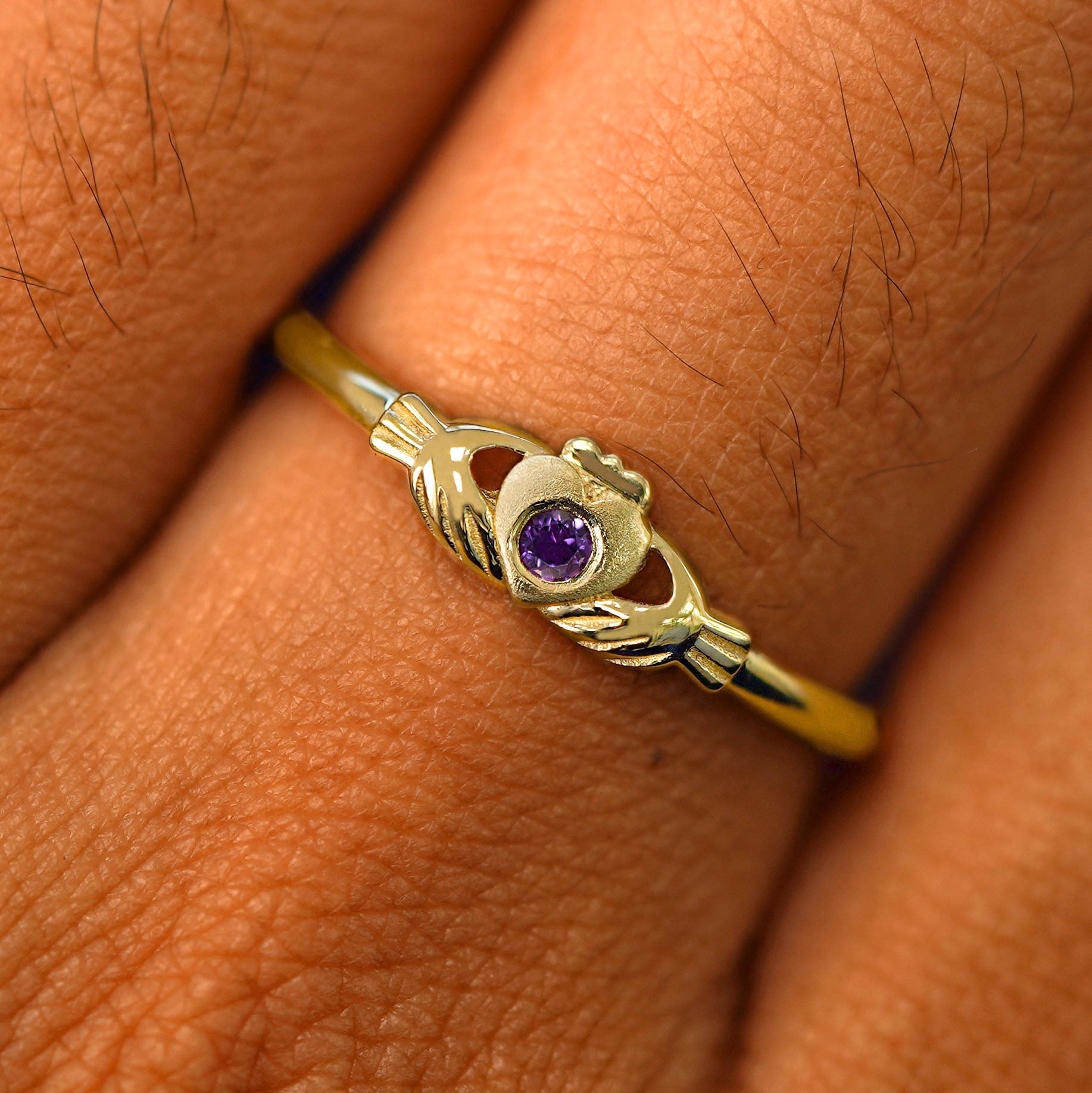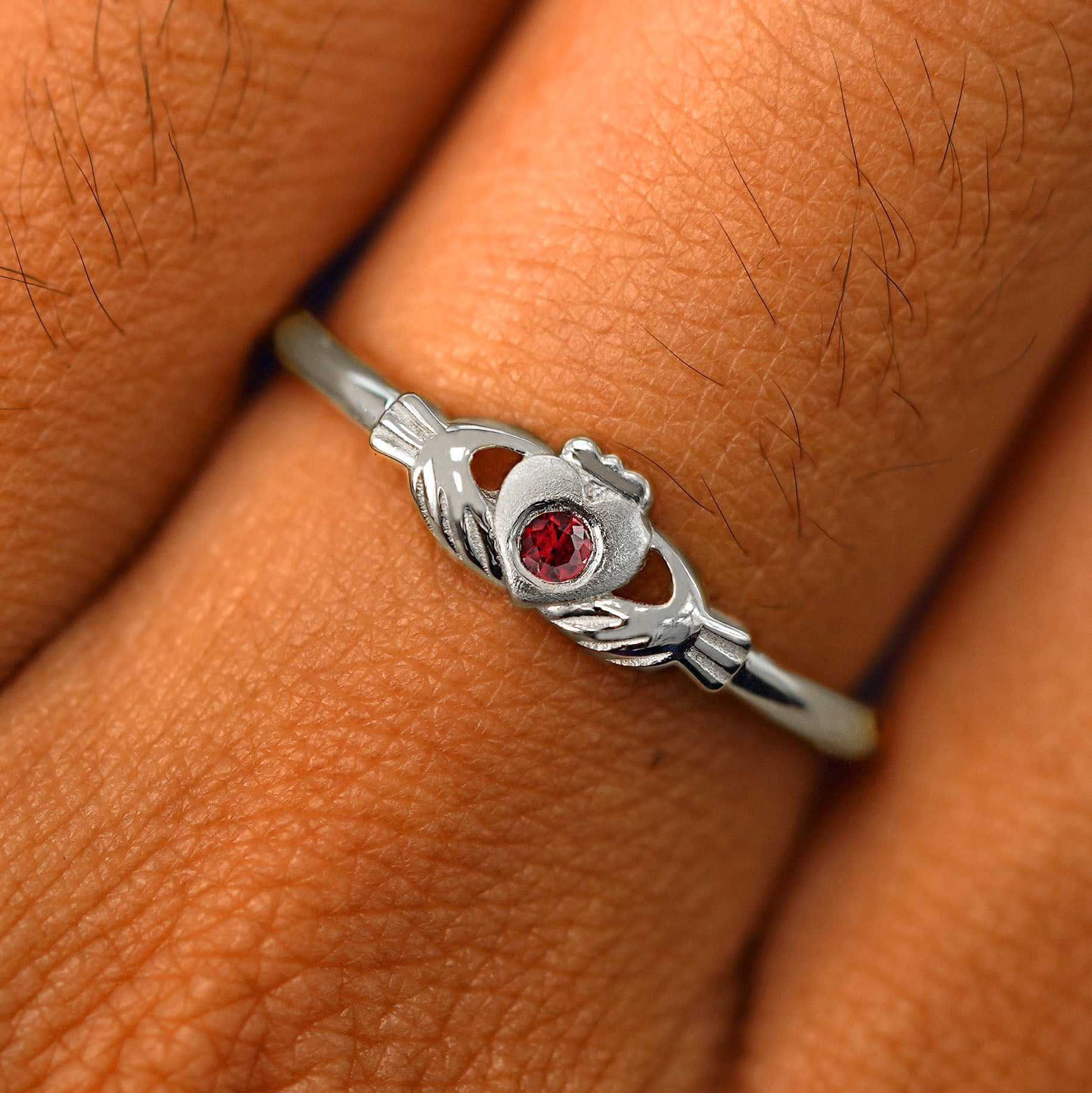 This band is just like our timeless solid gold Claddagh Ring but with a little added sparkle. A glittering 2mm gemstone sits flush in the center of the textured heart on this solid 14k gold or 950 platinum ring.