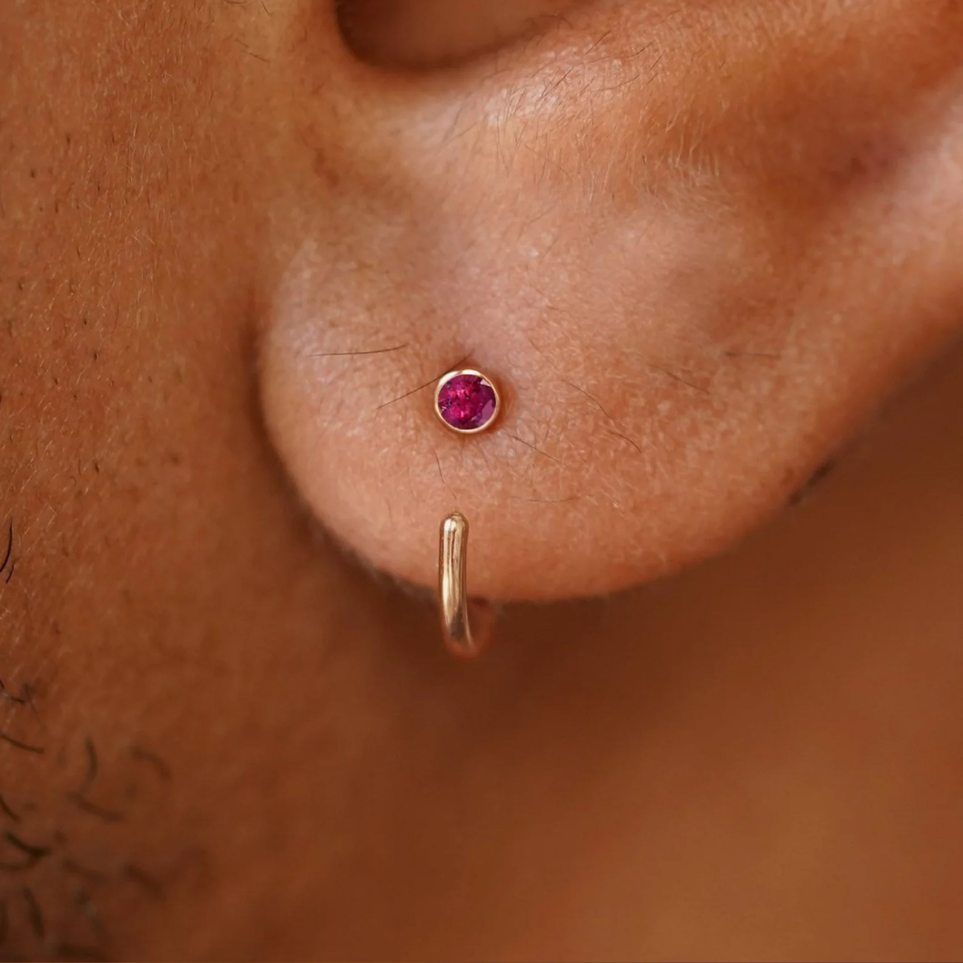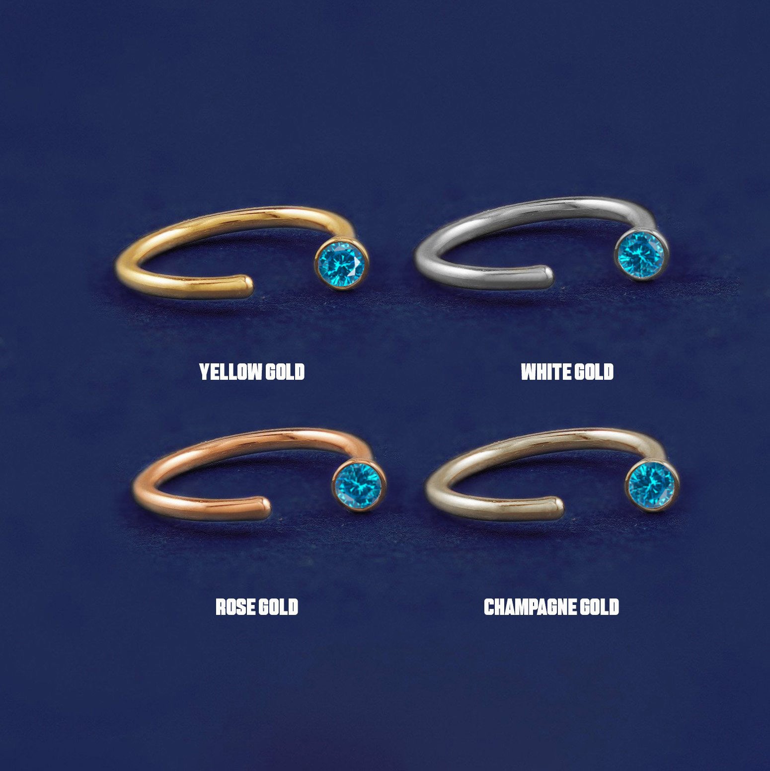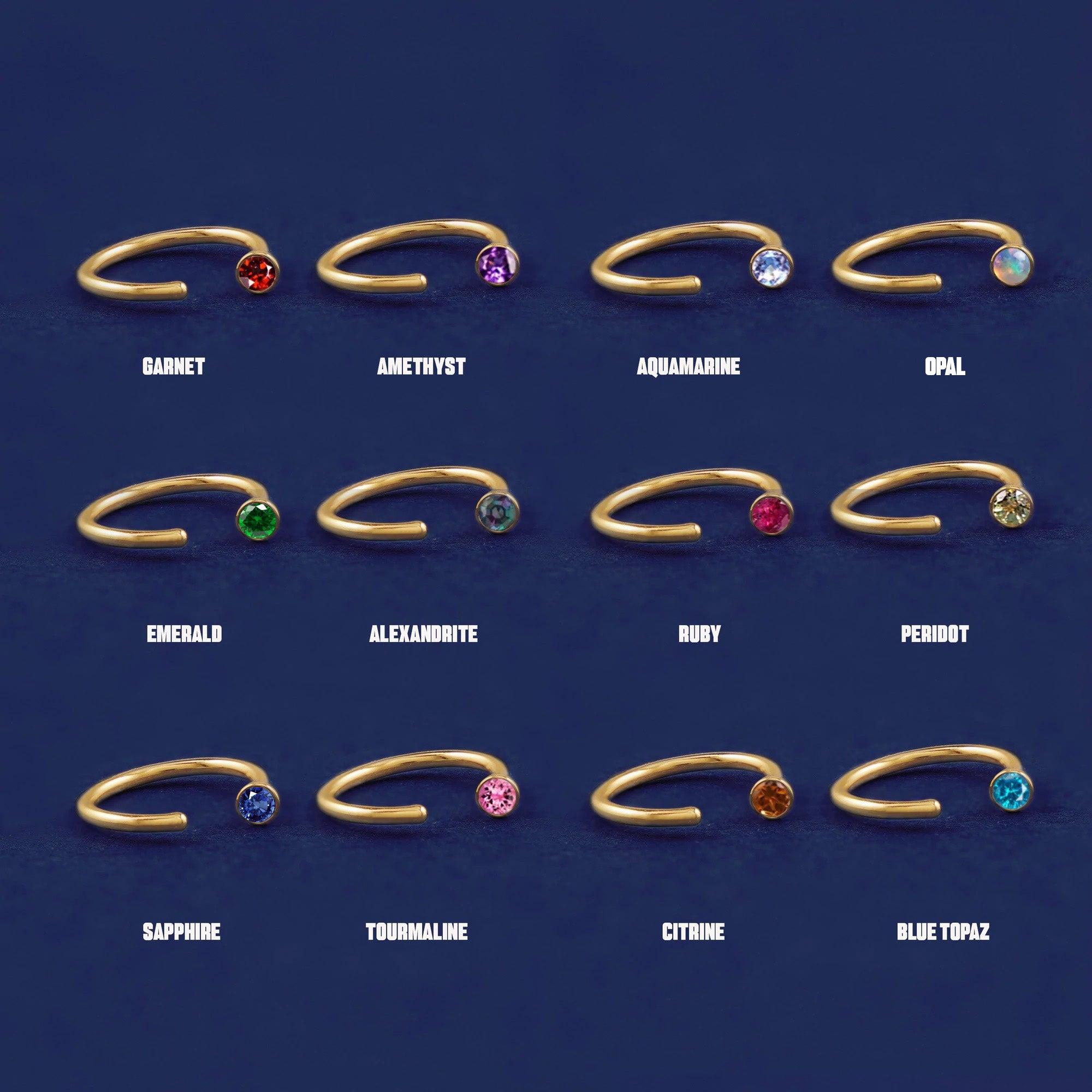 The perfect minimal huggie hoop with a tiny bit of sparkle. With their unique hook design, these dainty hoop earrings are both eye-catching and comfortable. These cute little huggies feature your choice of 12 glittering stones in 4 different color options of 14k solid gold so you can wear these customizable hoops your way.