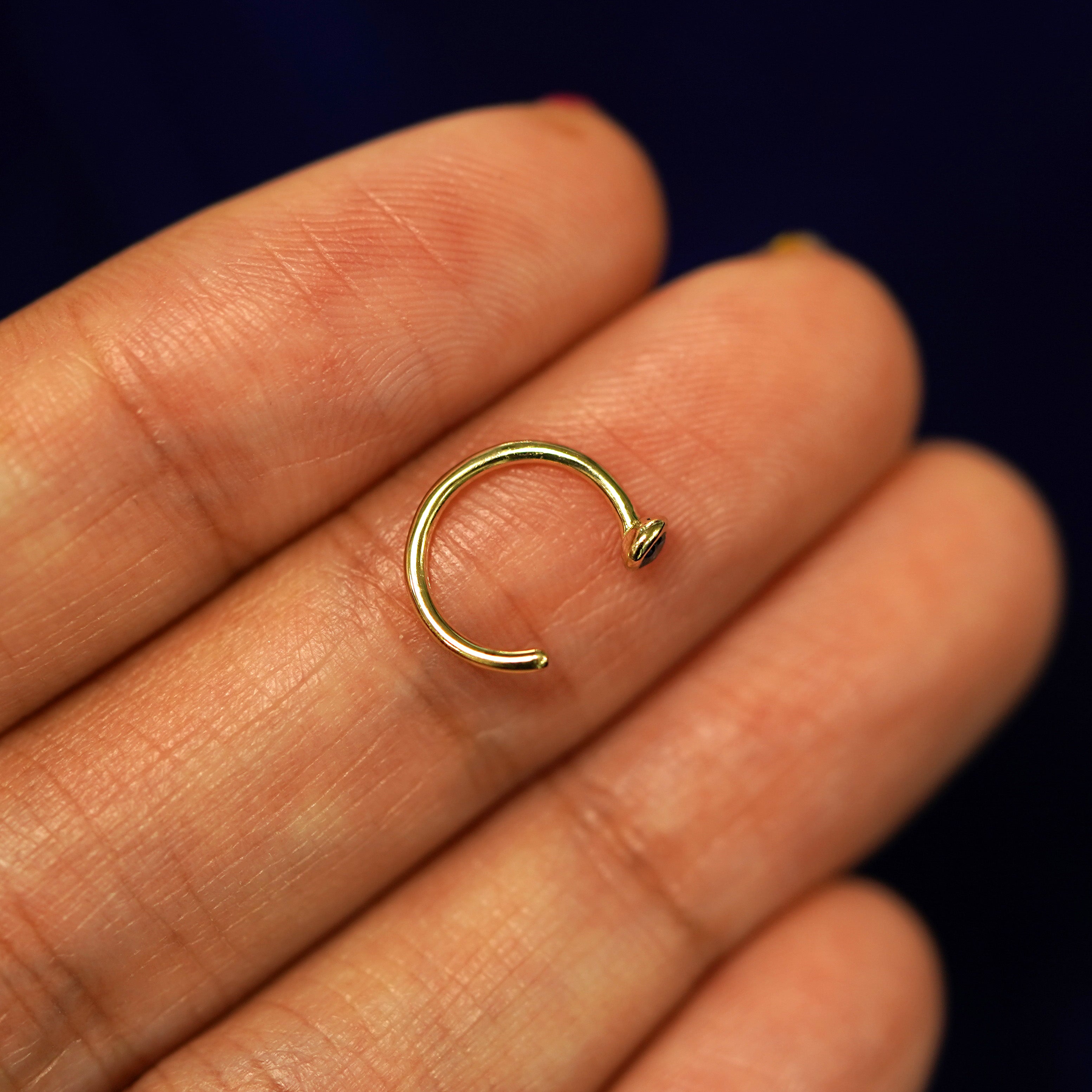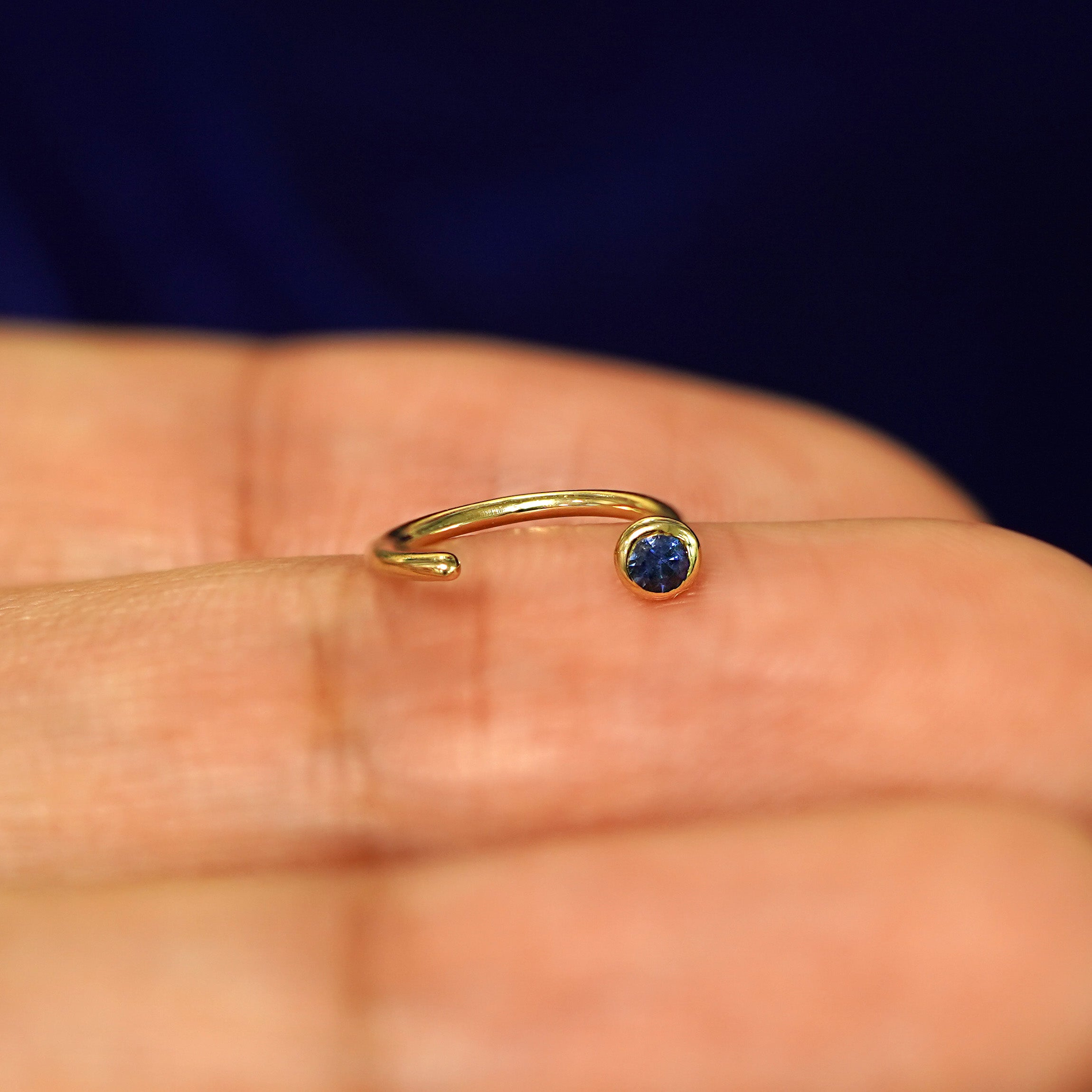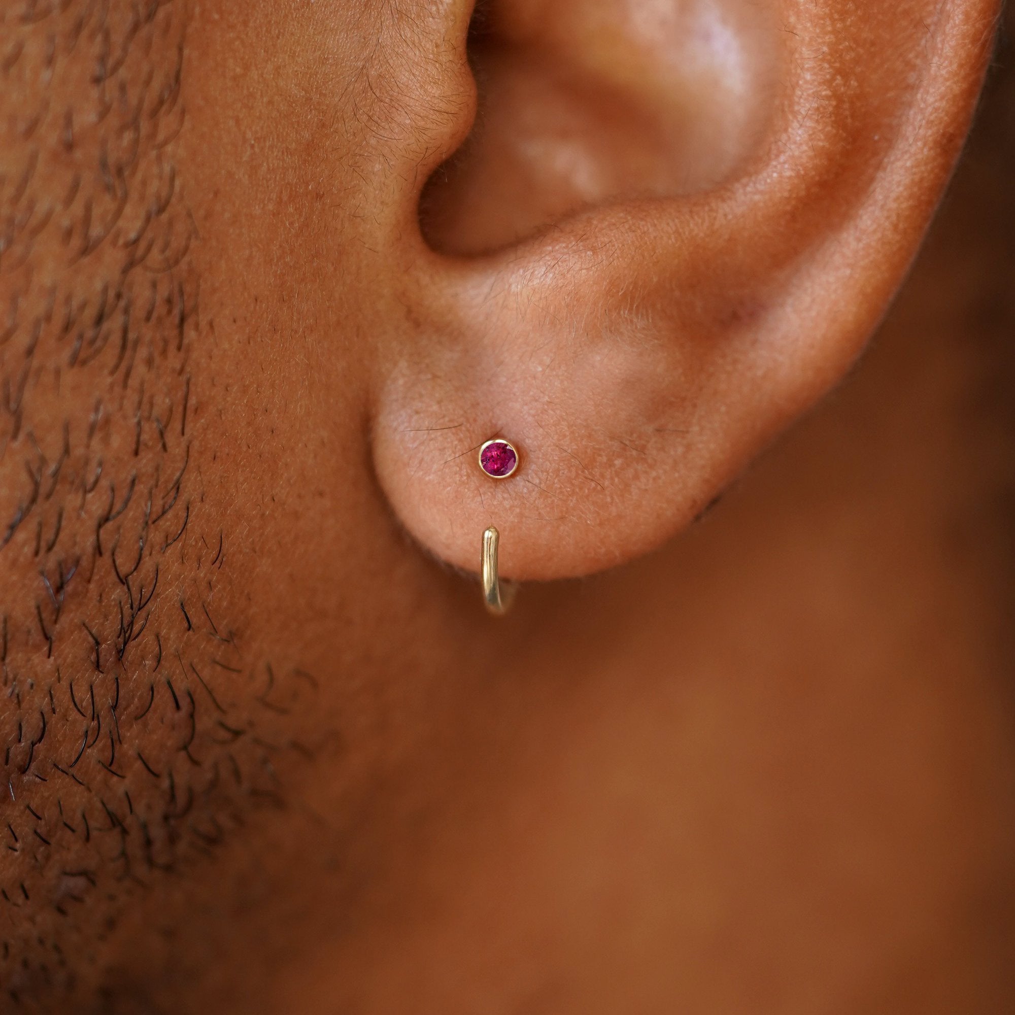 The perfect minimal huggie hoop with a tiny bit of sparkle. With their unique hook design, these dainty hoop earrings are both eye-catching and comfortable. These cute little huggies feature your choice of 12 glittering stones in 4 different color options of 14k solid gold so you can wear these customizable hoops your way.