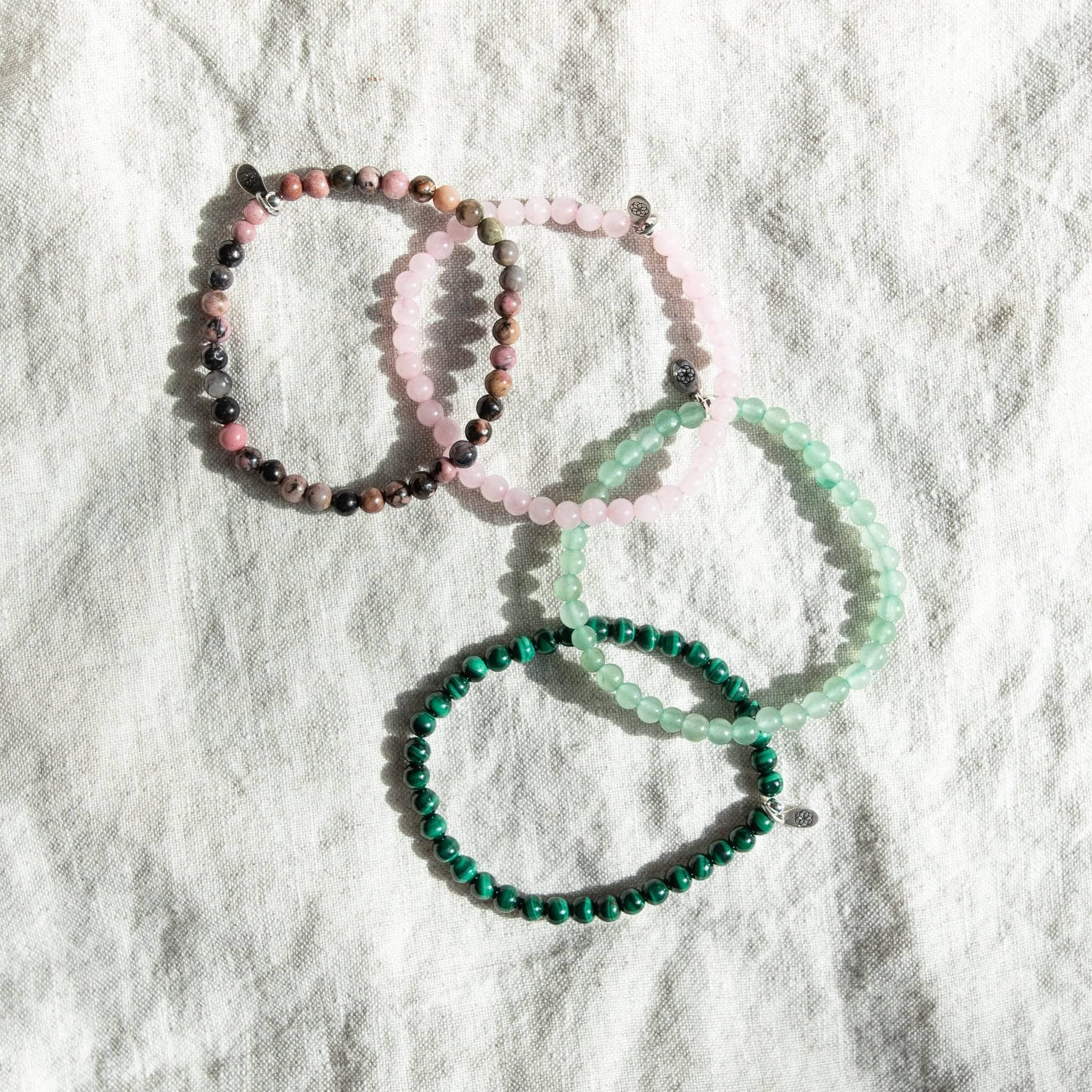 - Green Aventurine, Malachite, Rose Quartz, Rhodocrosite