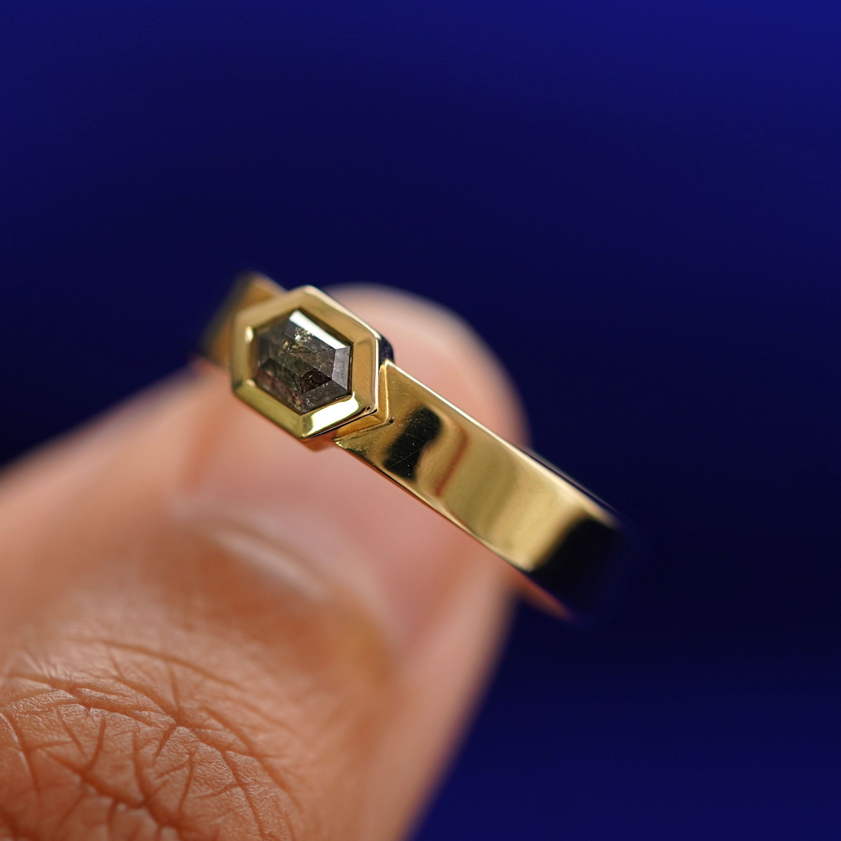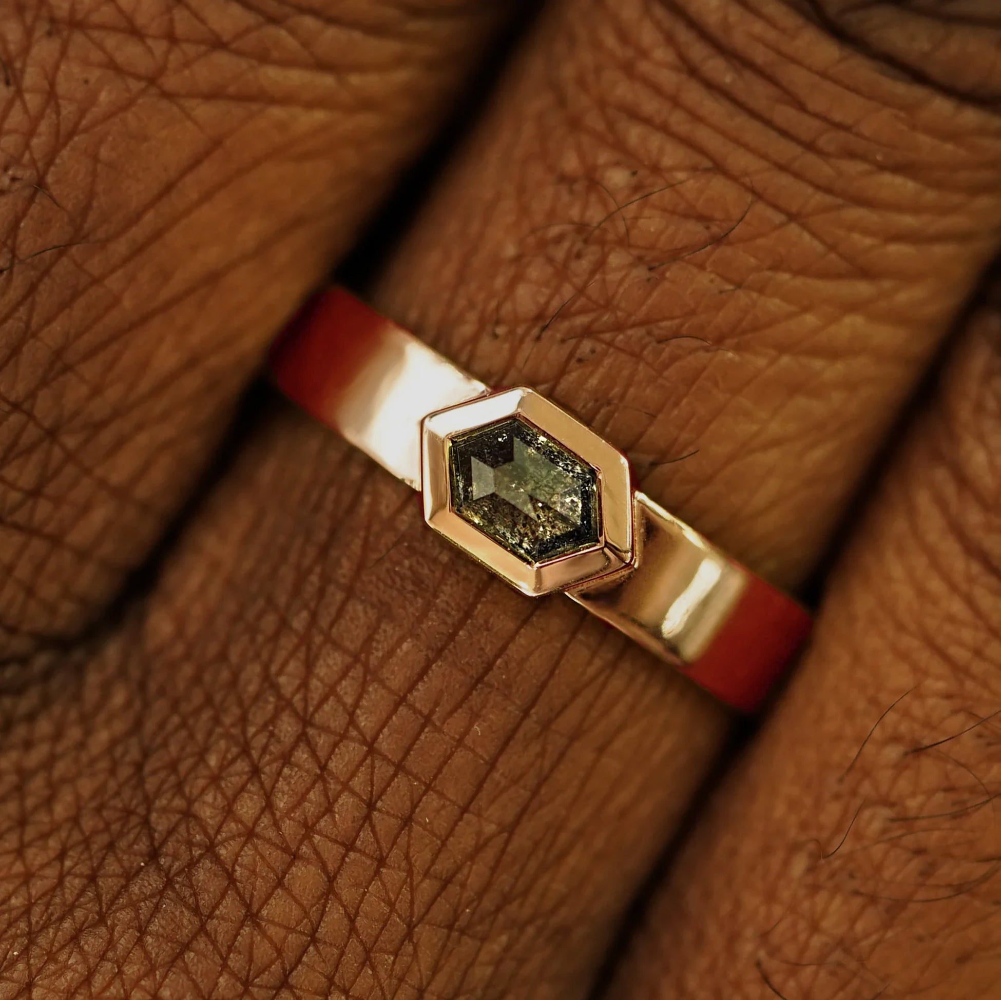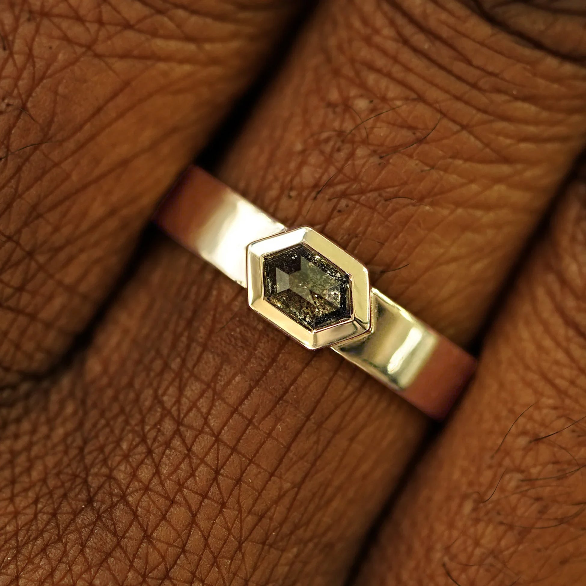 When our founder AL was designing our engagement ring collection, they wanted to create a classic masculine engagement ring, the type of ring with which they themself would want to be proposed to, so they created our Hexagon Diamond Band. They paired our classic industrial wedding band with a hand-picked salt and pepper diamond in a unique hexagon-shaped bezel setting. This combination captures masculinity with a little bit of flamboyancy making it a perfect engagement ring, wedding band, or everyday ring for your masc or gender non-conforming partner.