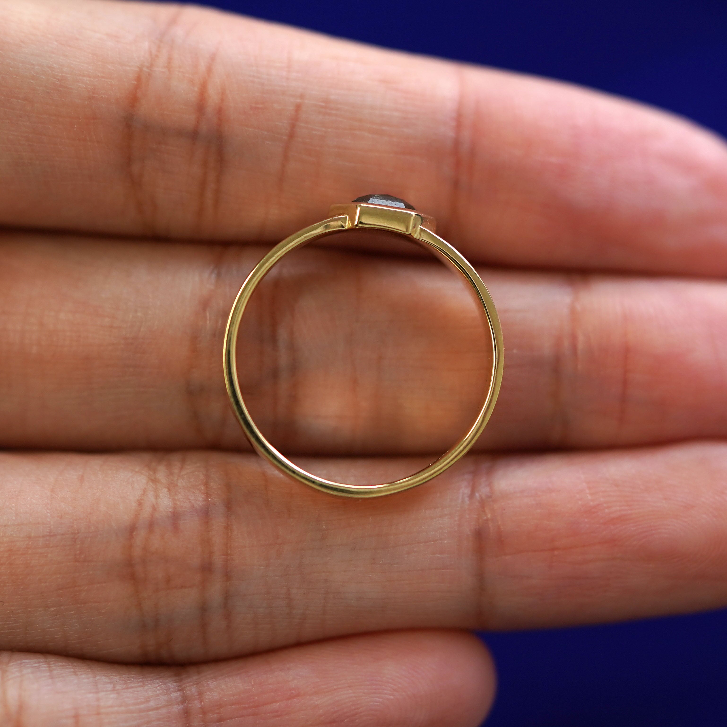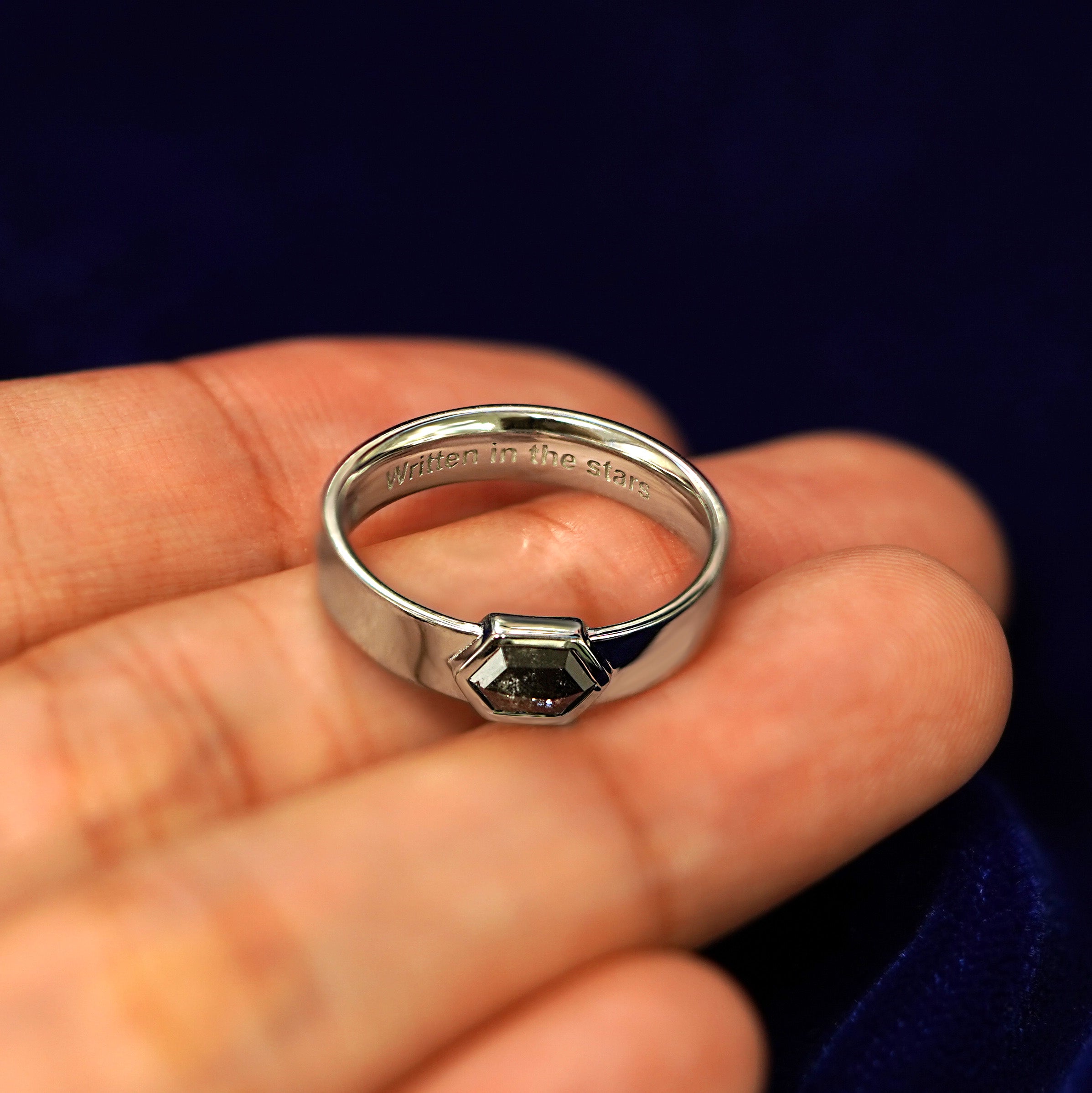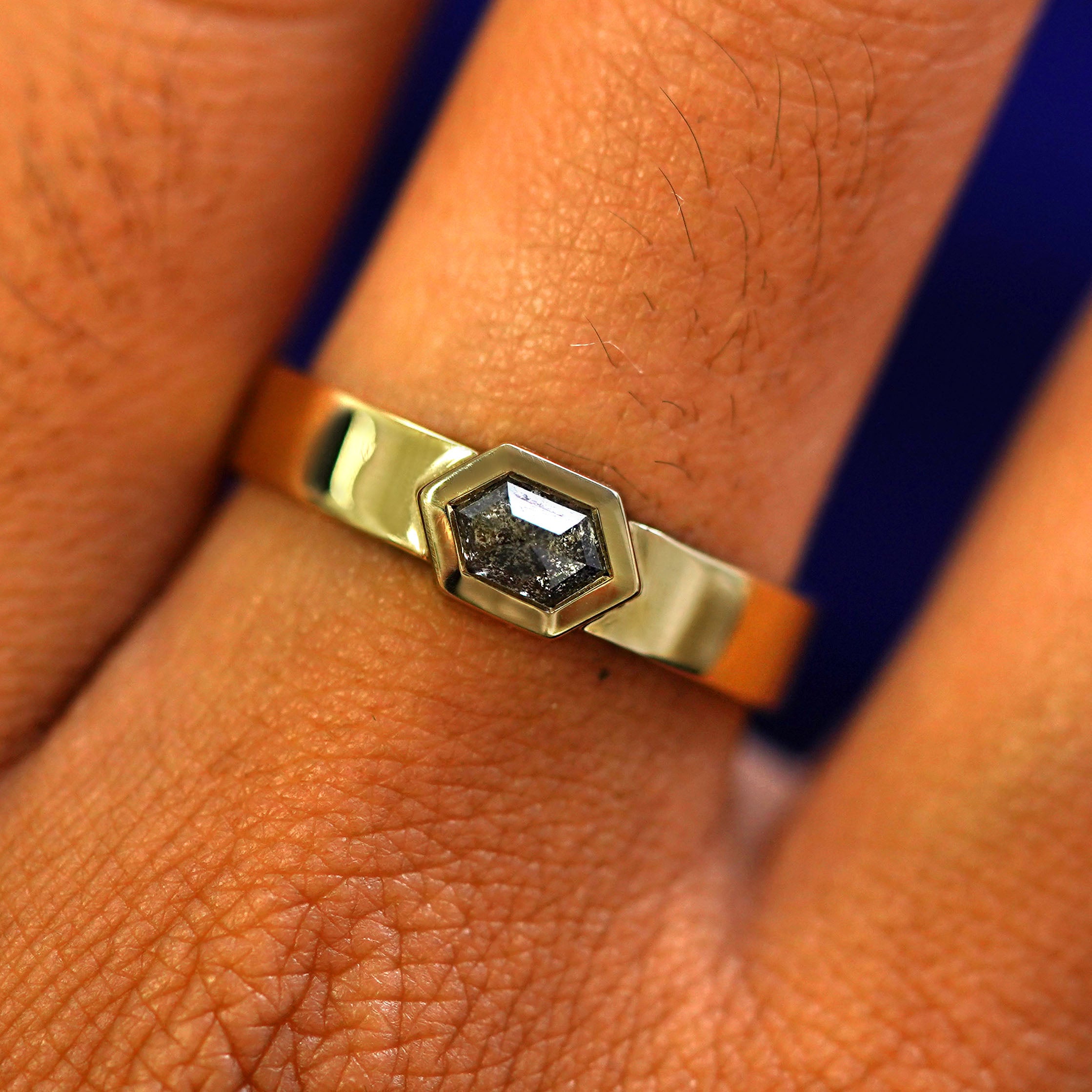 When our founder AL was designing our engagement ring collection, they wanted to create a classic masculine engagement ring, the type of ring with which they themself would want to be proposed to, so they created our Hexagon Diamond Band. They paired our classic industrial wedding band with a hand-picked salt and pepper diamond in a unique hexagon-shaped bezel setting. This combination captures masculinity with a little bit of flamboyancy making it a perfect engagement ring, wedding band, or everyday ring for your masc or gender non-conforming partner.