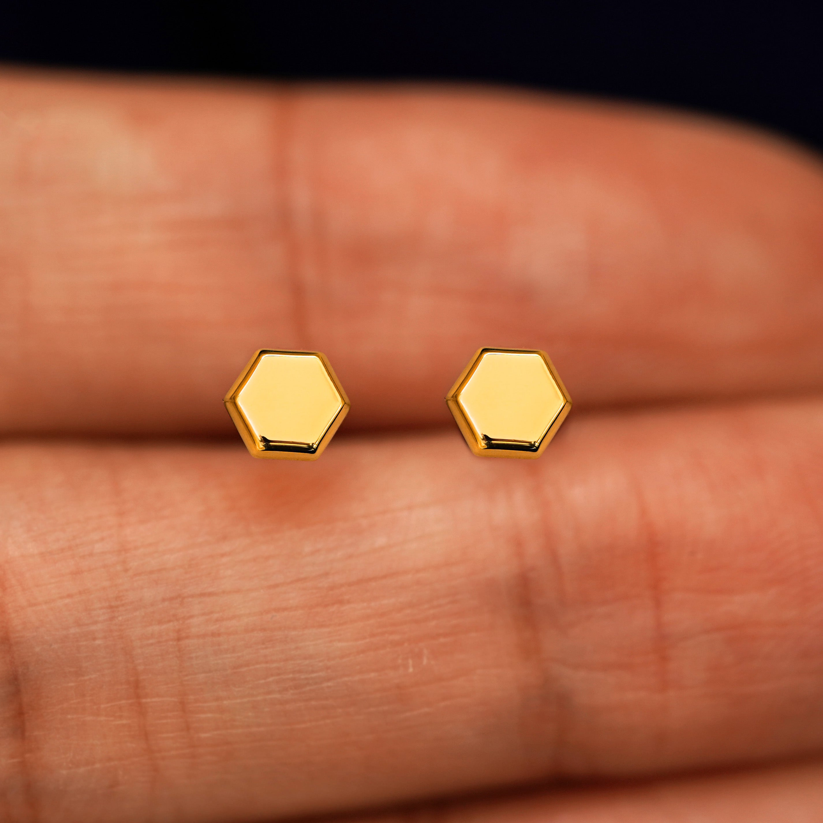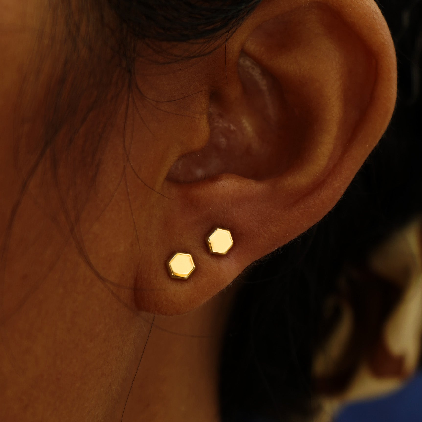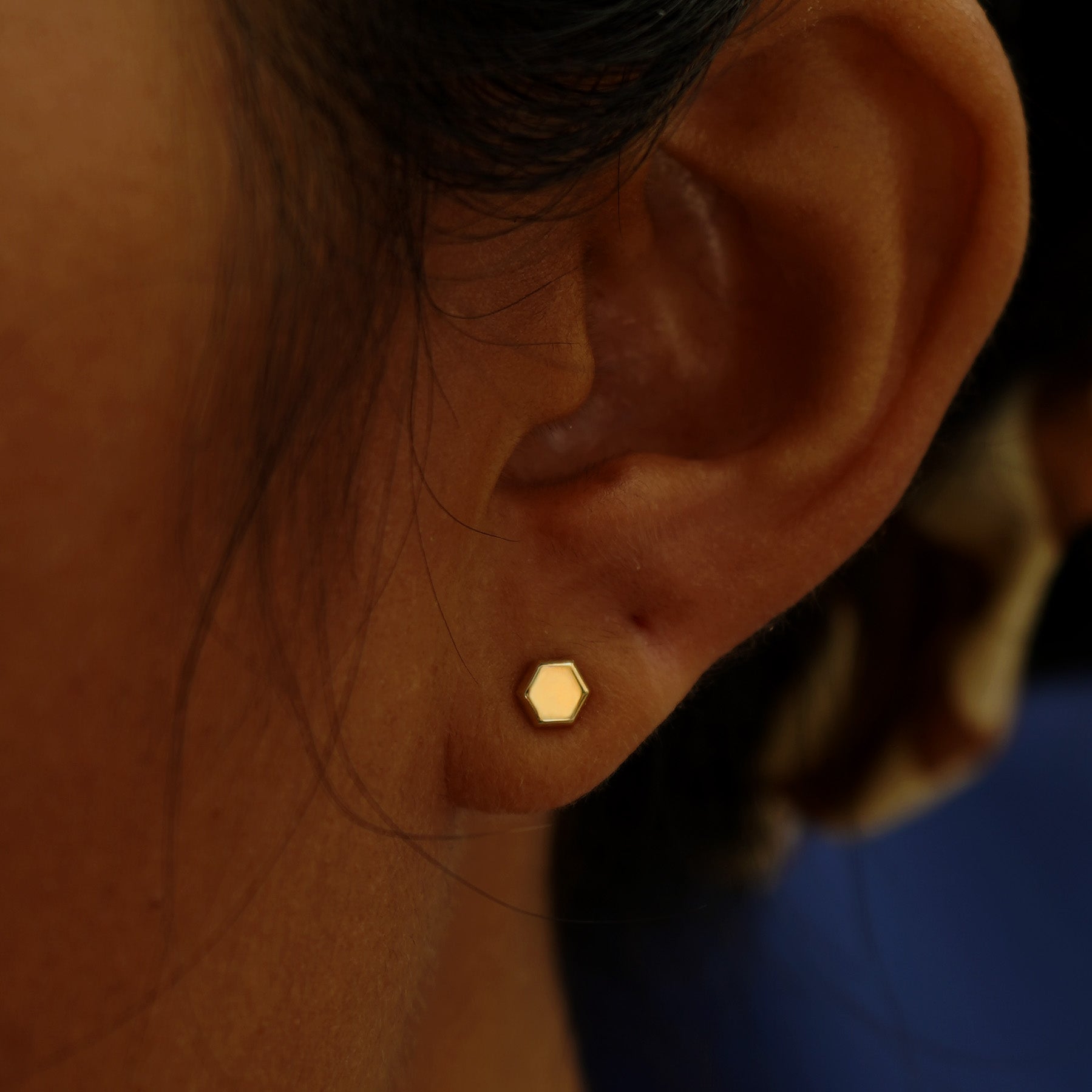 Sweet like honeycomb and stylishly modern, these hexagon earrings are shapely little studs perfect for everyday wear. Crafted with recycled 14k solid gold, these stud earrings feature a raised hexagon design with rounded edges so they are durable, comfortable, and sustainable.