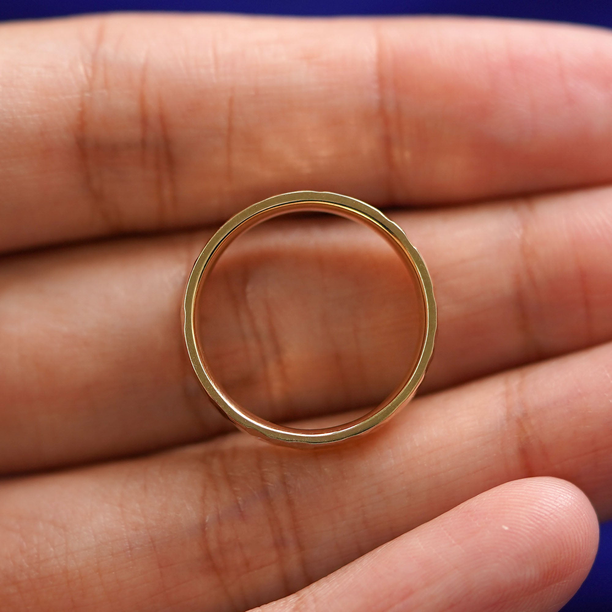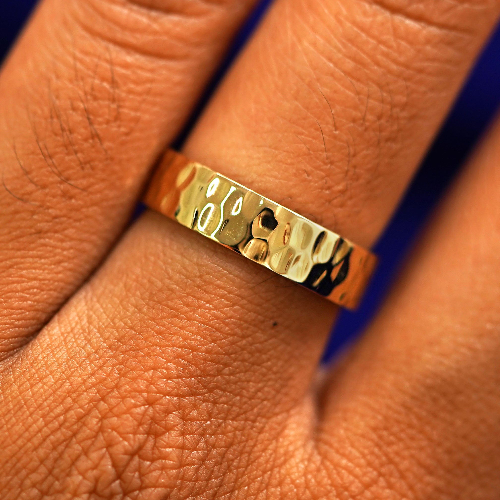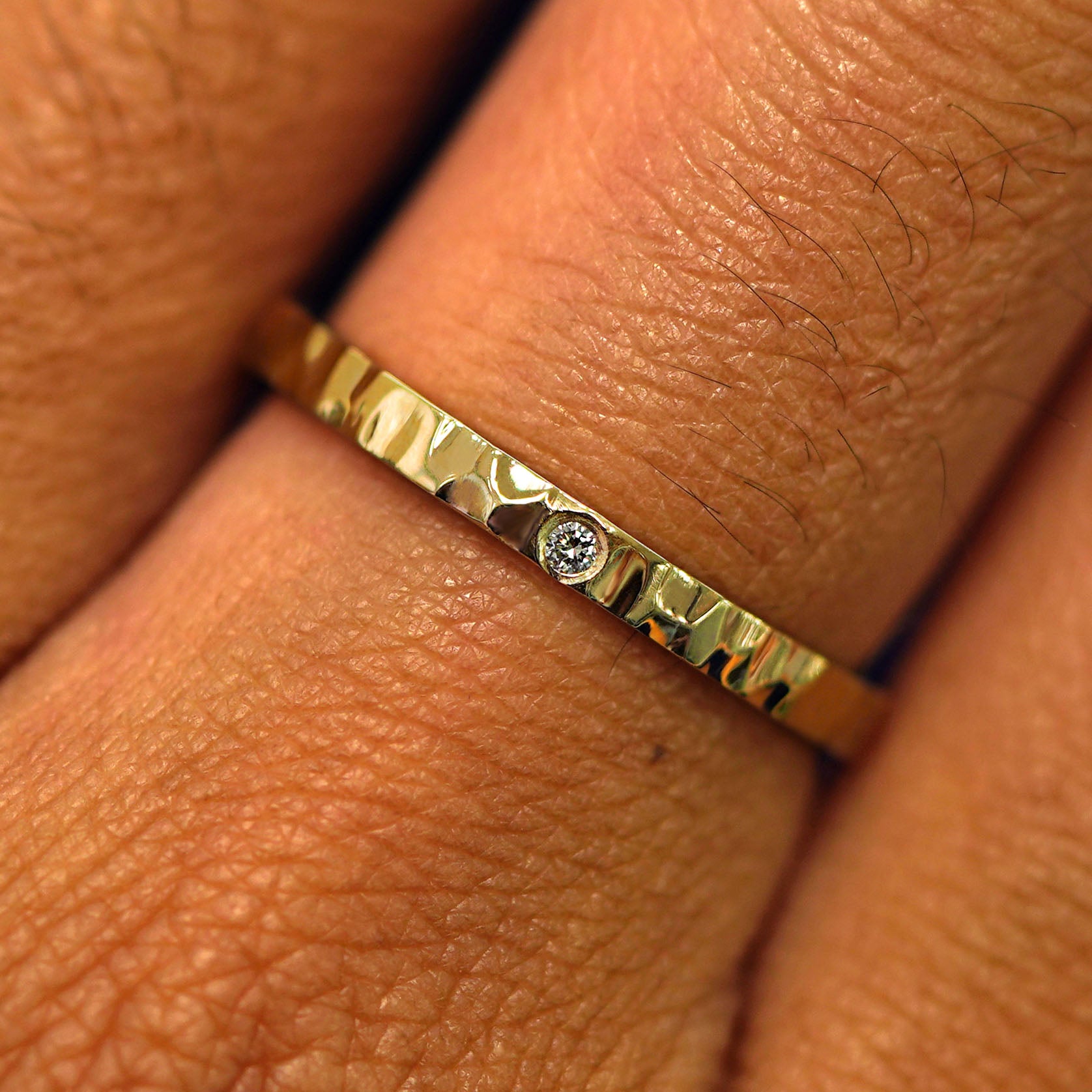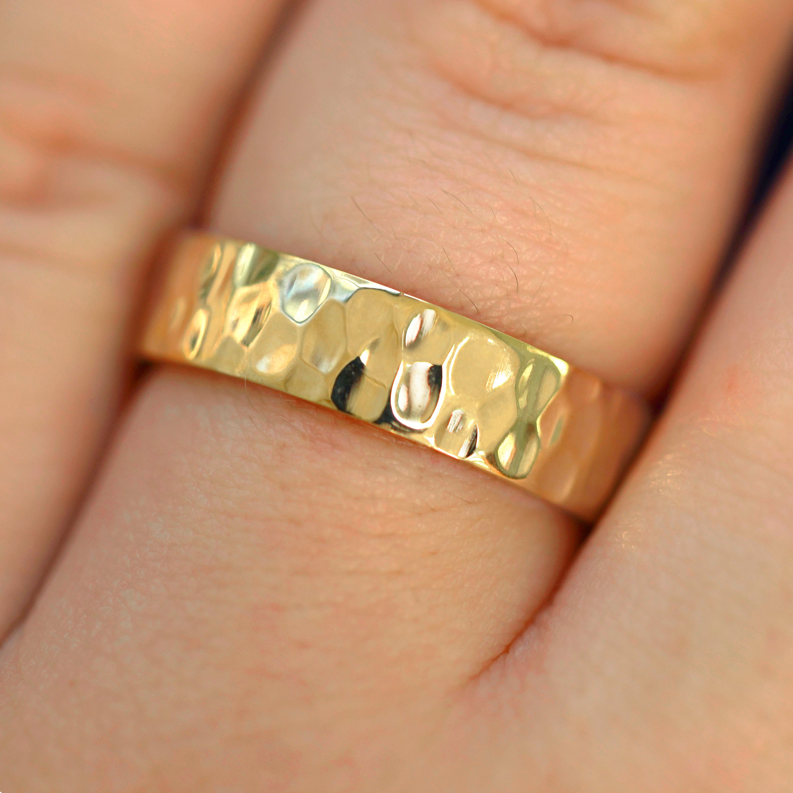 The hand-made artistry of this industrial band makes each wedding ring a one-of-a-kind work of art. The hammered pattern on the surface of this 14k solid gold ring makes it glimmer and glow and complements the nature of the gold beautifully. Androgynous jewelry ready to be your wedding band, stacking ring, thumb ring or anything your heart desires, no matter your gender expression.