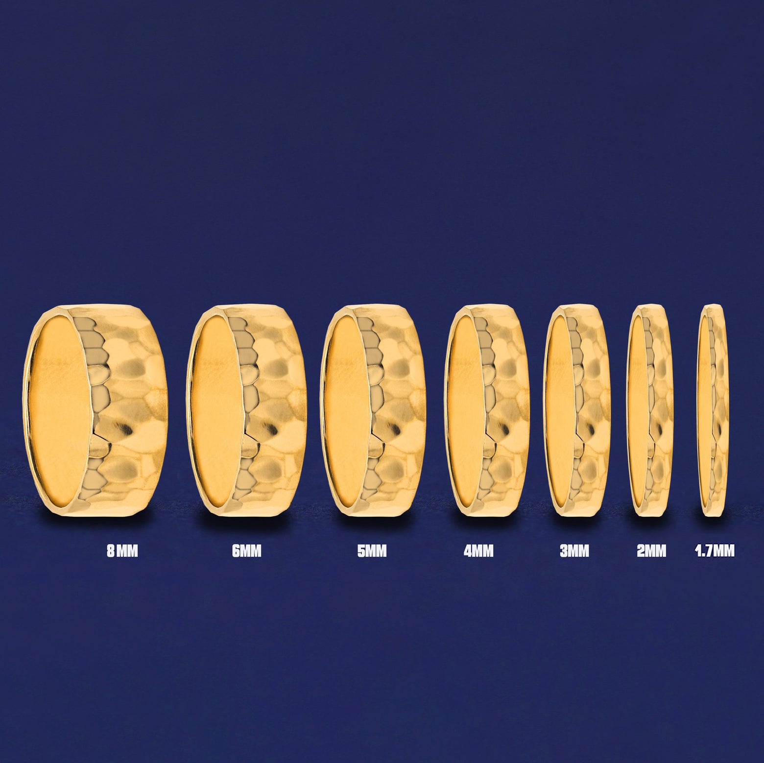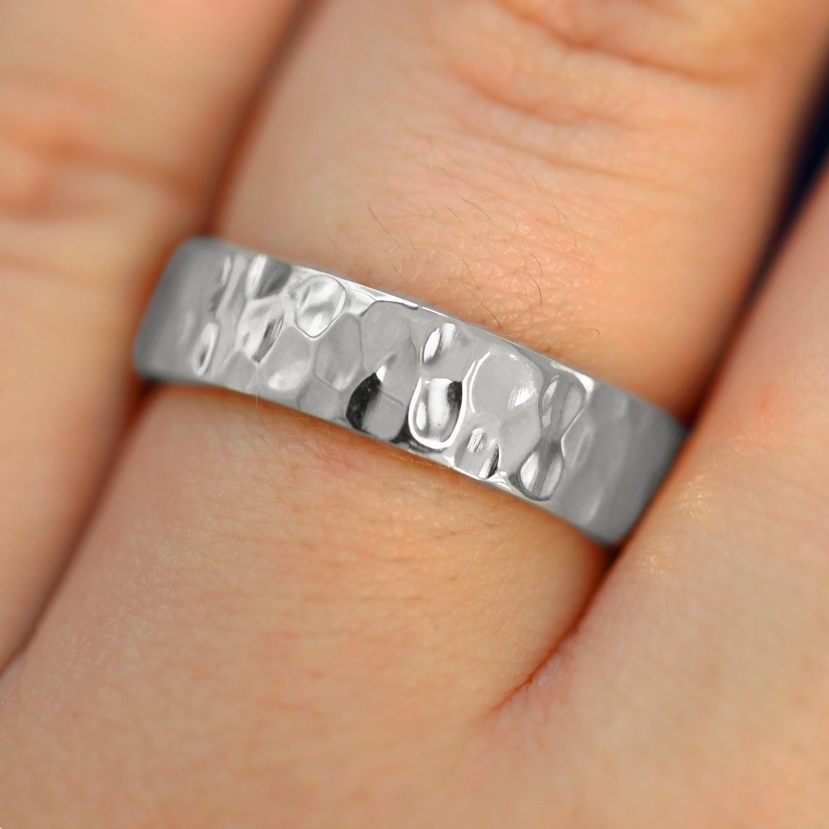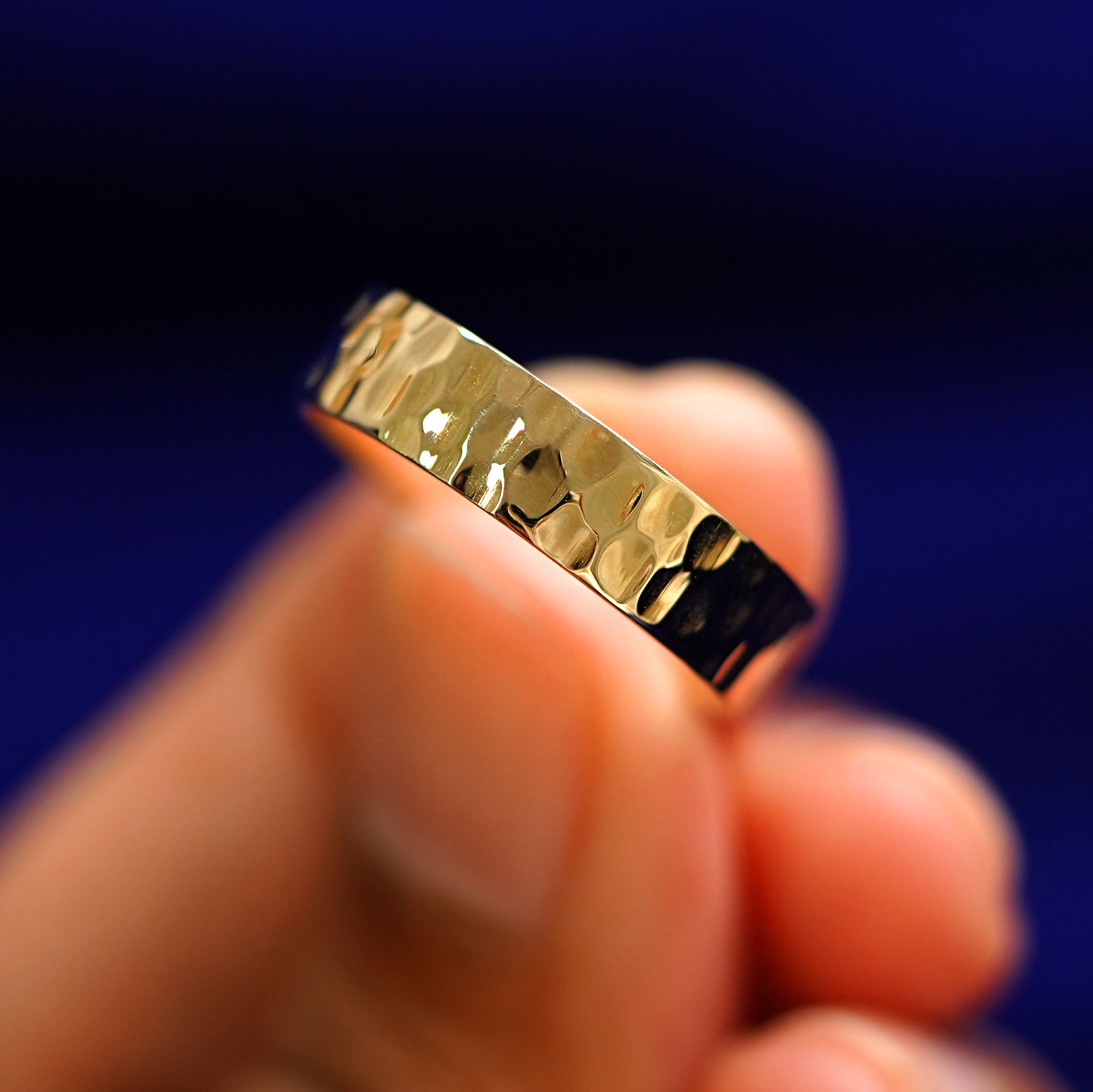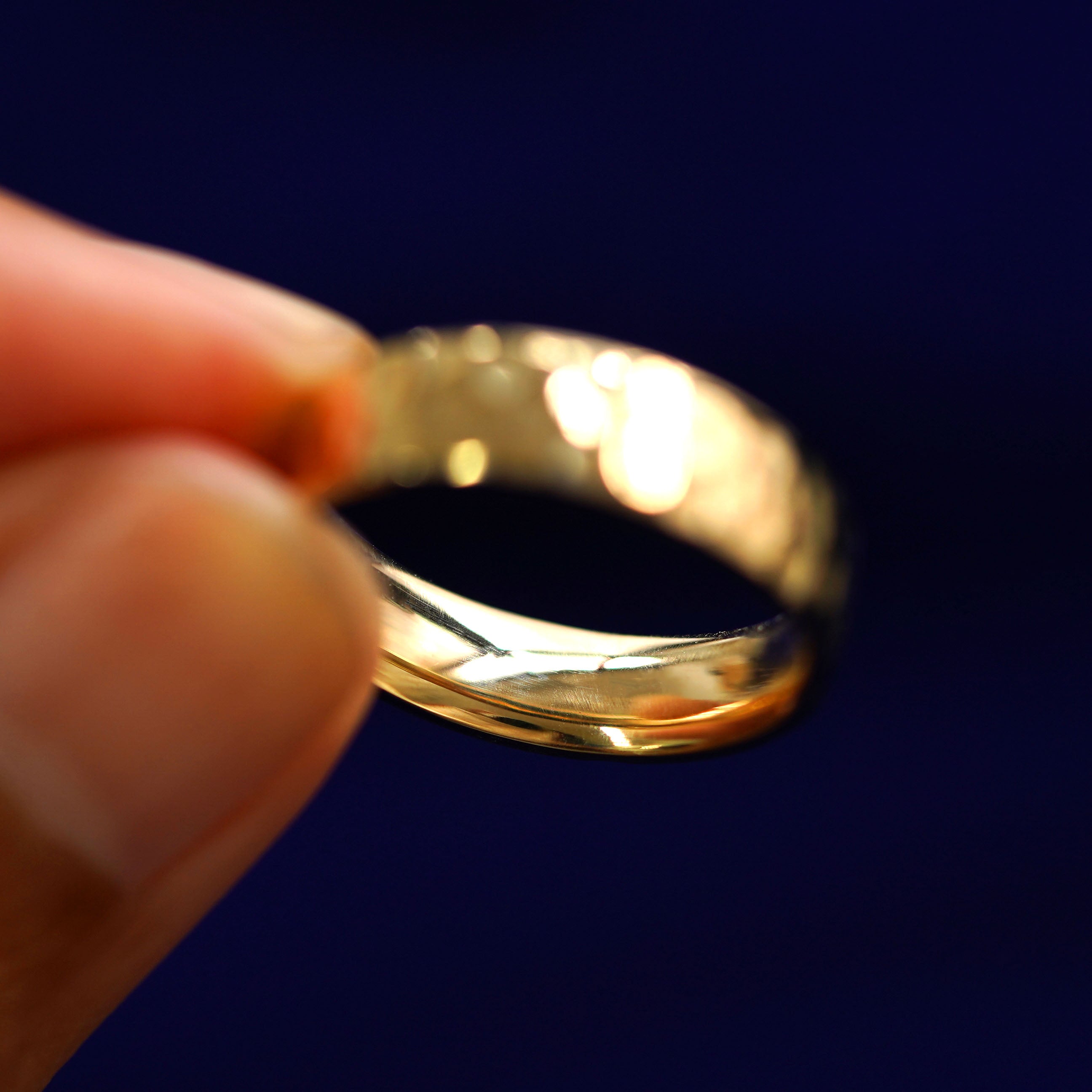 The hand-made artistry of this industrial band makes each wedding ring a one-of-a-kind work of art. The hammered pattern on the surface of this 14k solid gold ring makes it glimmer and glow and complements the nature of the gold beautifully. Androgynous jewelry ready to be your wedding band, stacking ring, thumb ring or anything your heart desires, no matter your gender expression.
