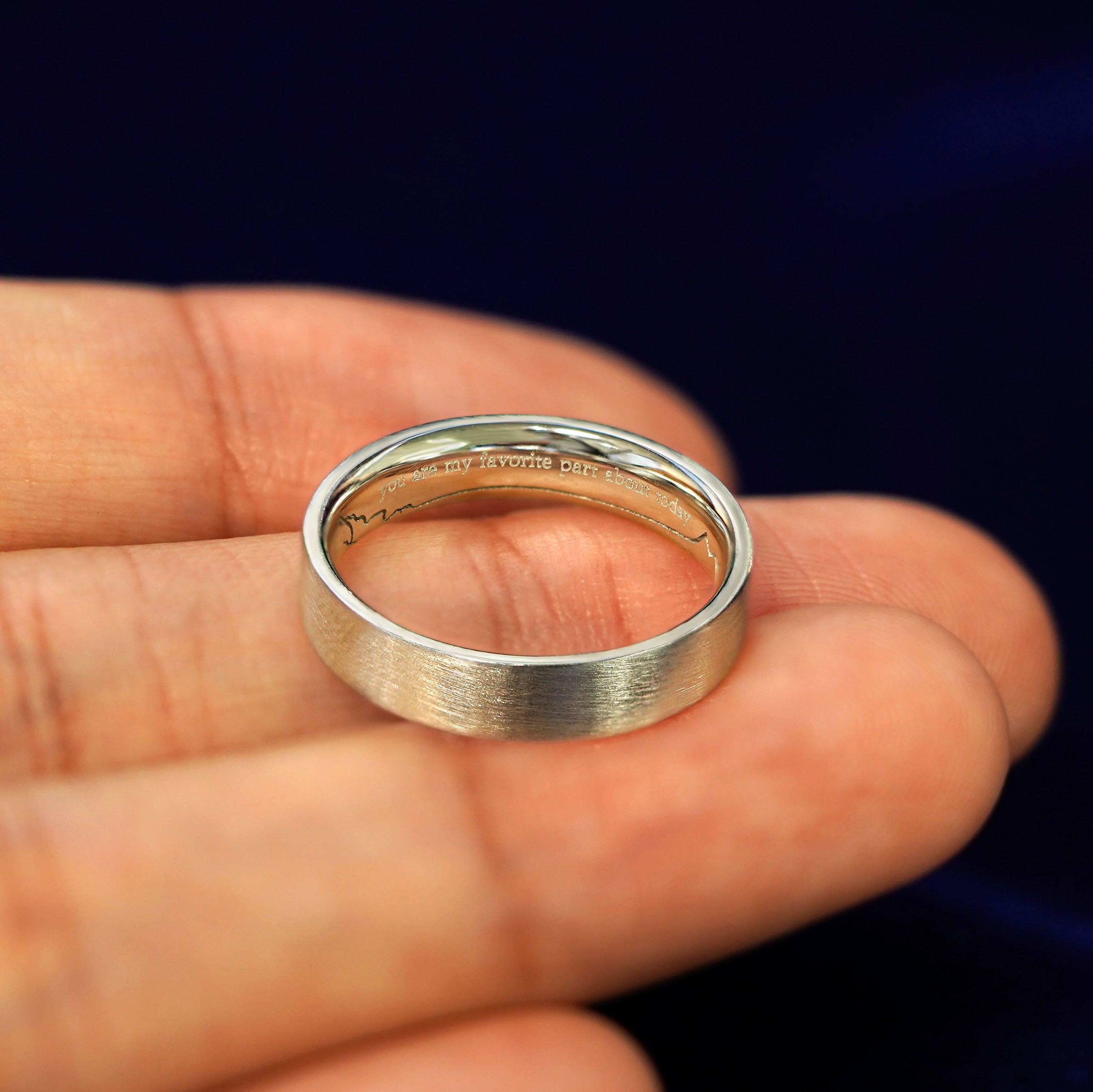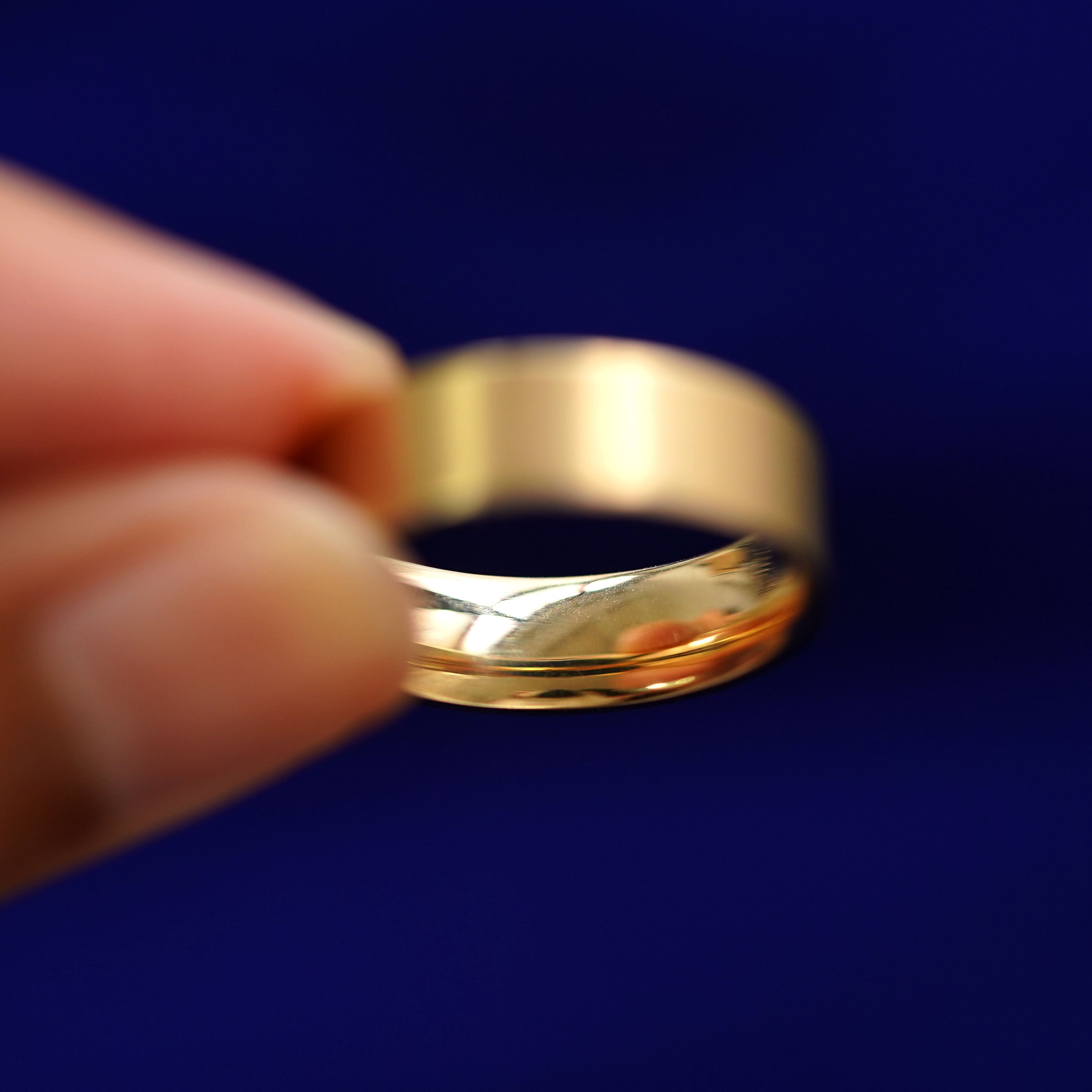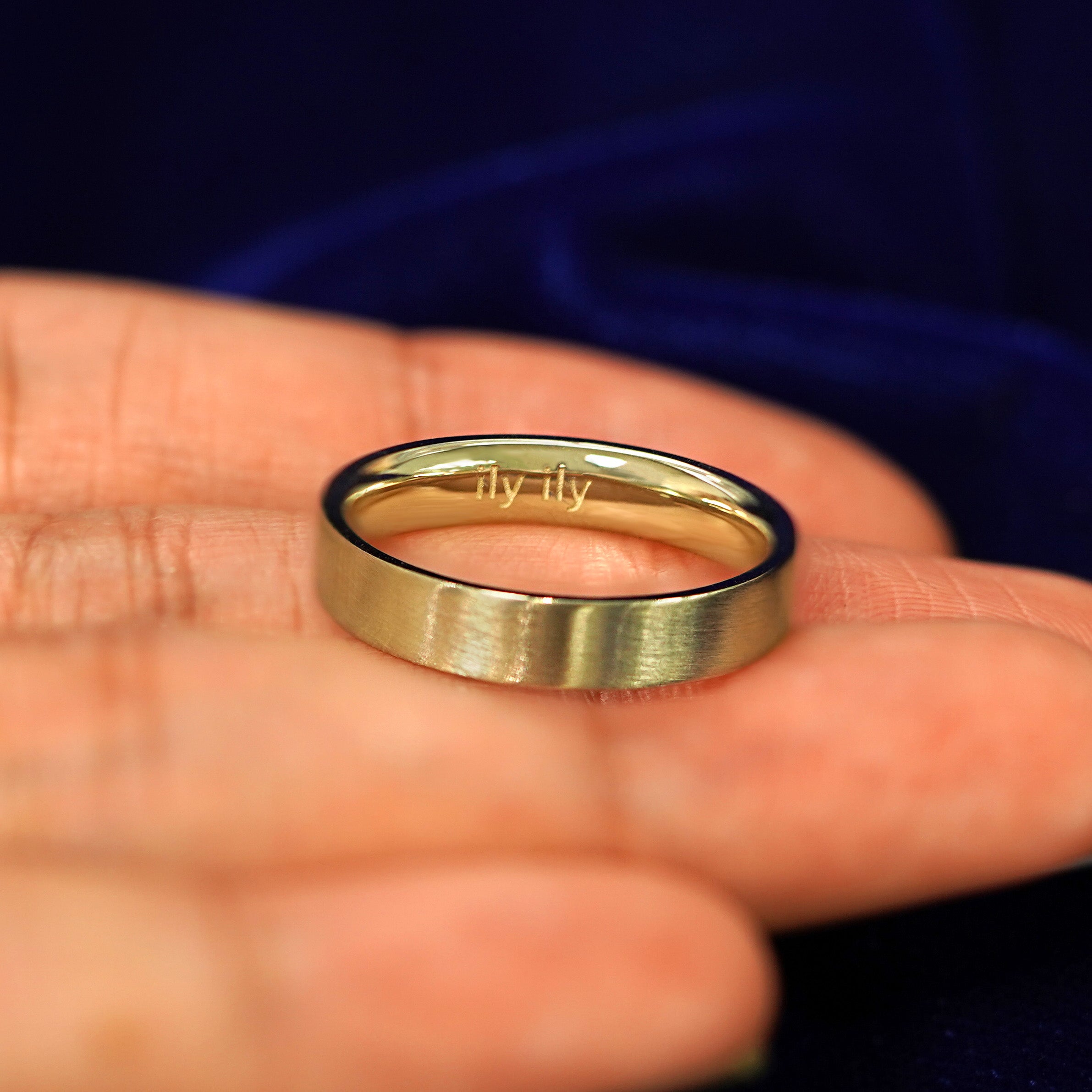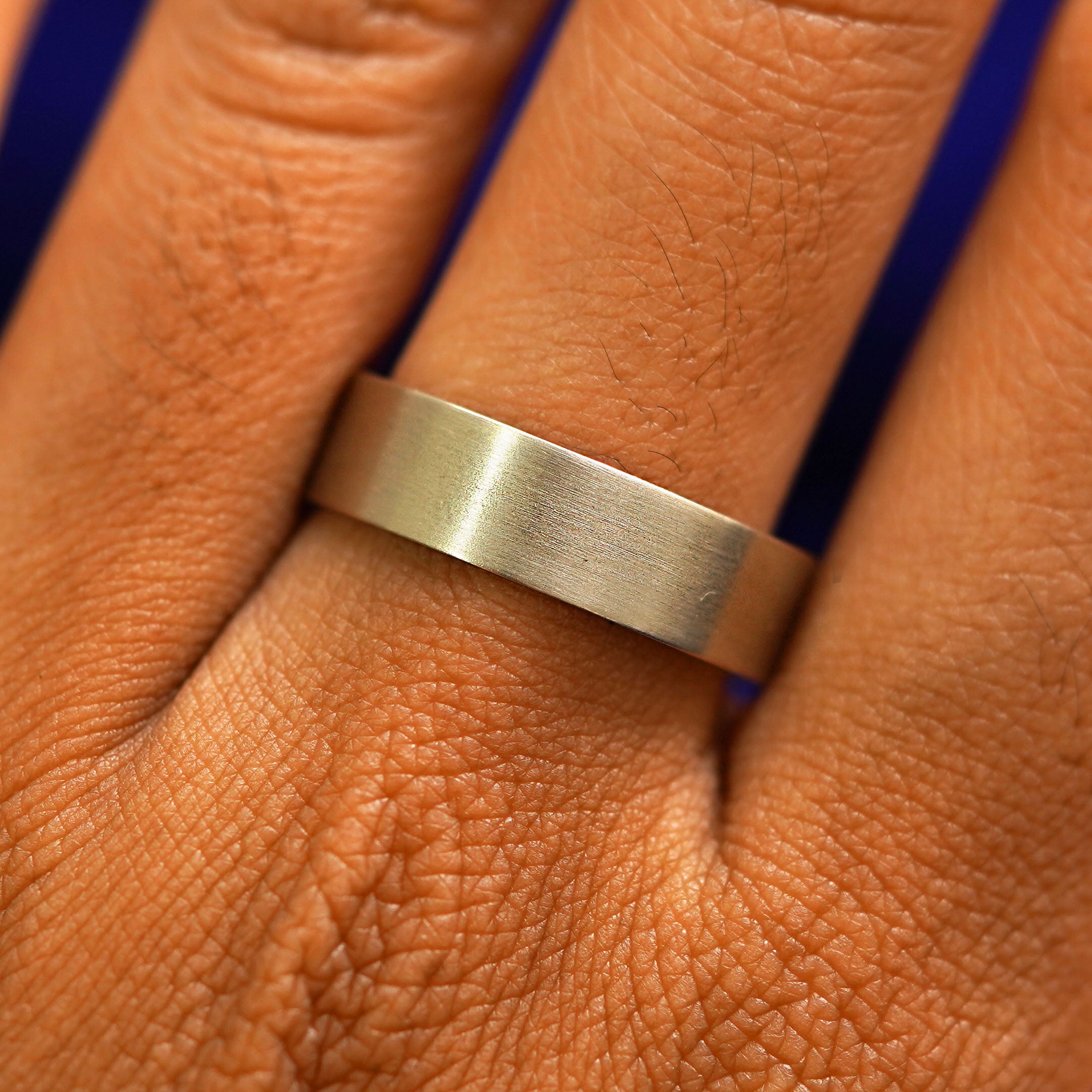 The matte finish of this industrial ring makes the 14k solid gold band glow with an even, subtle reflection. The flat profile of our matte ring makes it charmingly hypnotizing. Hand-made in NYC, this 14 karat gold beauty is an absolutely perfect wedding band for your gender non-conforming, femme, or masc partner.