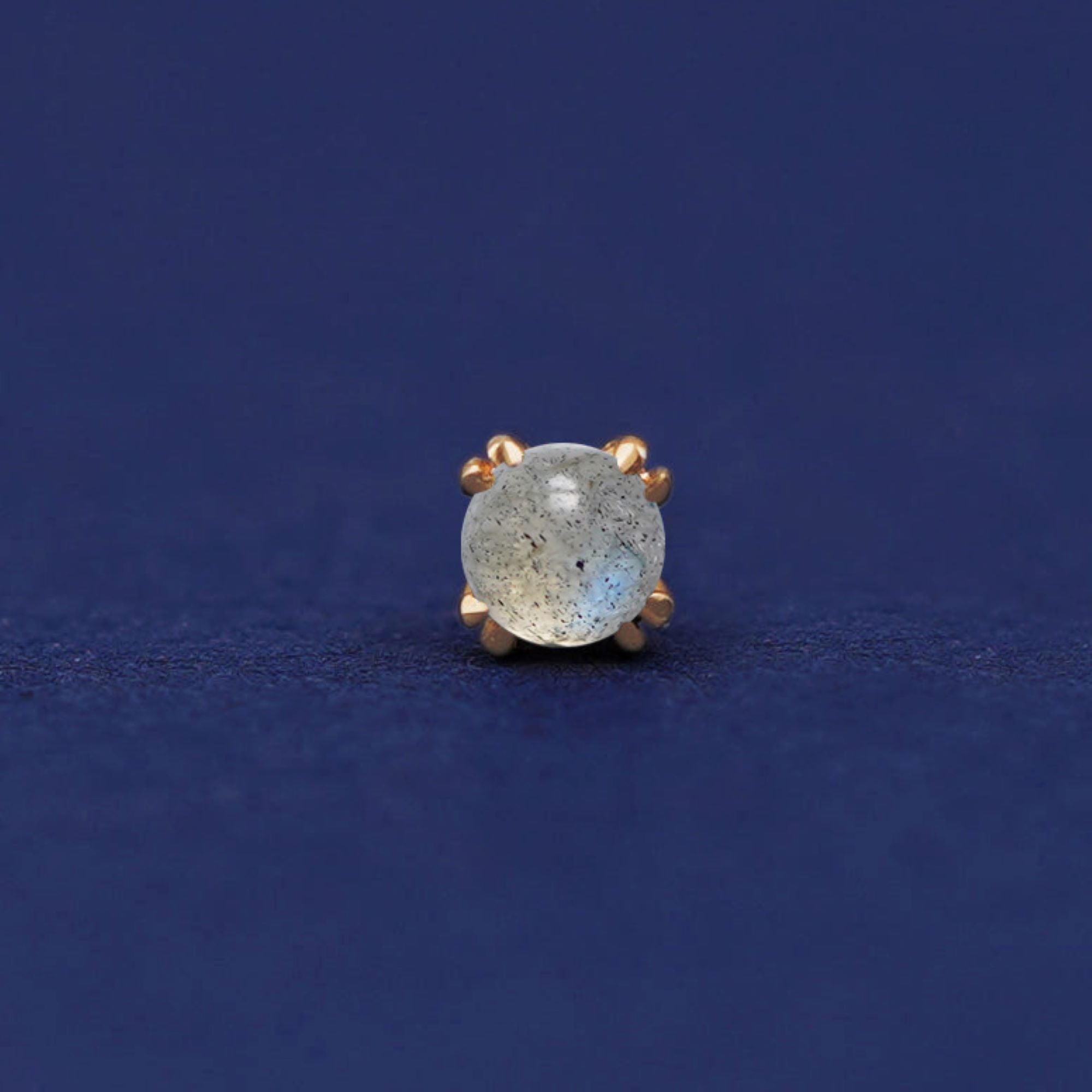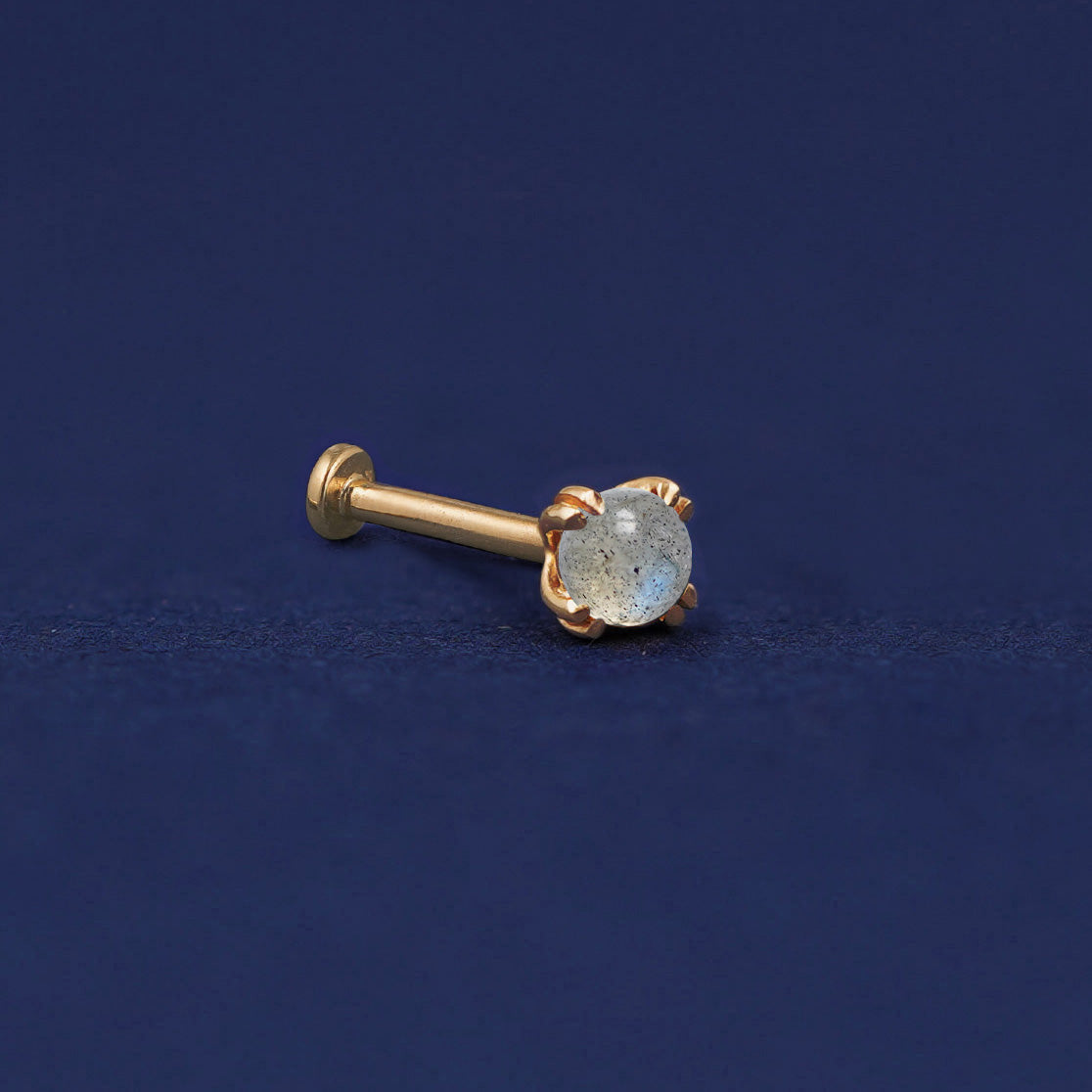 This fascinating gemstone flatback is made with recycled solid 14k gold. Known for its iridescent shimmering effect, our threadless labradorite push-in stud is the perfect little piece to give any of your piercings the attention it deserves.