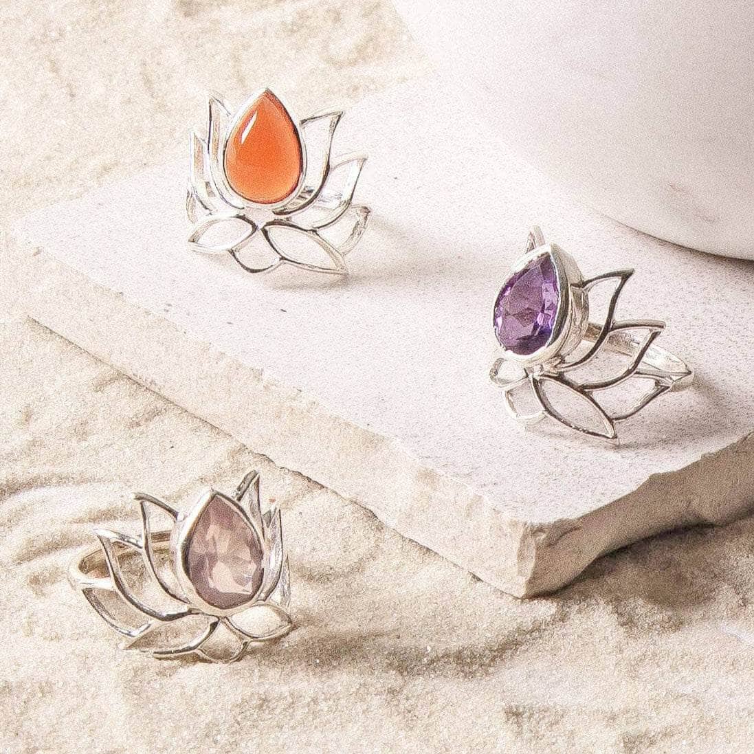 Delicate but powerful, our lotus gemstone rings combine the sacred lotus flower with the powerful values of the gemstones.
