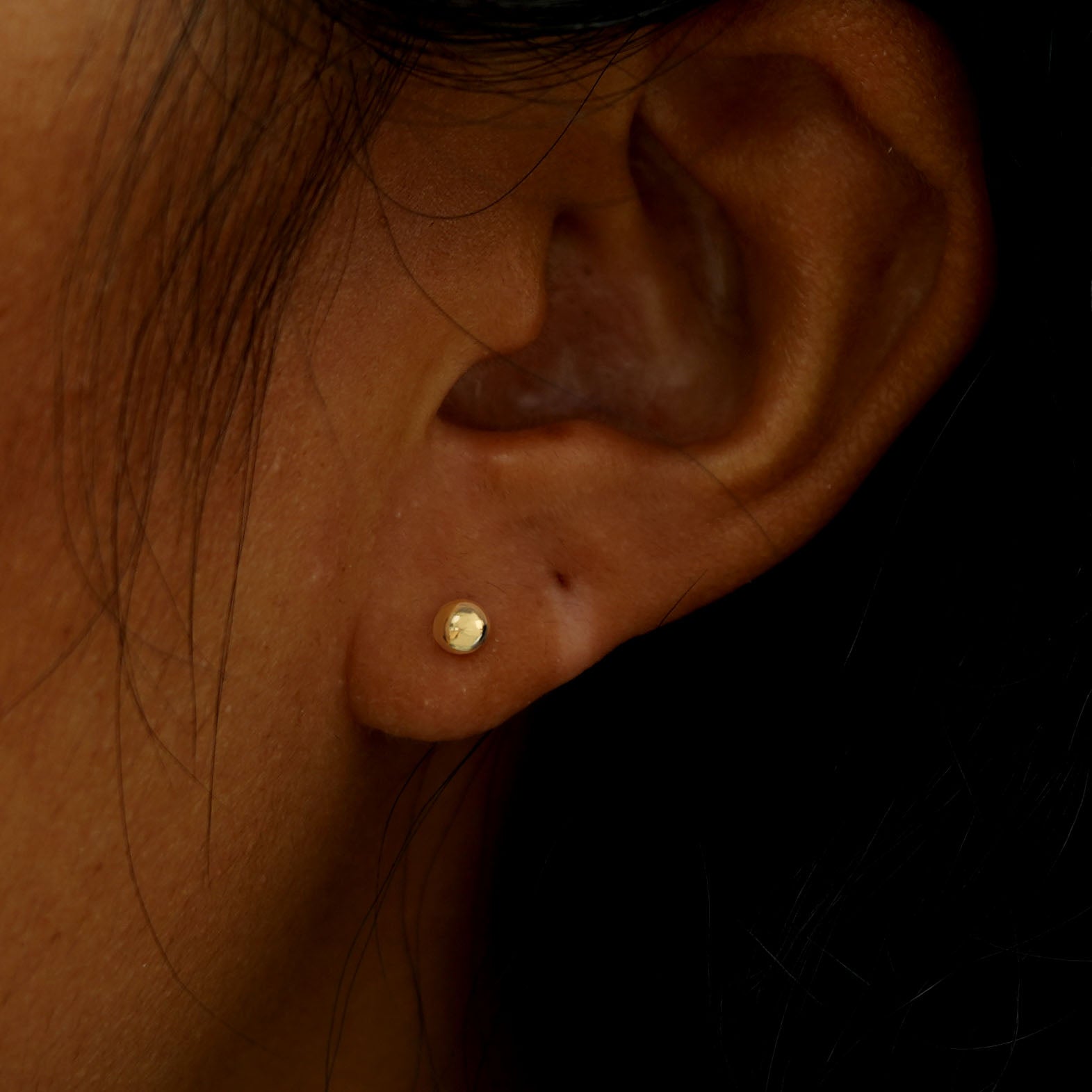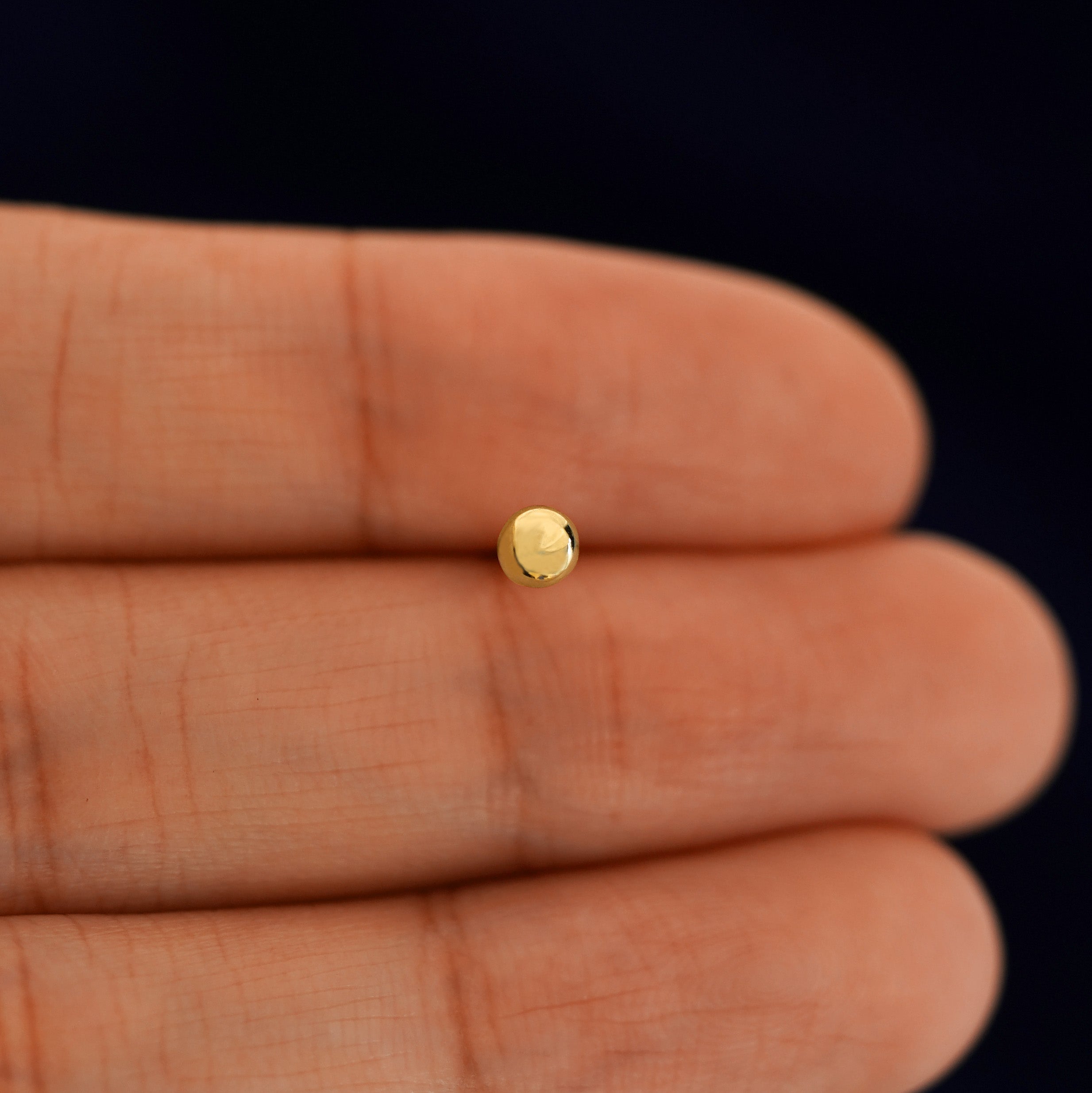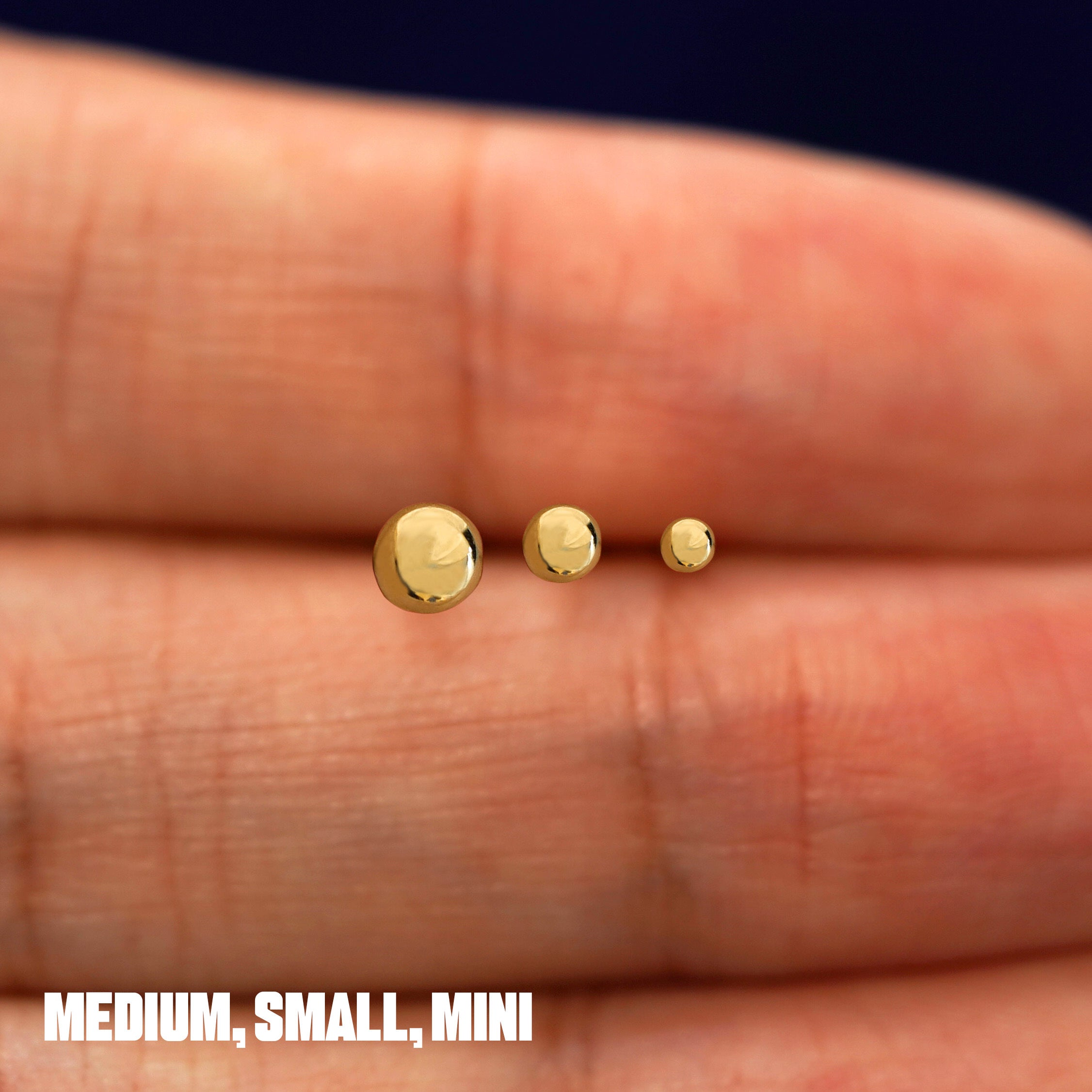 Solid, sturdy, and simple, this medium ball flatback is the perfect minimalist earring. Crafted from solid 14k gold these push in studs won’t dent, so you can wear them to sleep, shower, or workout in. Great for a cartilage, tragus, labret or other types of piercings.