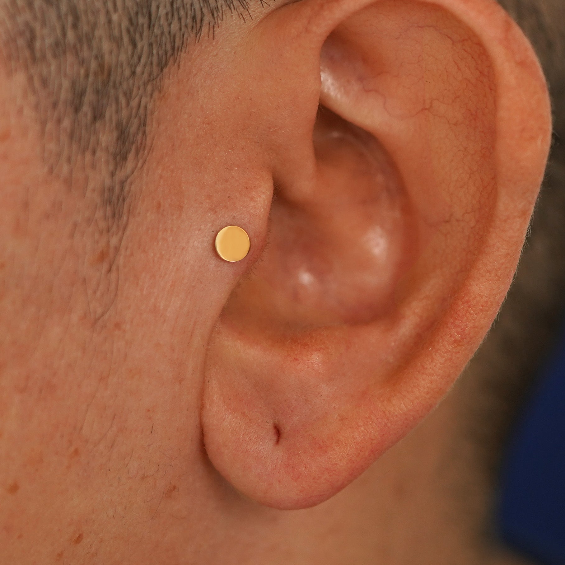 Our dainty circle stud is designed to be flat and thick for the perfect fit. Combined with our 14k solid gold flat back this threadless push in stud earring is an incredibly comfortable body jewelry piece. Our flatbacks are crafted only in 14k yellow gold to avoid sensitivity.