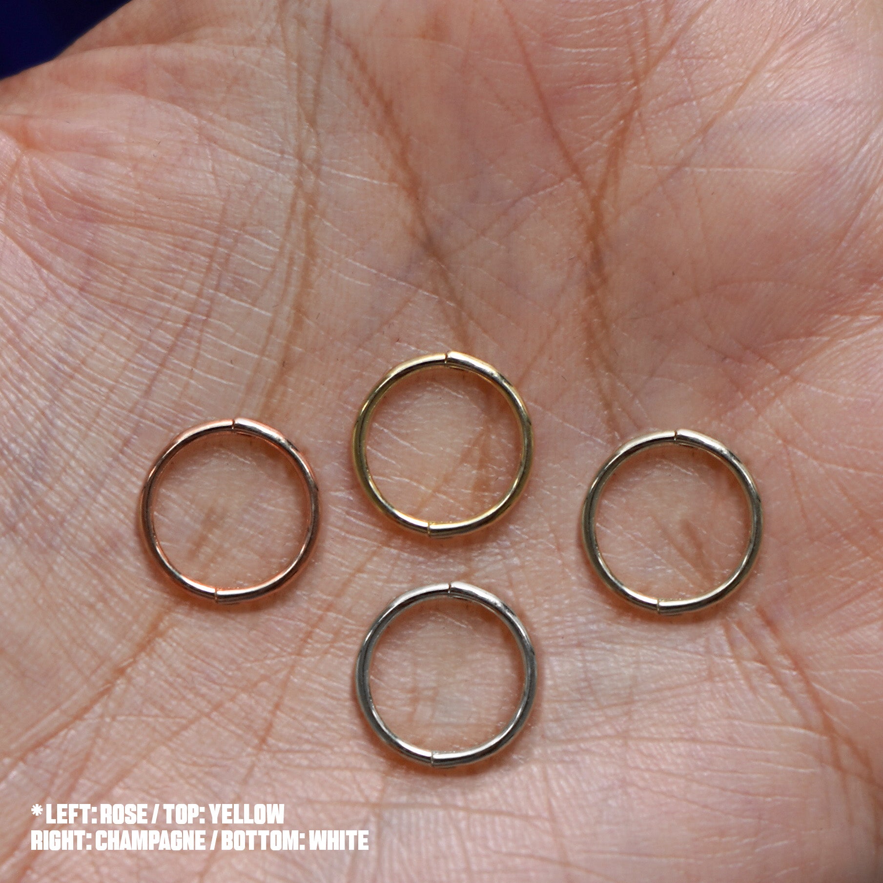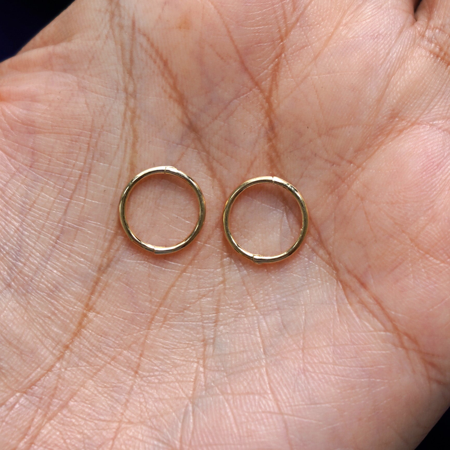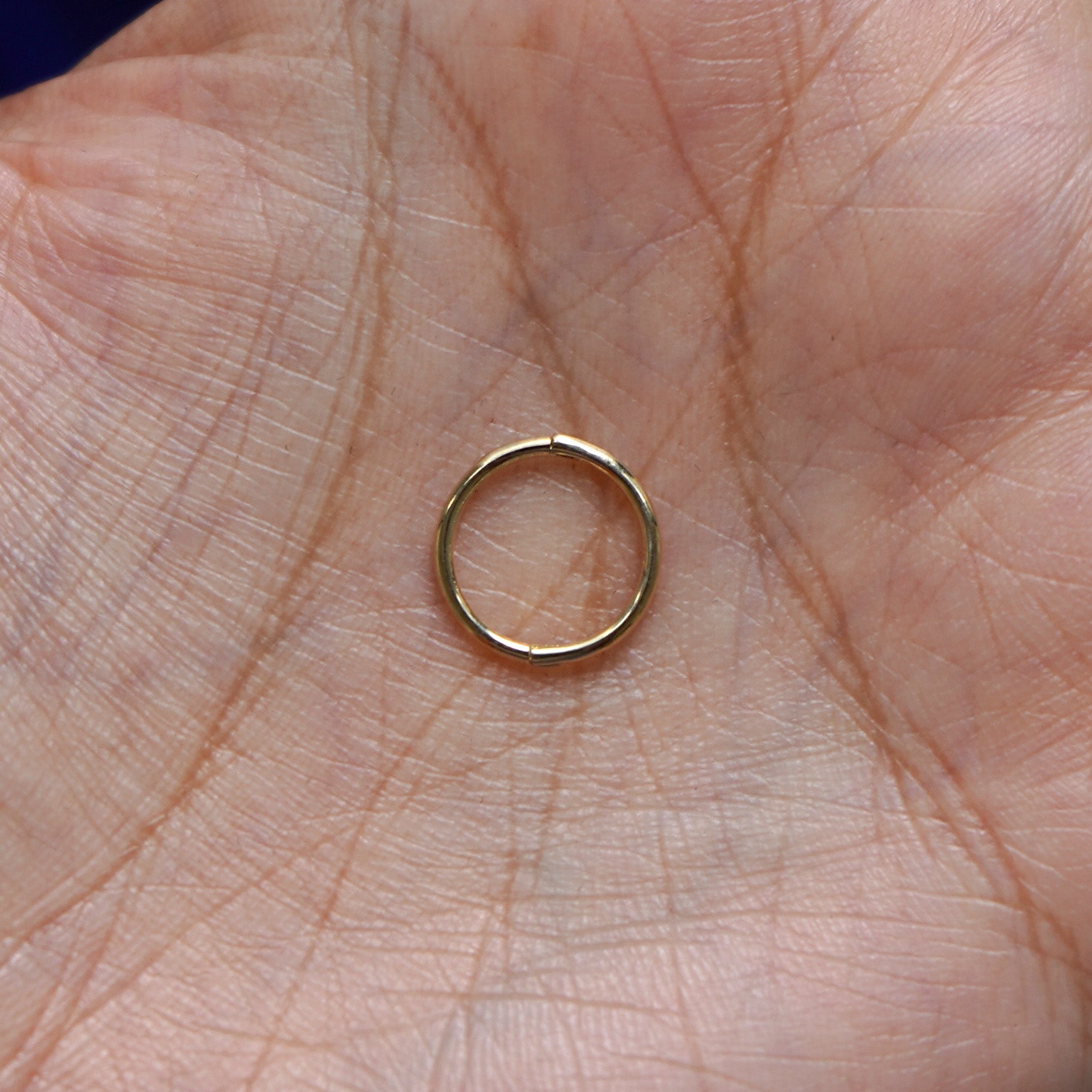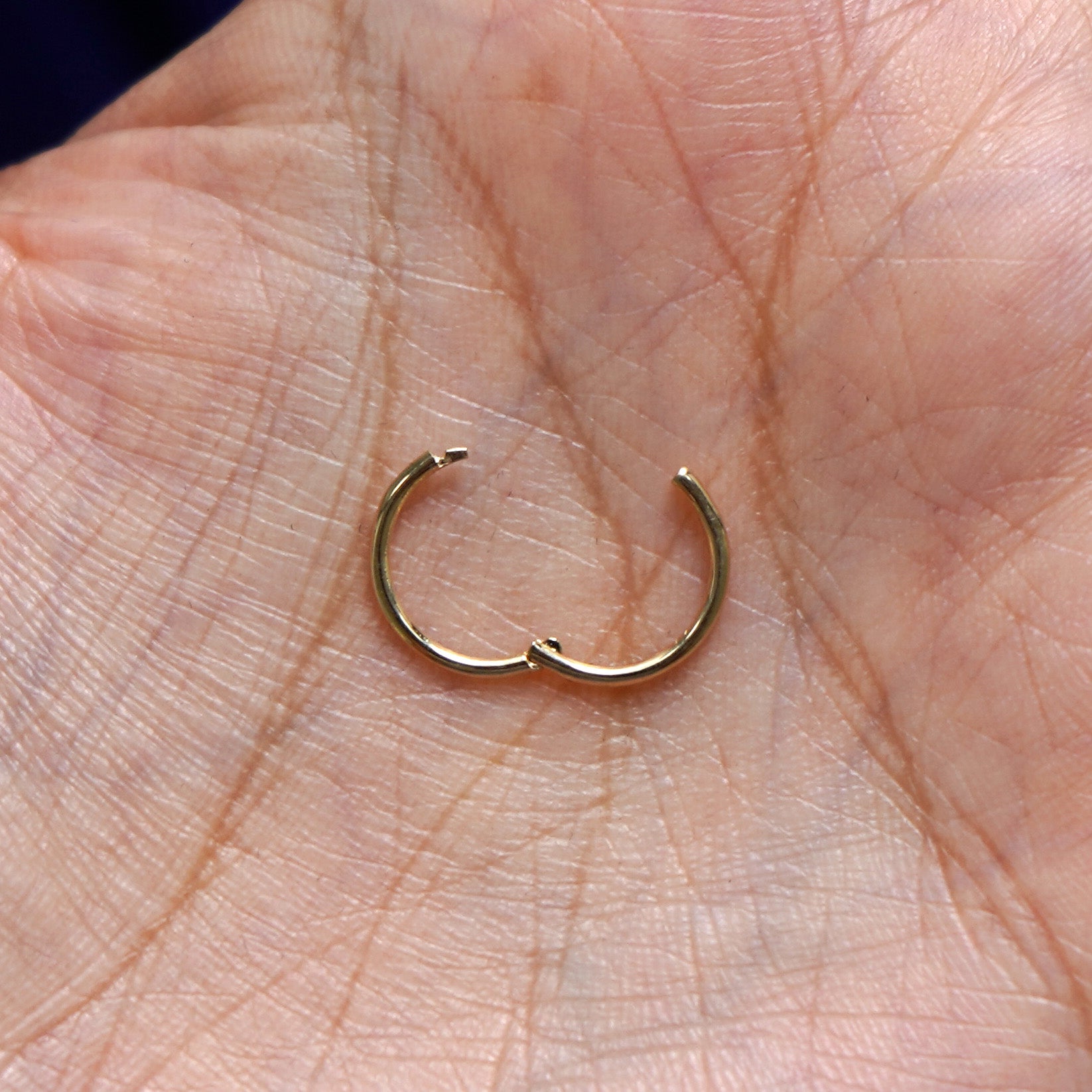 These medium gold clicker hoop earrings are perfectly smooth all around, you won’t even notice you’re wearing them. Close these tiny hoops with a click and wear them with everything. These 18 gauge hoops are perfect for your tragus, helix, conch, nose, septum, nips, belly, or anywhere else you want to wear these 14k solid gold huggies!