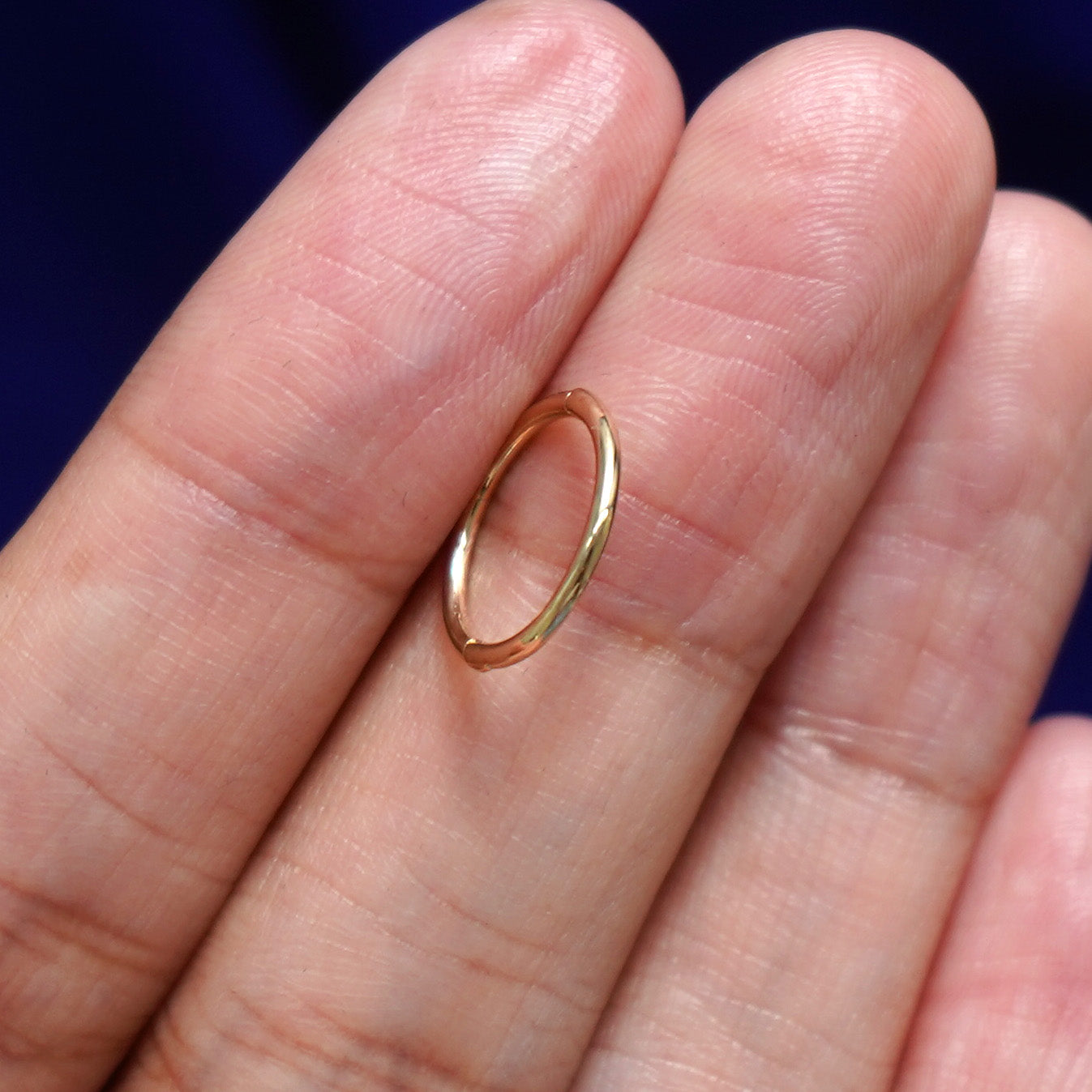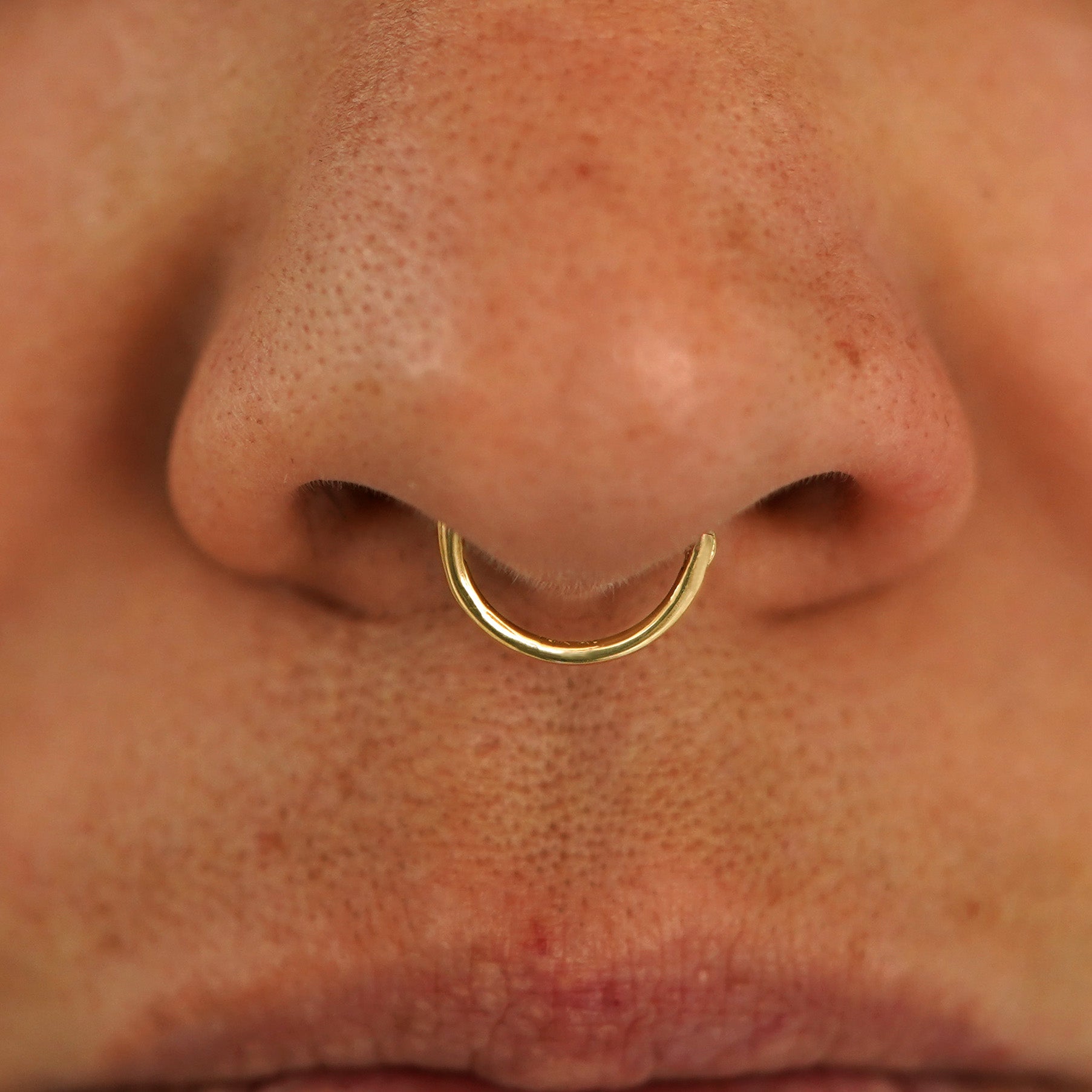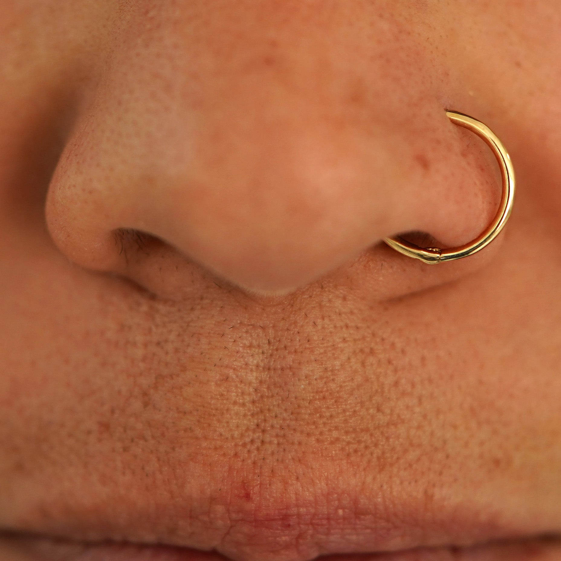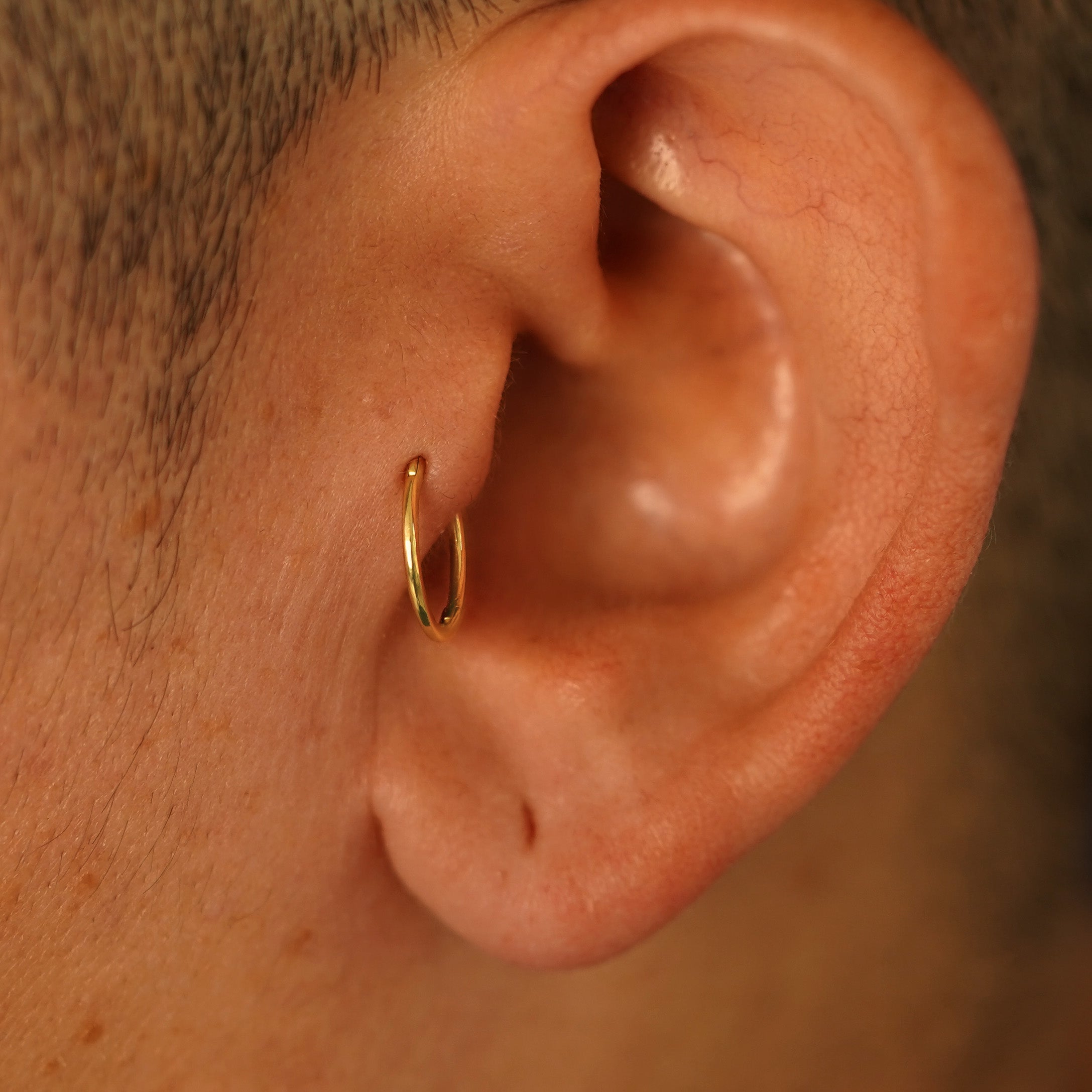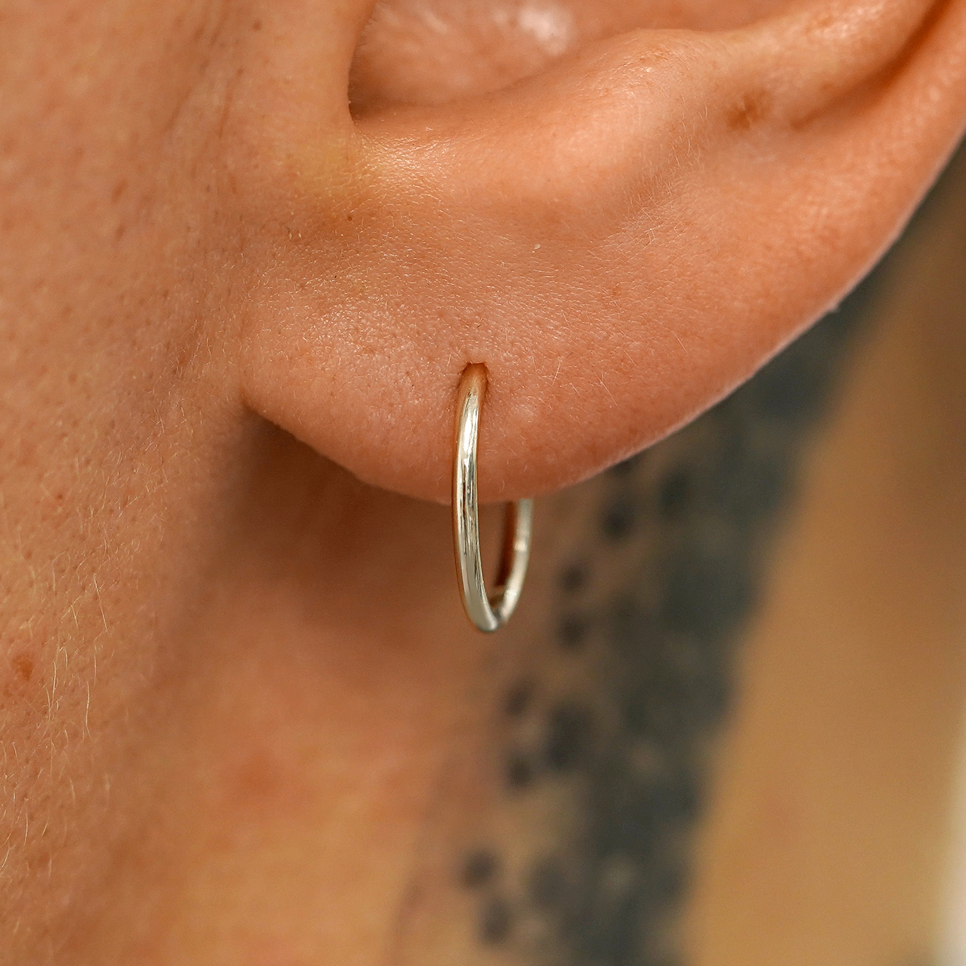 These medium gold clicker hoop earrings are perfectly smooth all around, you won’t even notice you’re wearing them. Close these tiny hoops with a click and wear them with everything. These 18 gauge hoops are perfect for your tragus, helix, conch, nose, septum, nips, belly, or anywhere else you want to wear these 14k solid gold huggies!