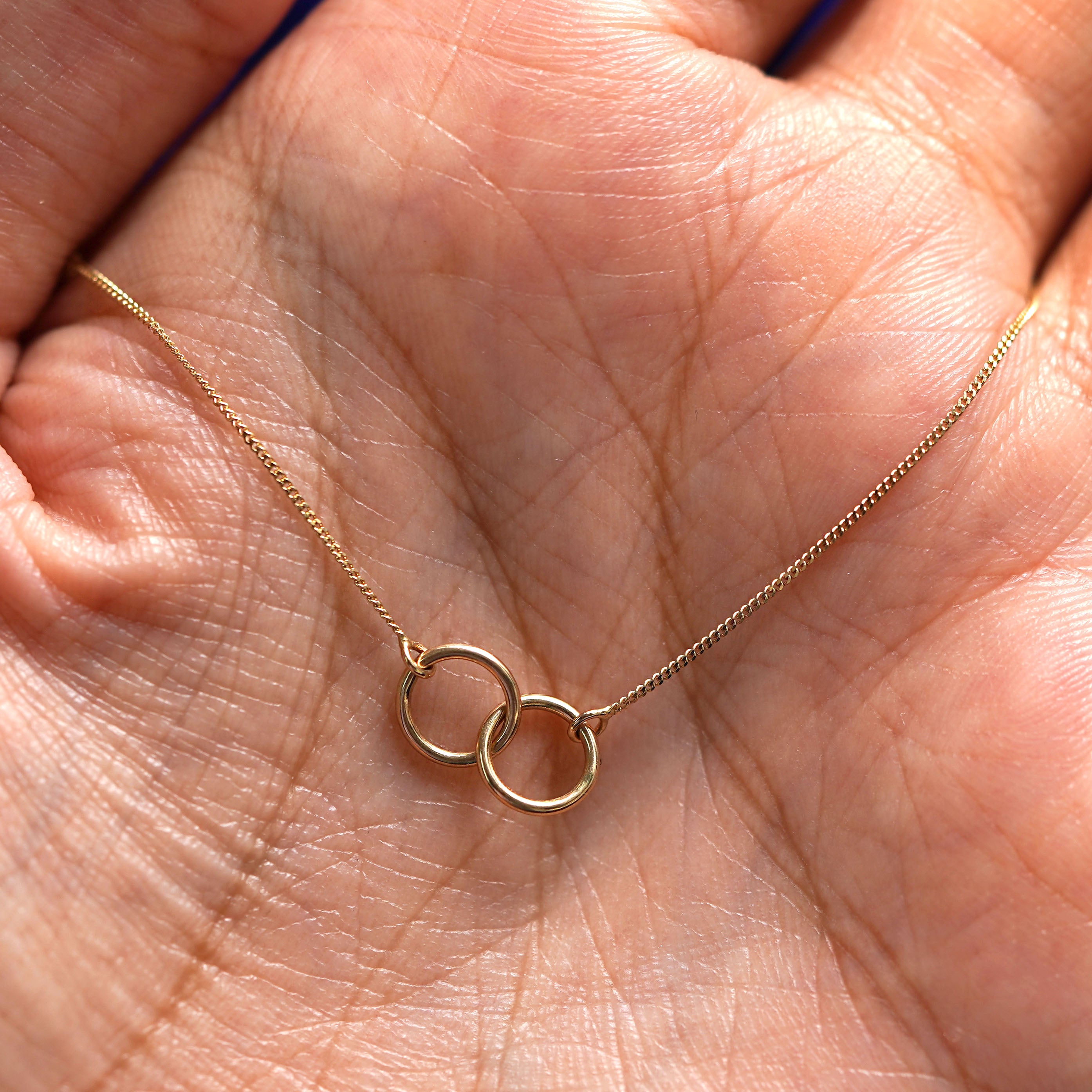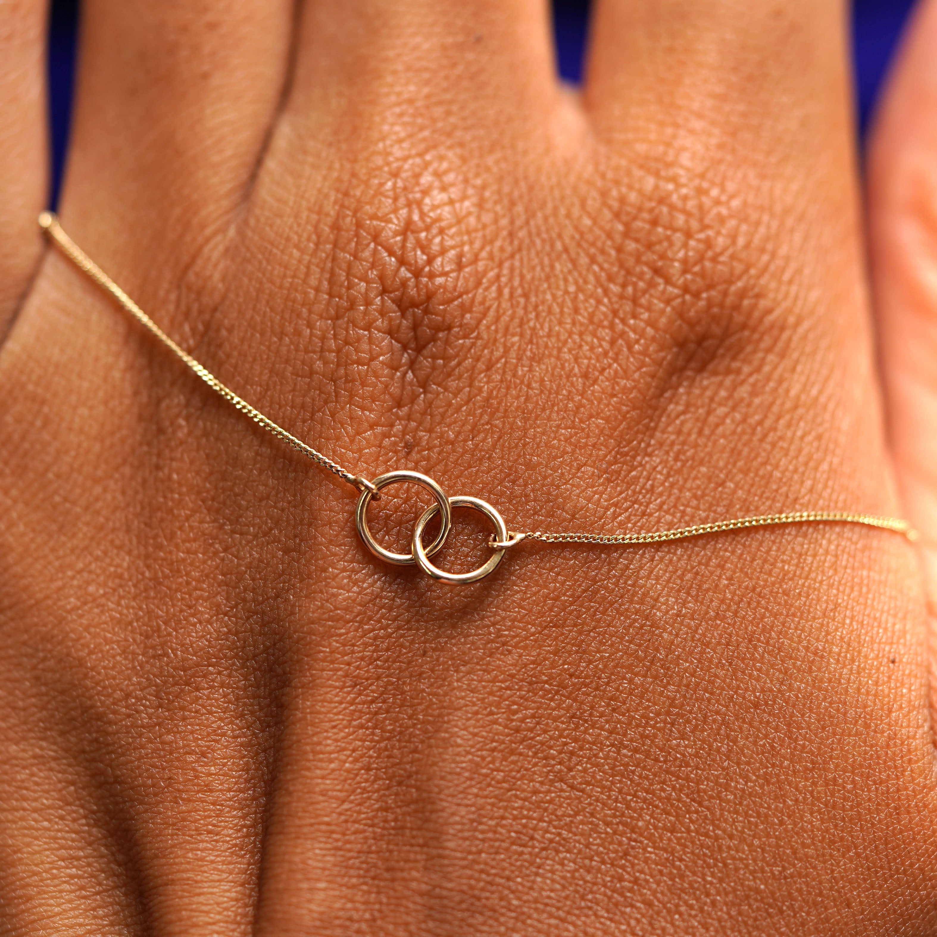 Beautiful and bold, this mini bound together bracelet is classic jewelry with a modern twist. The two interlocking circles connect to our light and strong Essential Chain, making this 14k solid gold bracelet both comfortable and stylish. Wear this dainty circle bracelet with everything- it’s so lightweight and subtle, you'll forget it's there. Secures with a lobster lock and easy-to-grip Automic Gold AU plate.